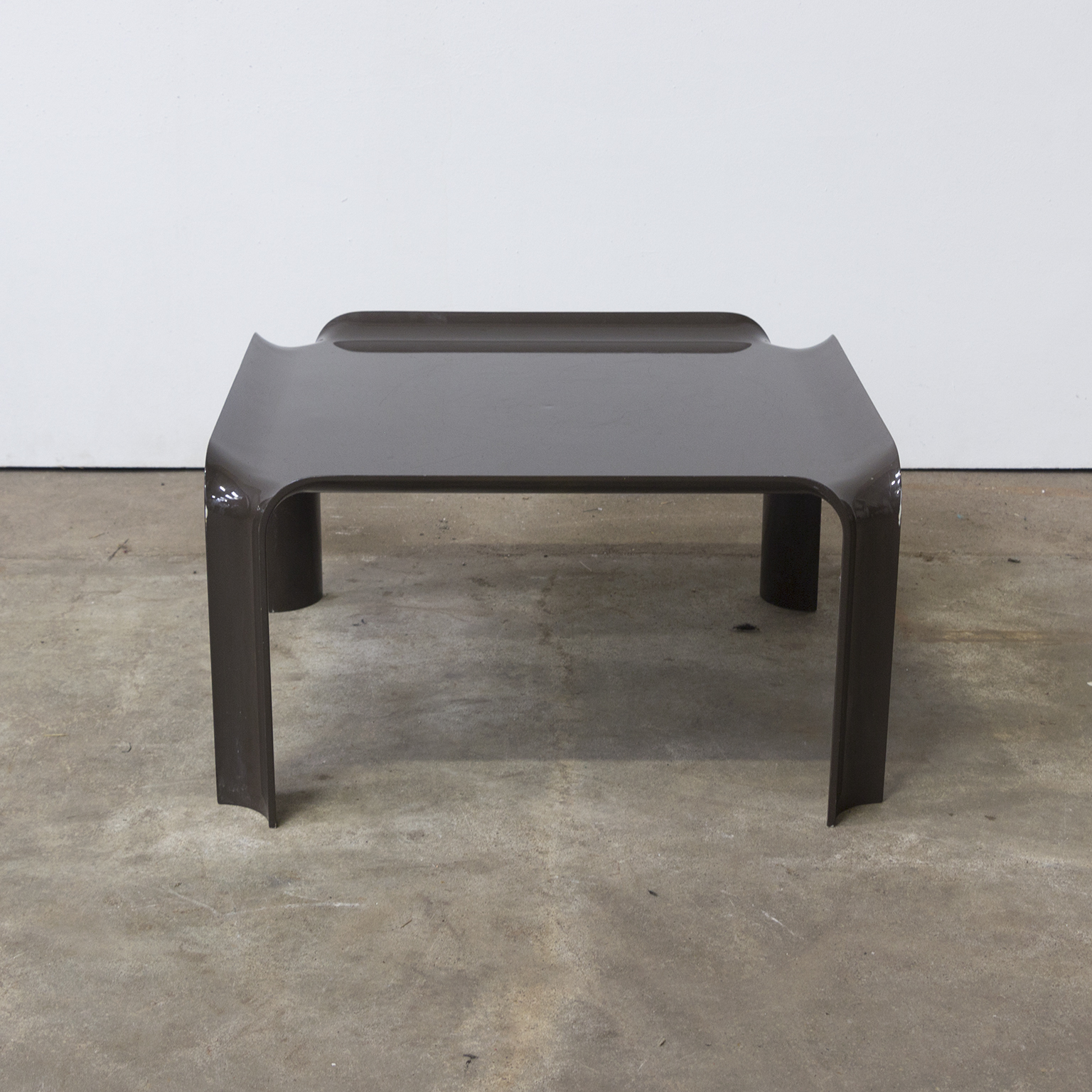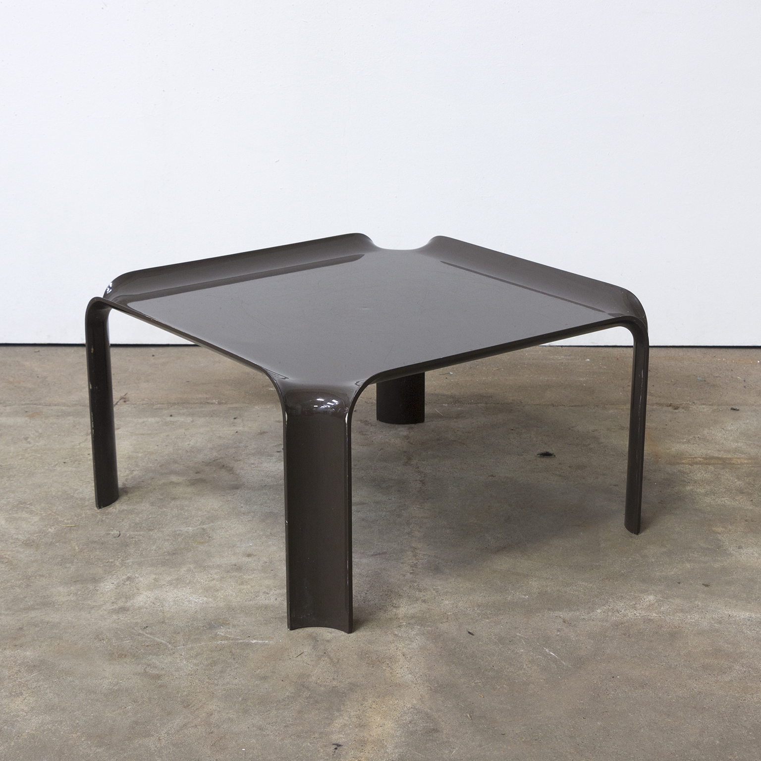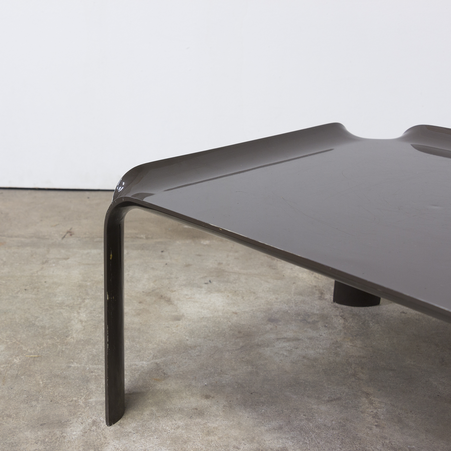 Side table in brown. Has traces of wear like some scratches on top (picture #5) and some loss of paint (see picture #6 and #7). Stackable in two ways (see picture #9 and #10).