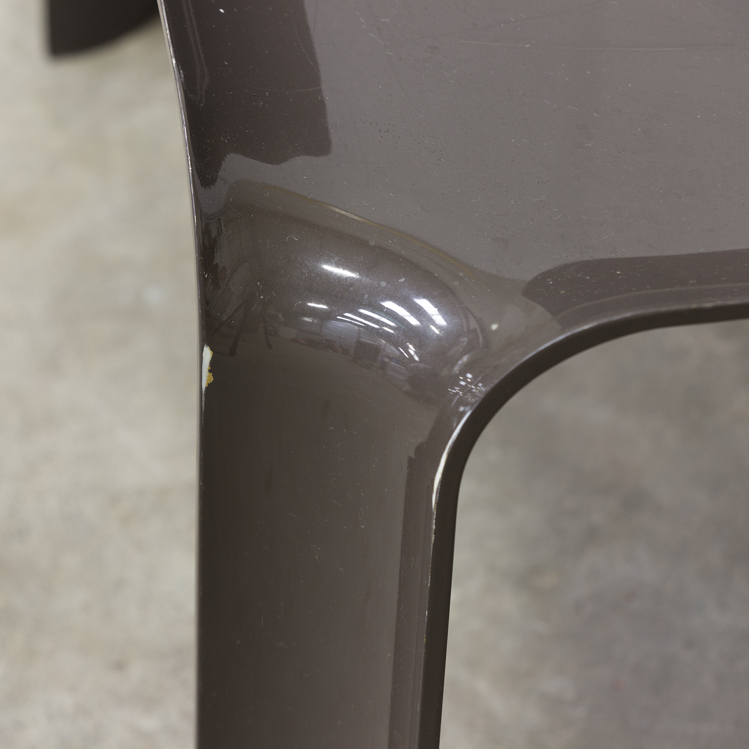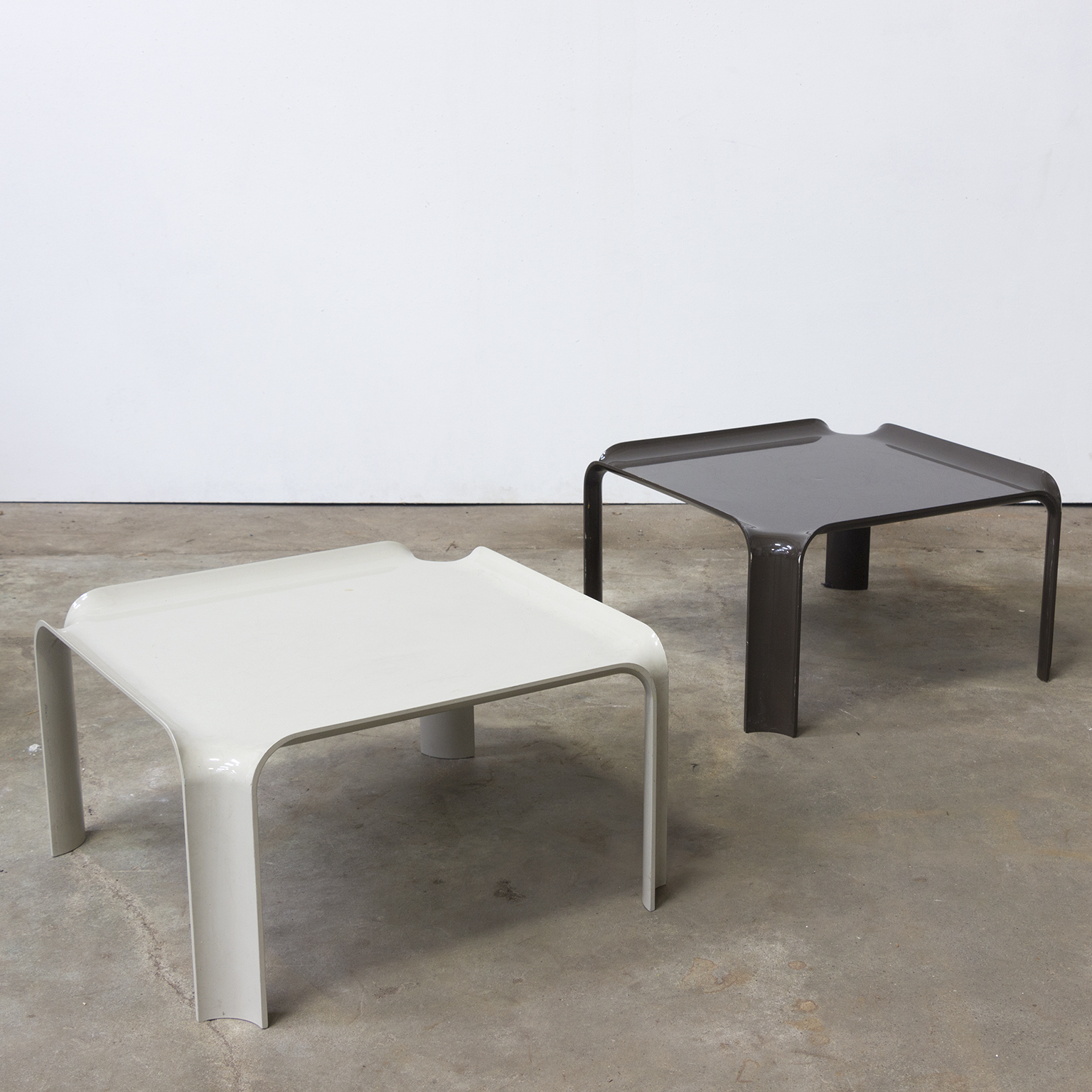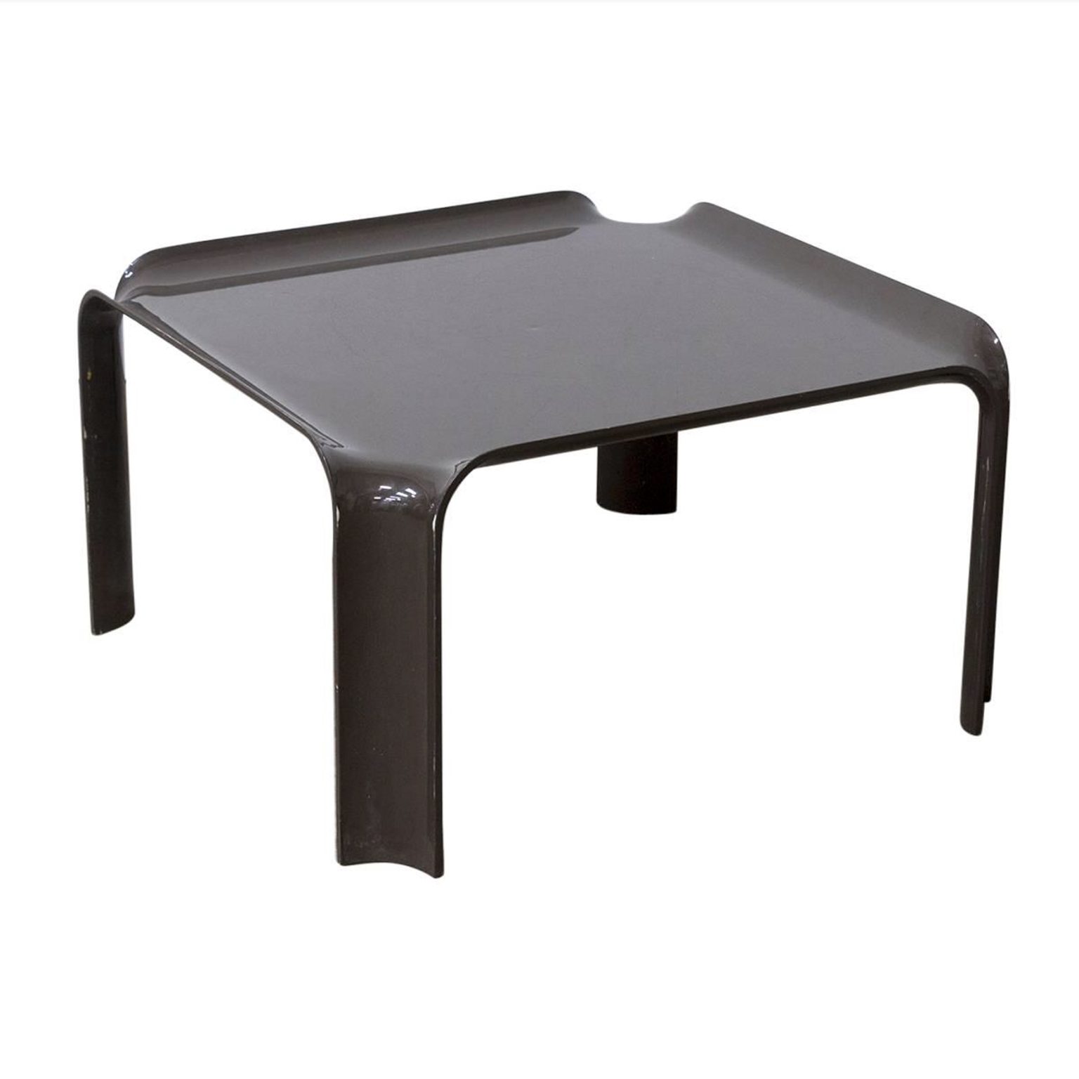 Side table in brown. Has traces of wear like some scratches on top (picture #5) and some loss of paint (see picture #6 and #7). Stackable in two ways (see picture #9 and #10).