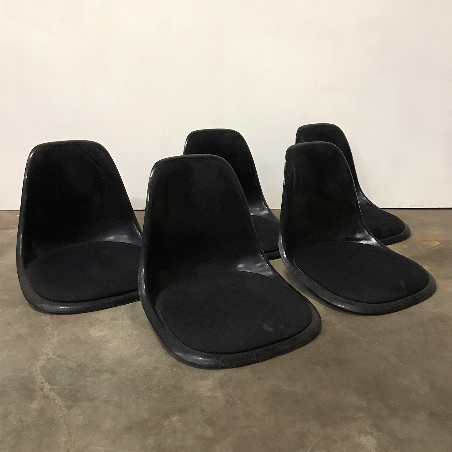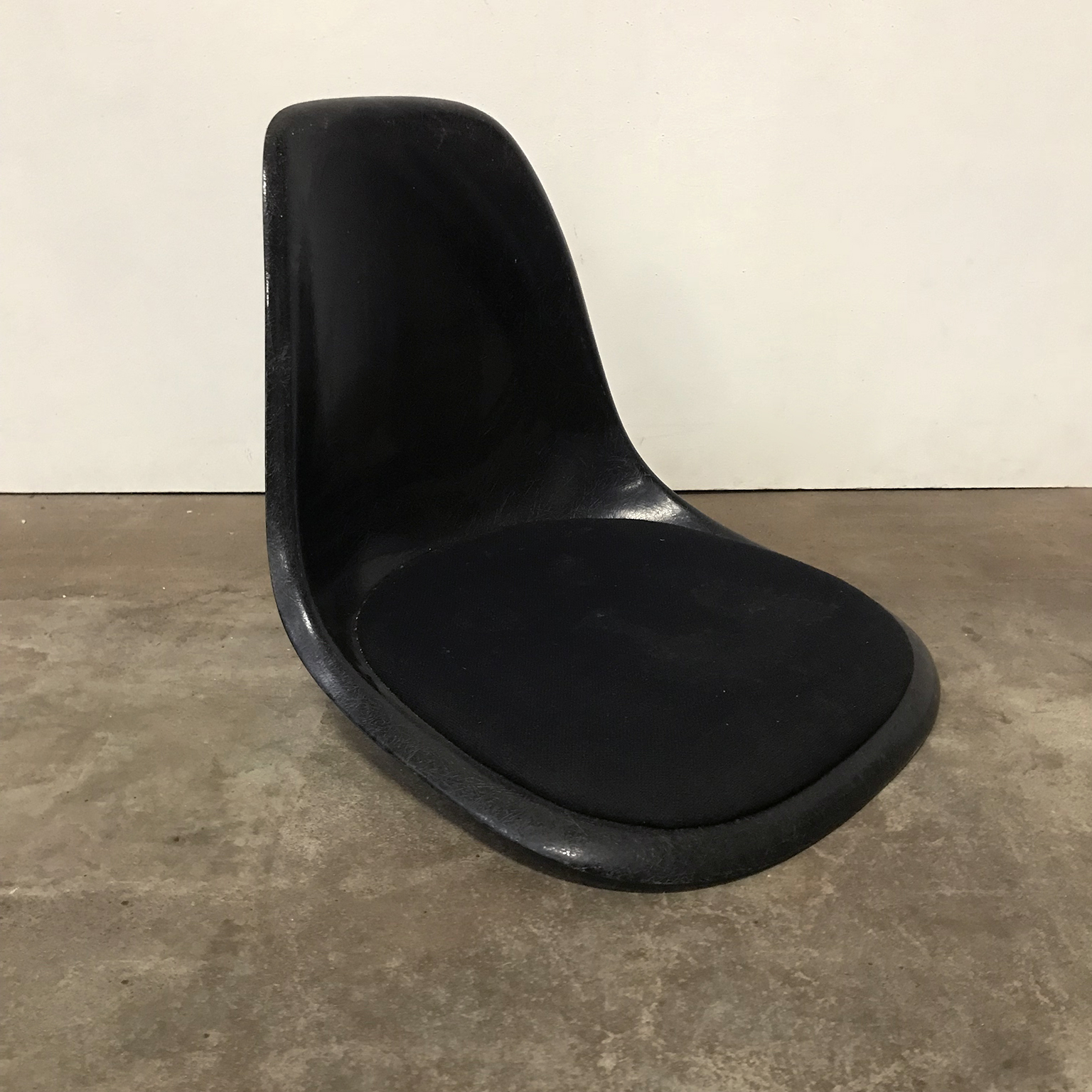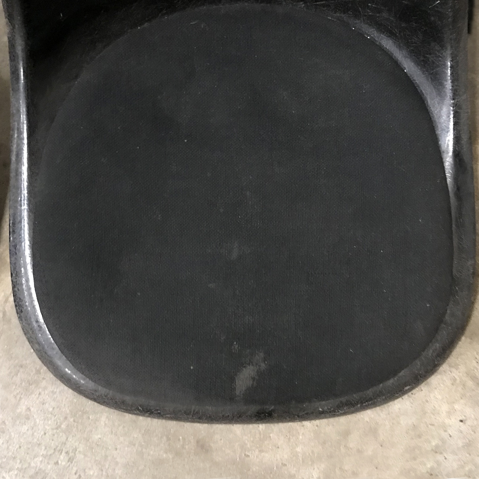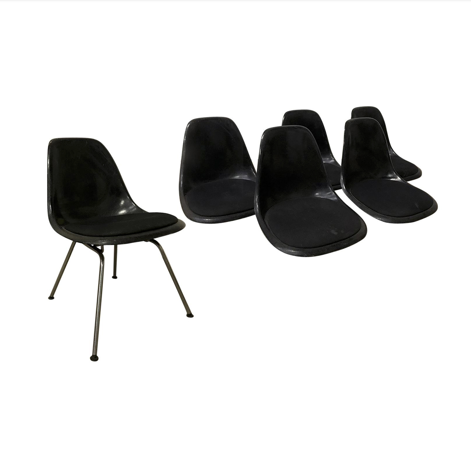 Eames side shells in black with black cushion by Herman Miller. Availability of six shells. The shells show traces of wear like some stains on the cushion and some on the shells. The picture show the shell on an H-base. Also other bases are available.