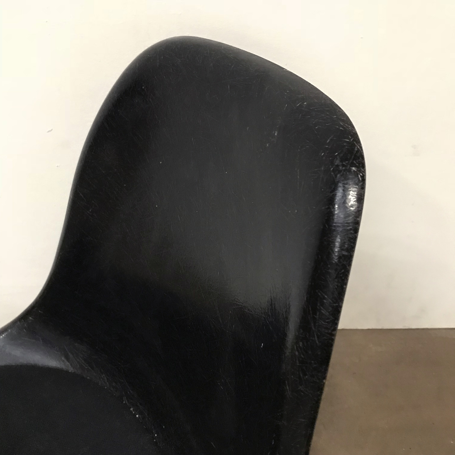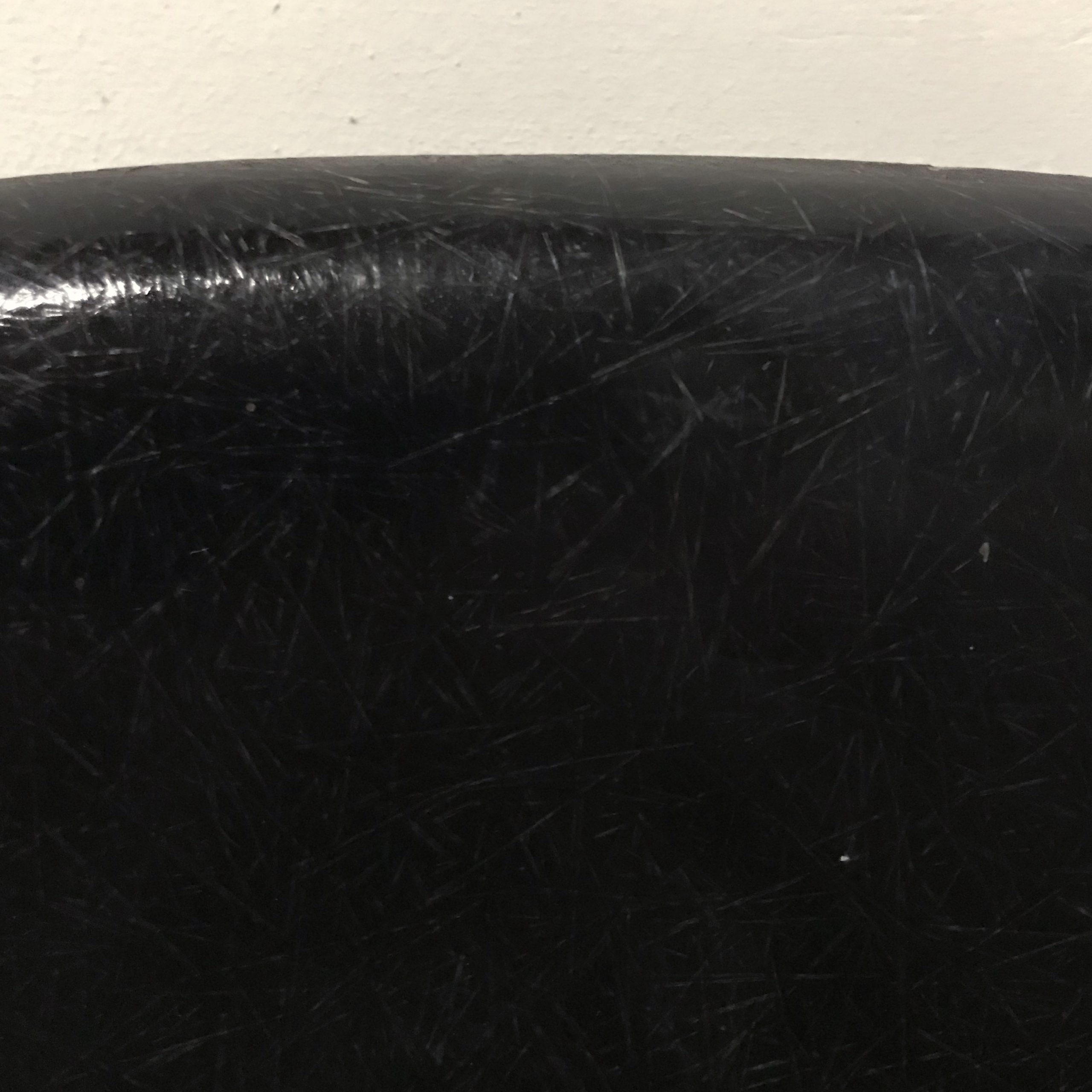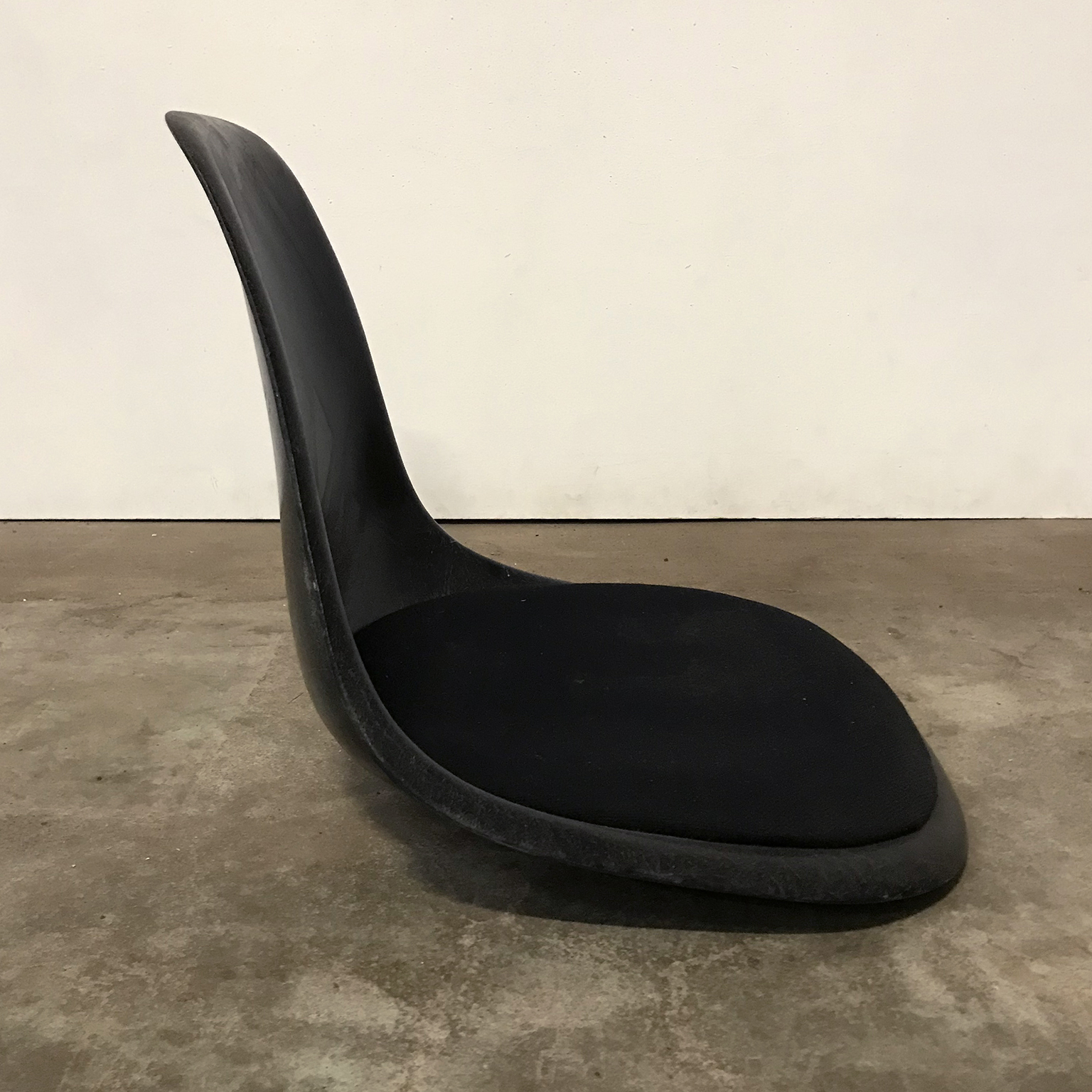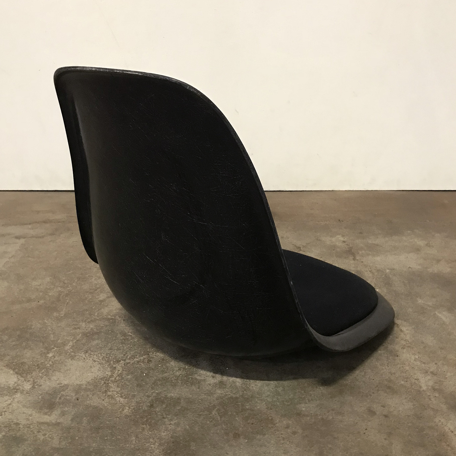 Eames side shells in black with black cushion by Herman Miller. Availability of six shells. The shells show traces of wear like some stains on the cushion and some on the shells. The picture show the shell on an H-base. Also other bases are available.