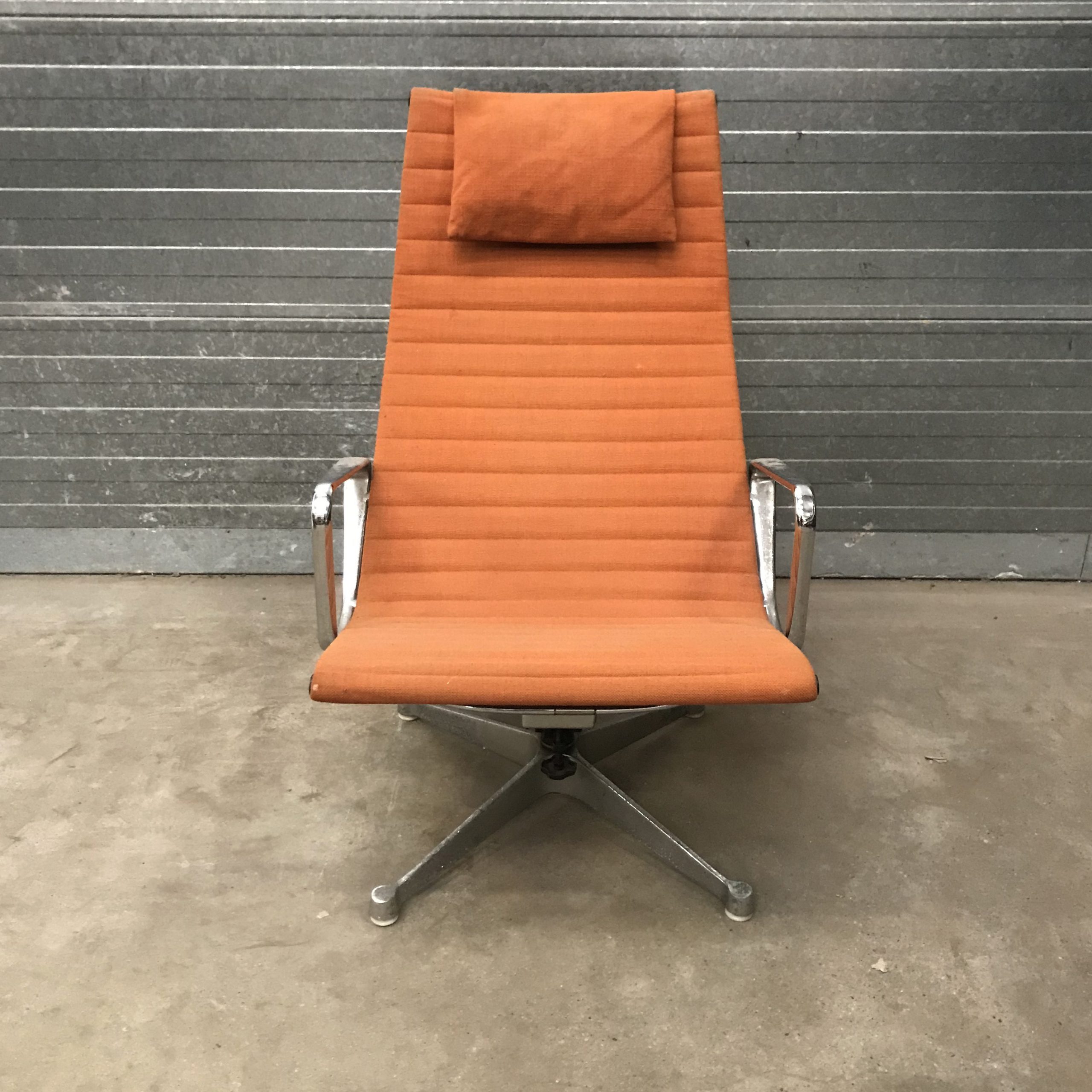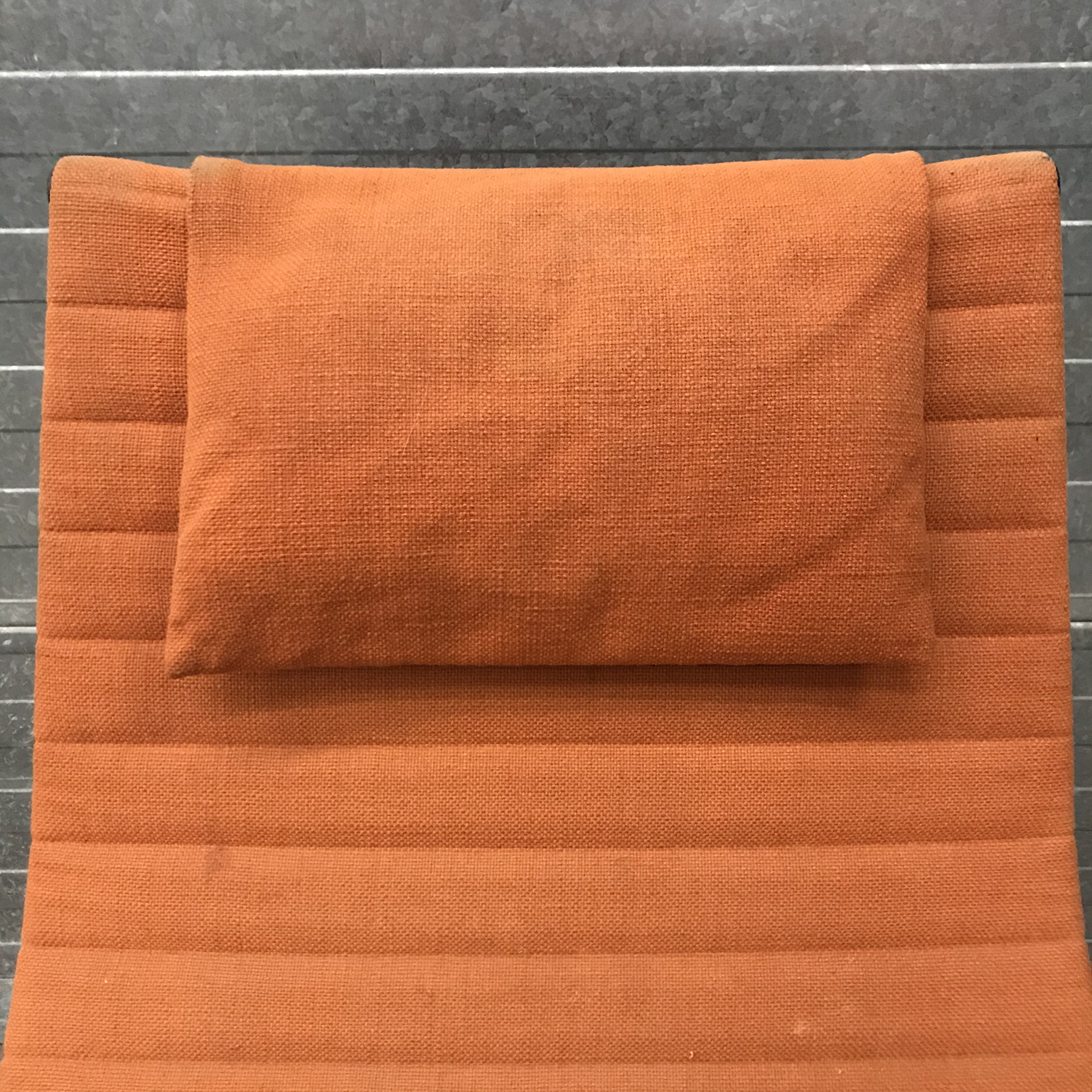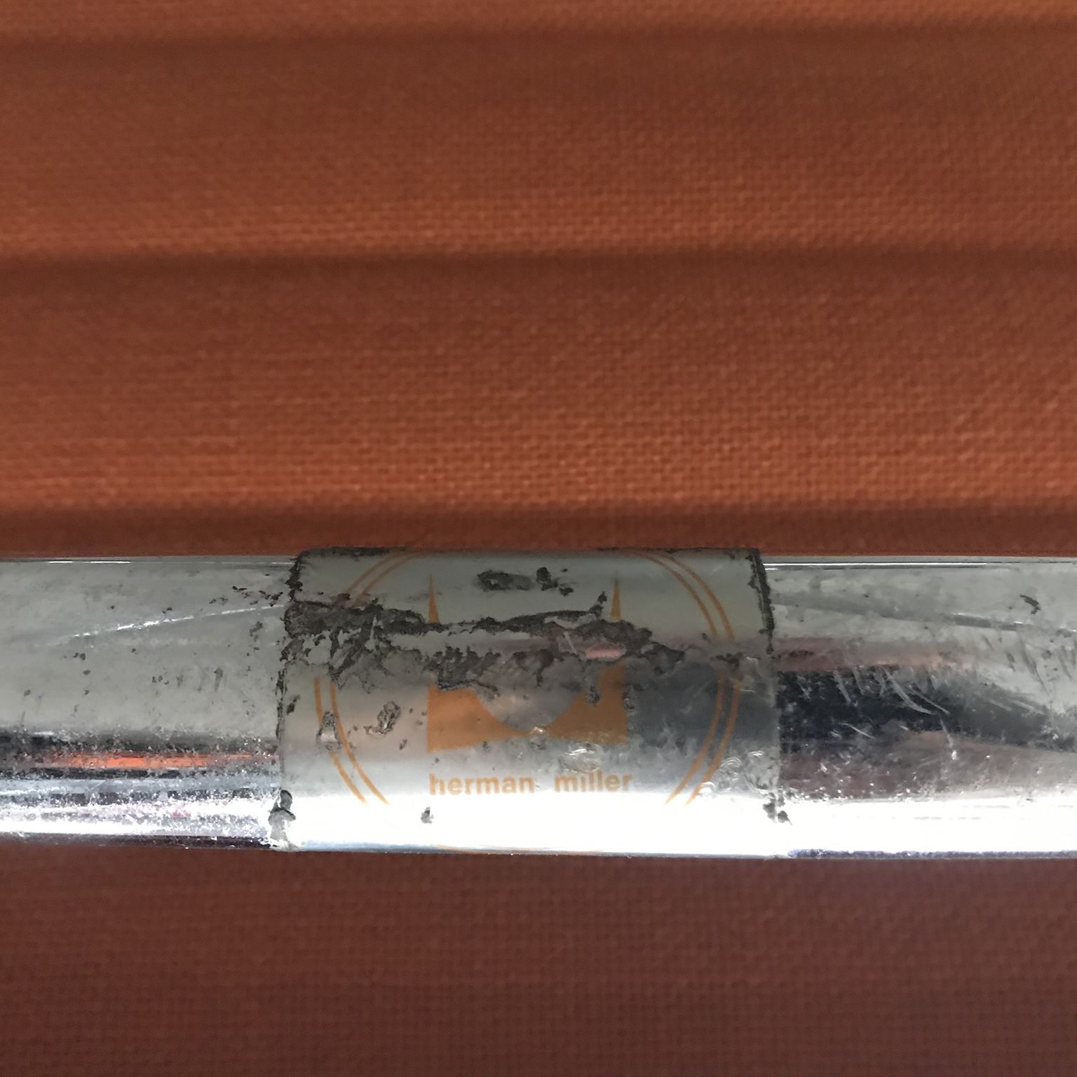 The upholstery is in good condition besides some light stains on the seat and on the upper side, on top. The base has some spots caused by loss of chrome and the base is a bit ‘wobbly’, as most of the earlier, original, first base items.