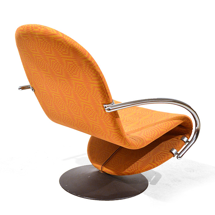 Very rare, almost spotless, very comfortable easy chair with armrests by Verner Panton, an icon of the 1970s by Panton. Original fabric with beautiful dessin and in two shades of orange, which is in very good condition. Some spots on the chrome base. Some loss of paint of the brown foot.