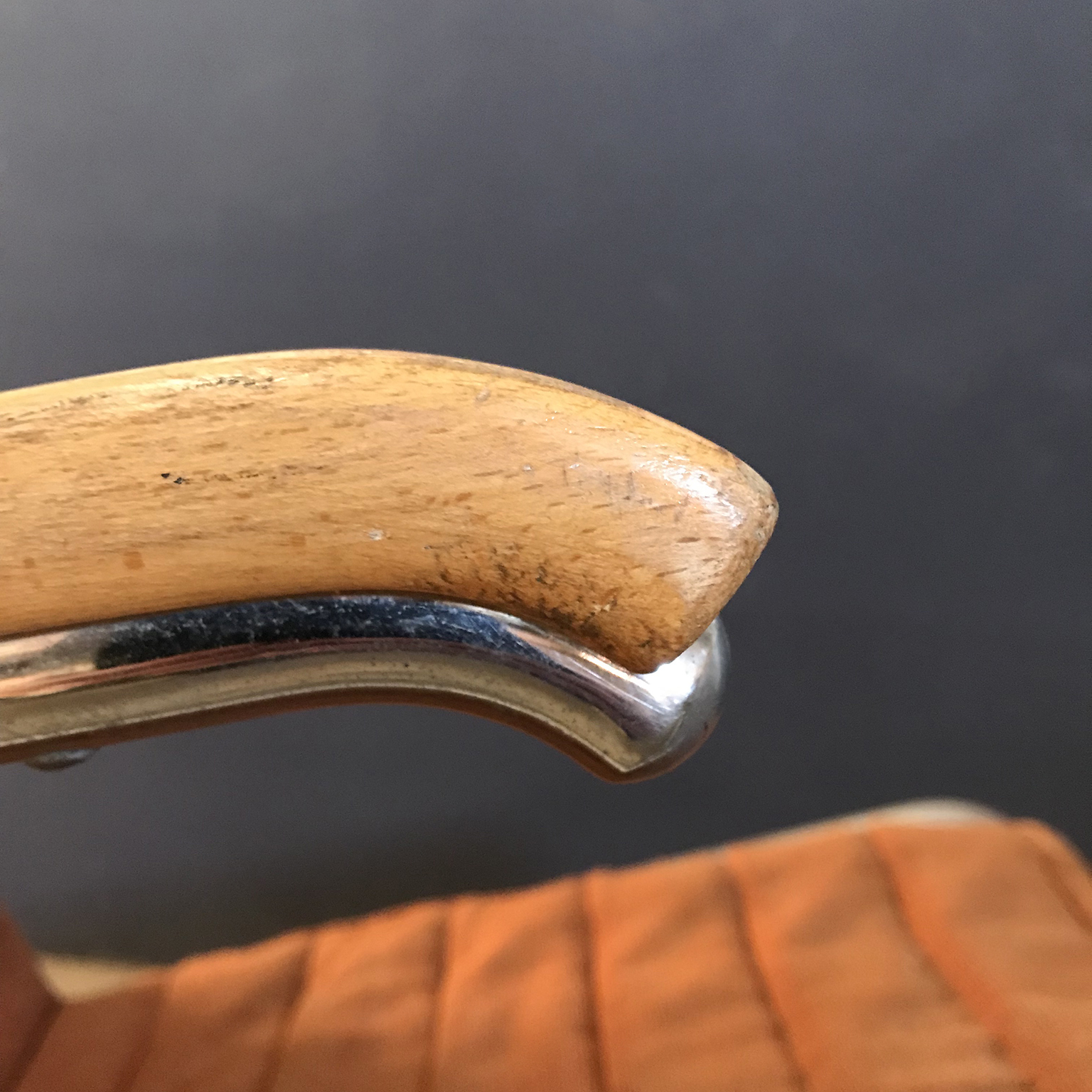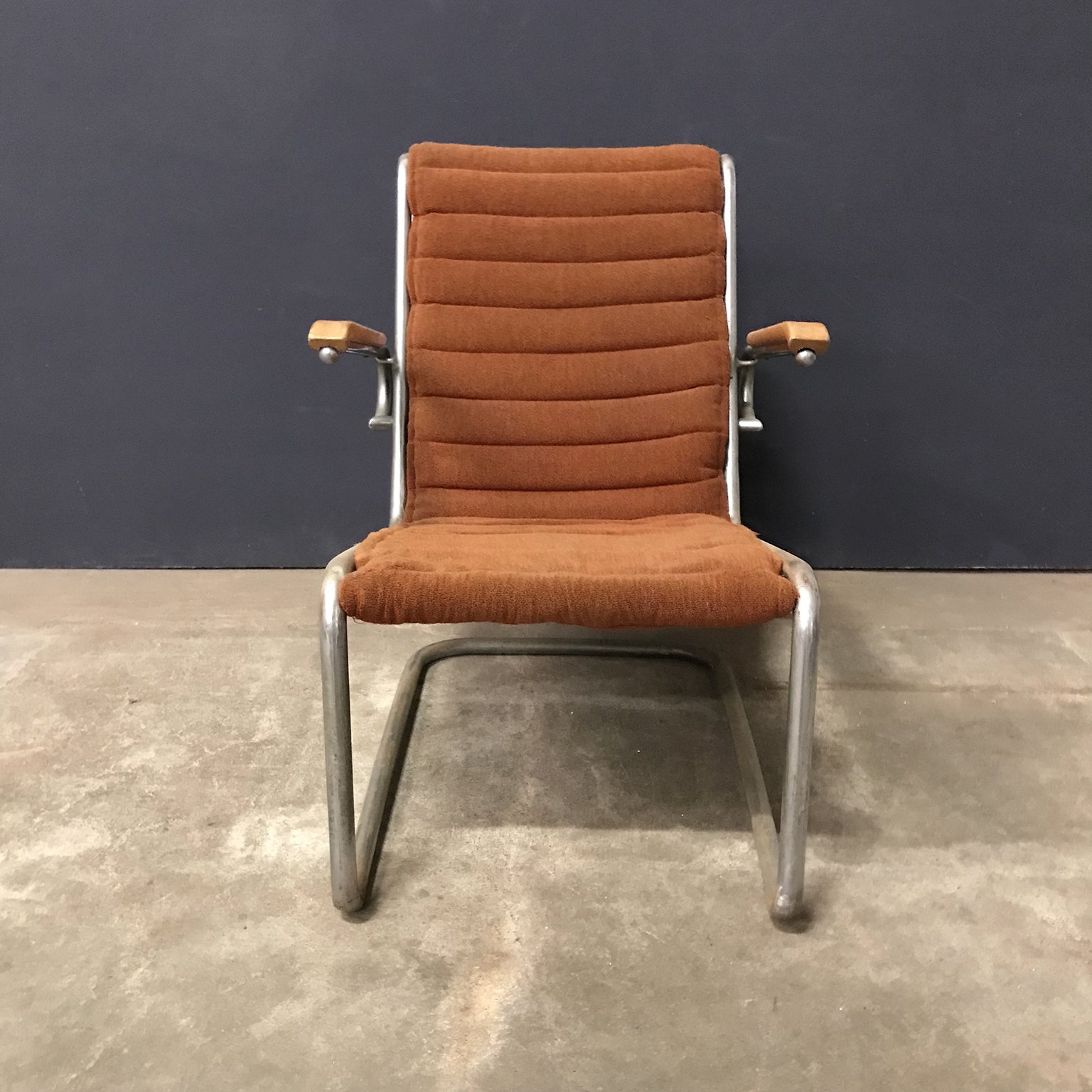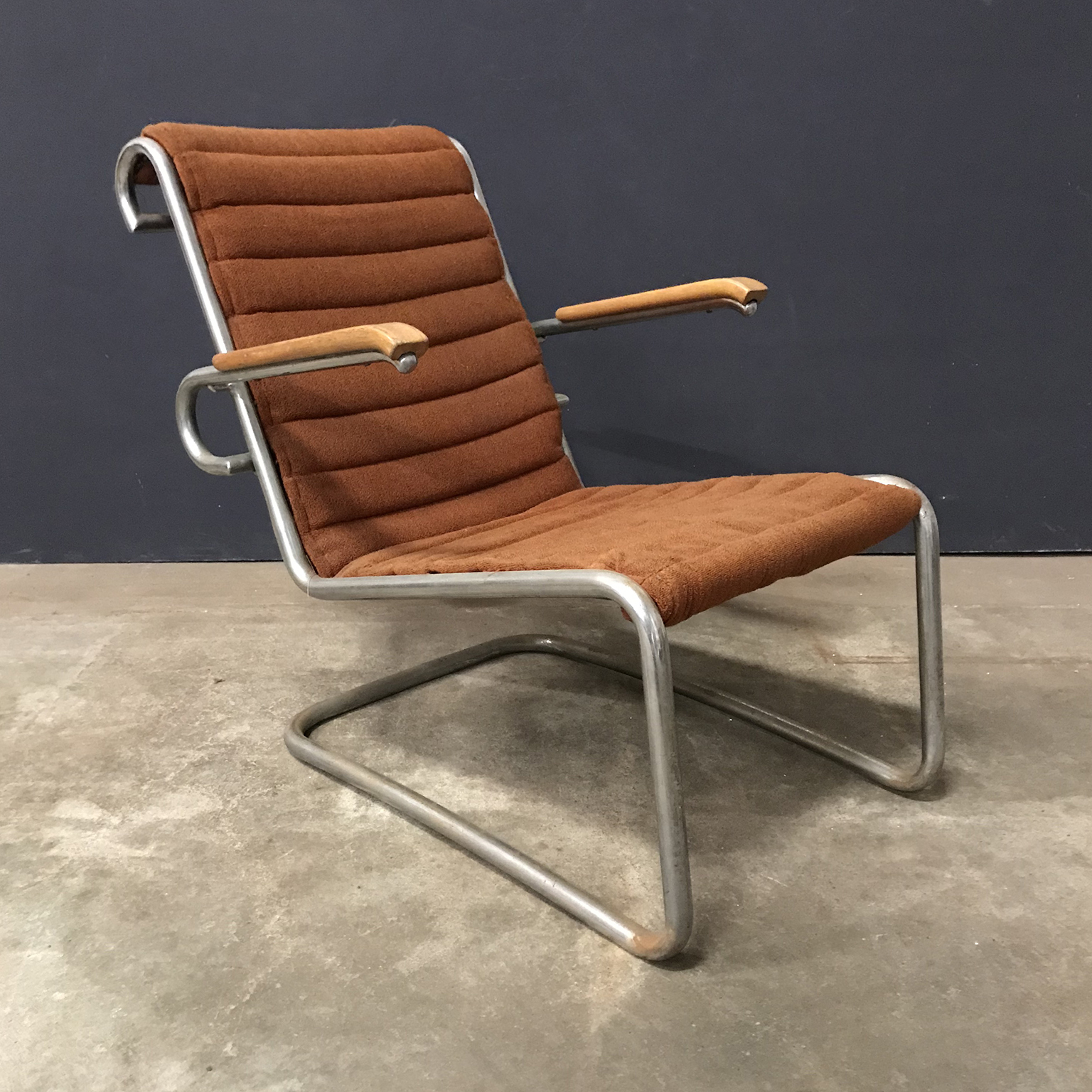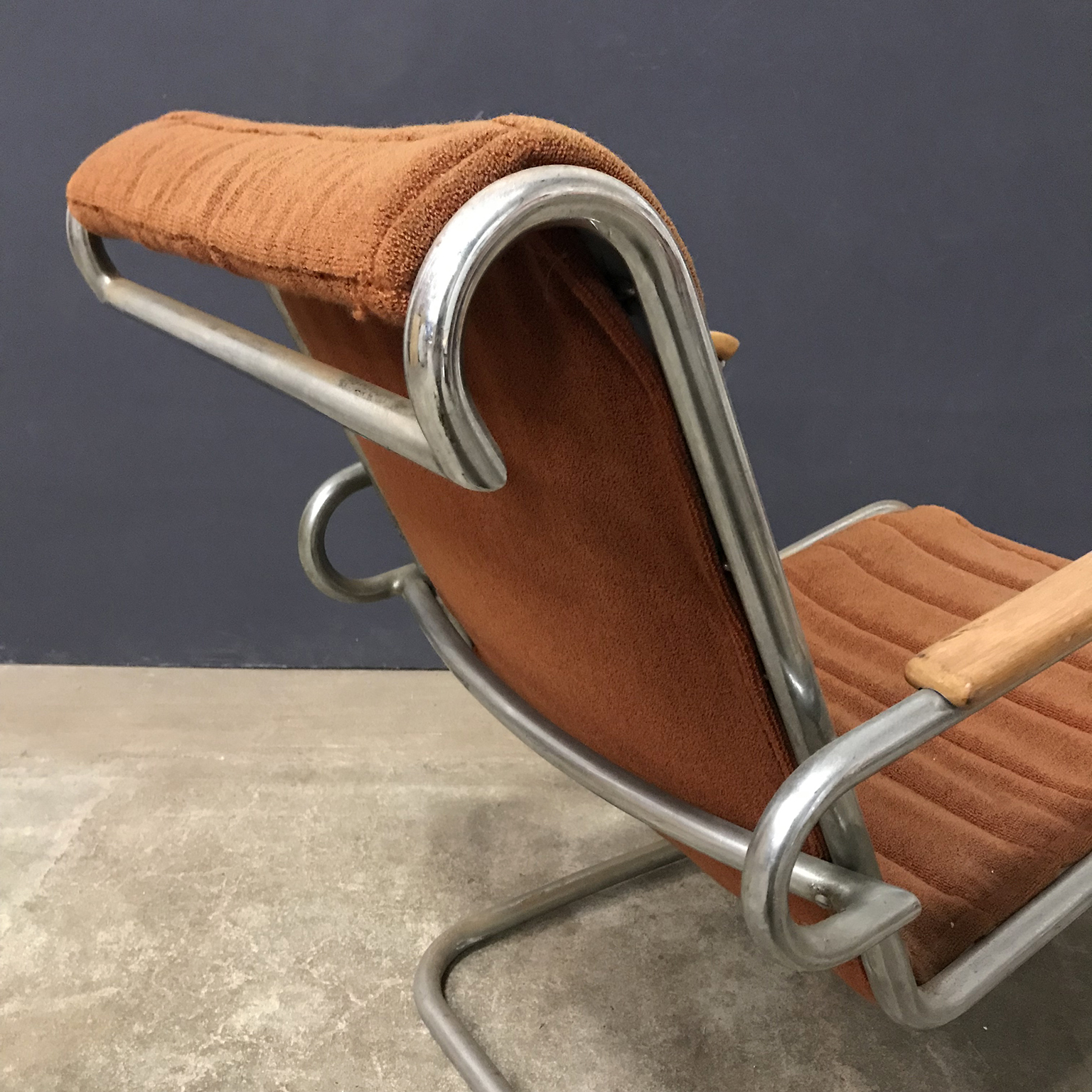 Beautiful very very rare tubular lounge chair with wooden armrests. This chair has a very elegant design with a base with round shapes (#8 – #10). The chair shows traces of wear like loss of chrome (#10, #14 – #17) of the base and rusty spots and some scratches and some loss of some lacquer of the armrests (#9, #11 – #13). The upholstery shows traces of wear like some tiny damages and needs some freshen up but is overall fairly good (#8, #16 and #18). The chair has spiral springs and The base has been repaired at the rounding of the legs in the front; it has been welded and filled (#20): it was tested and can carry average adult weight. Weight 11 kg The total width of the chair is 56,5 cm and the width of the seat is 48 cm