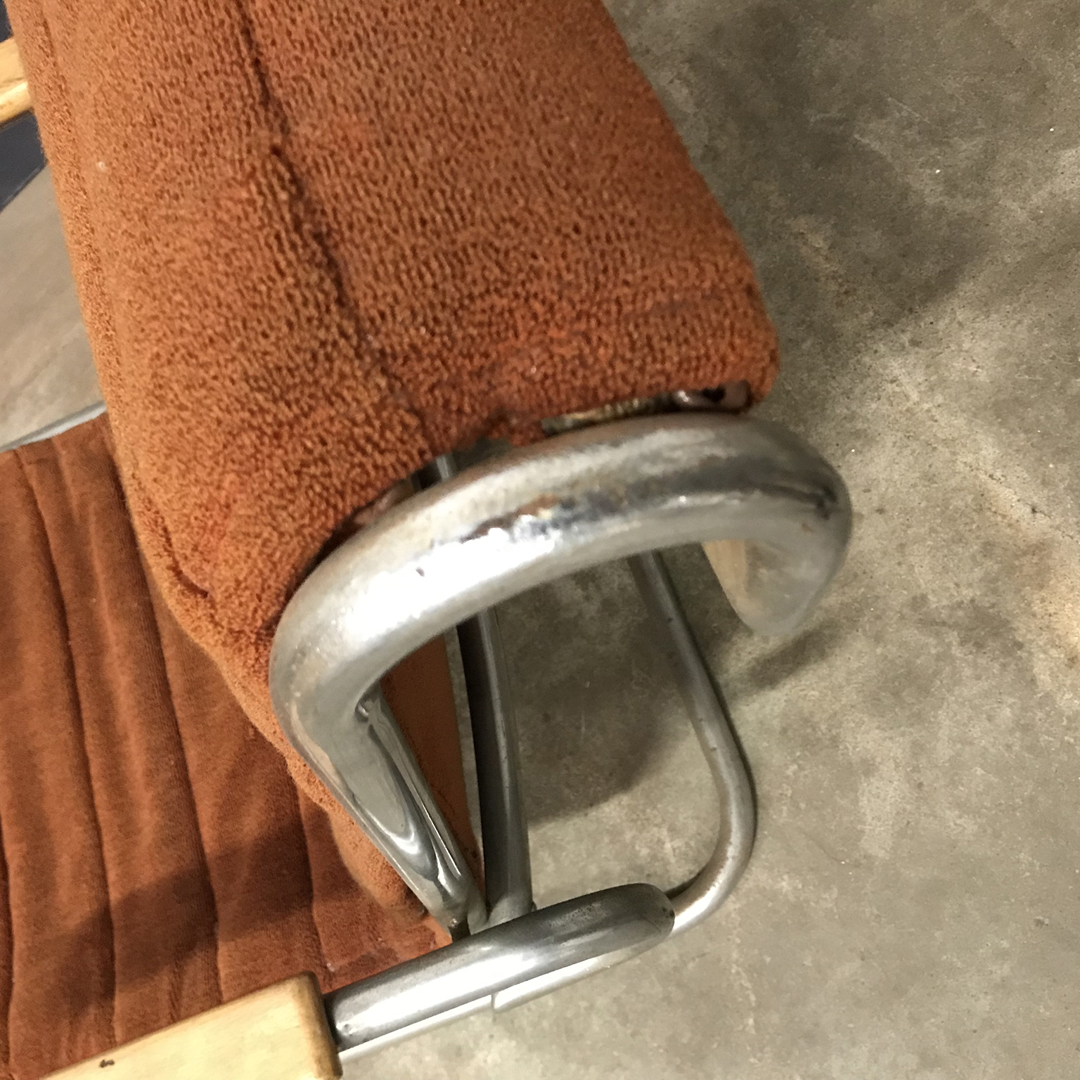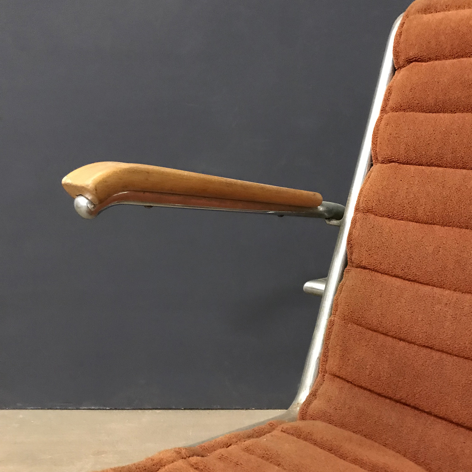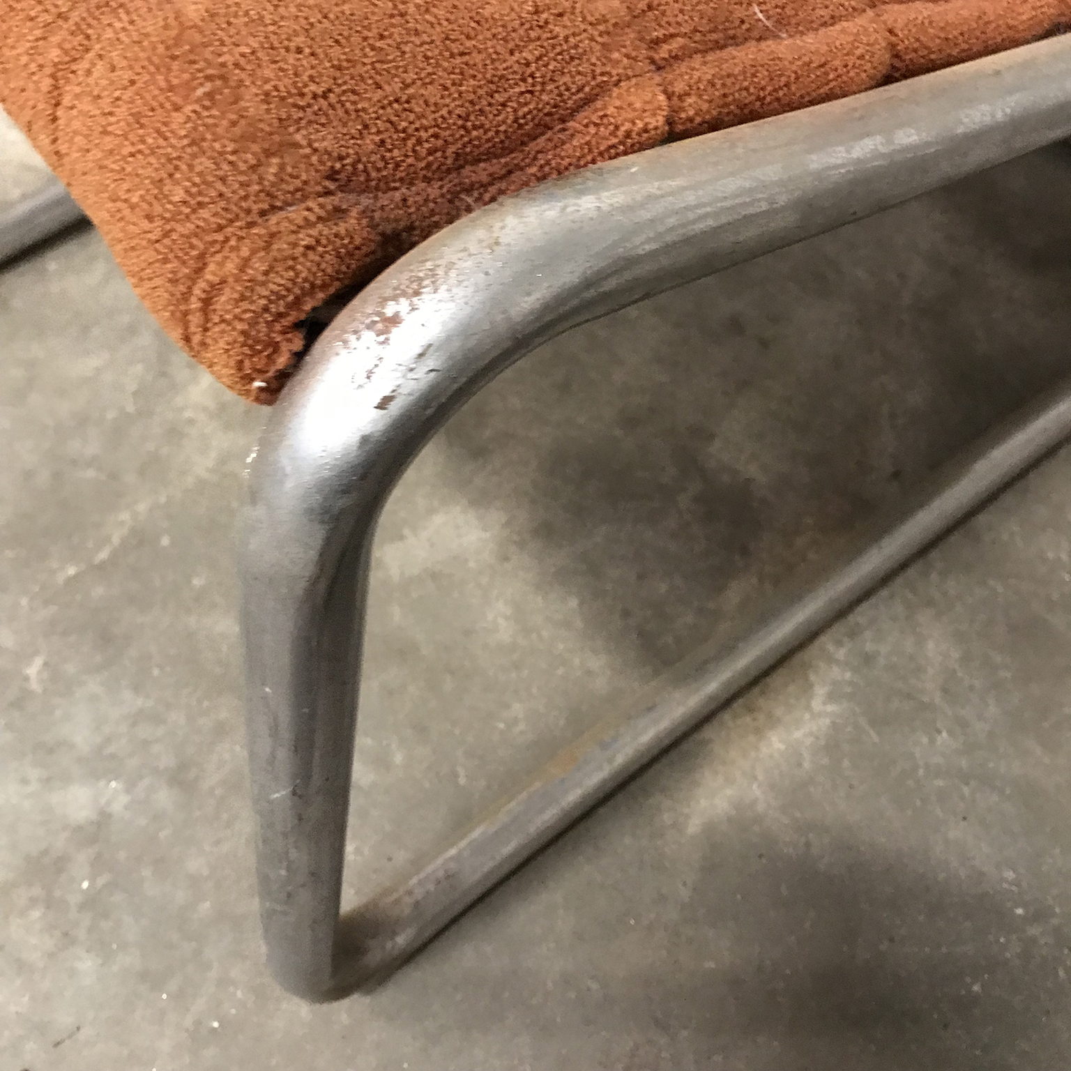 Beautiful very very rare tubular lounge chair with wooden armrests. This chair has a very elegant design with a base with round shapes (#8 – #10). The chair shows traces of wear like loss of chrome (#10, #14 – #17) of the base and rusty spots and some scratches and some loss of some lacquer of the armrests (#9, #11 – #13). The upholstery shows traces of wear like some tiny damages and needs some freshen up but is overall fairly good (#8, #16 and #18). The chair has spiral springs and The base has been repaired at the rounding of the legs in the front; it has been welded and filled (#20): it was tested and can carry average adult weight. Weight 11 kg The total width of the chair is 56,5 cm and the width of the seat is 48 cm