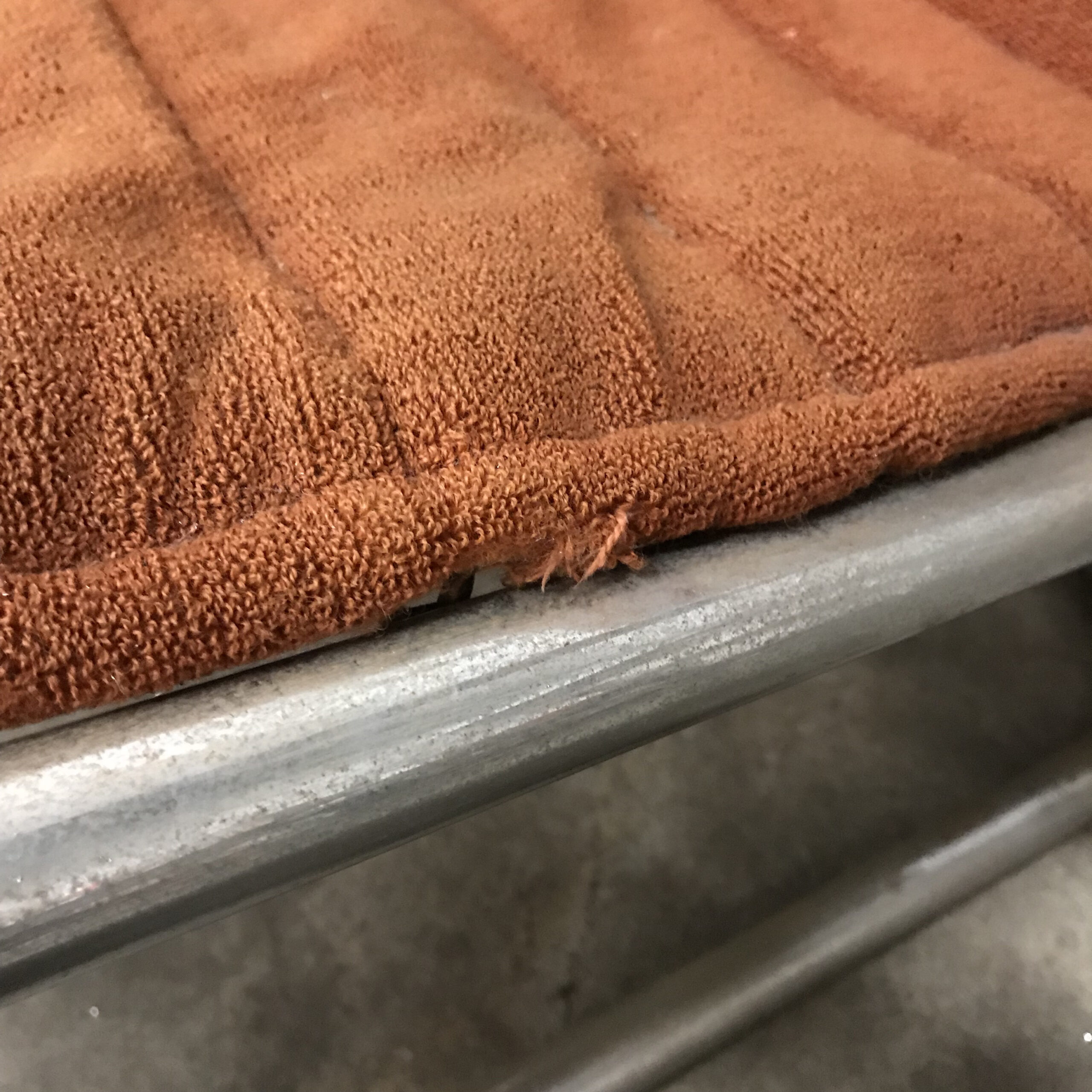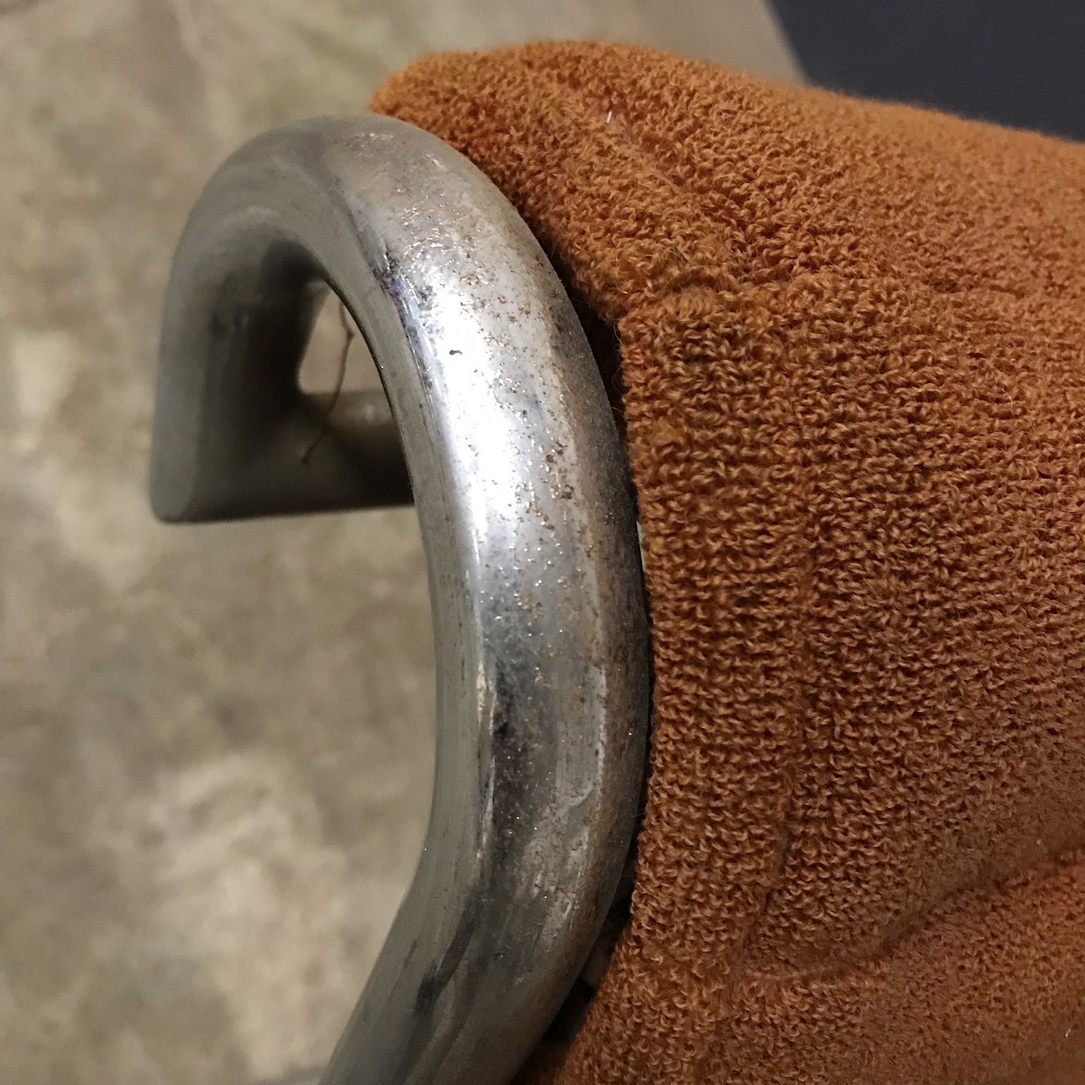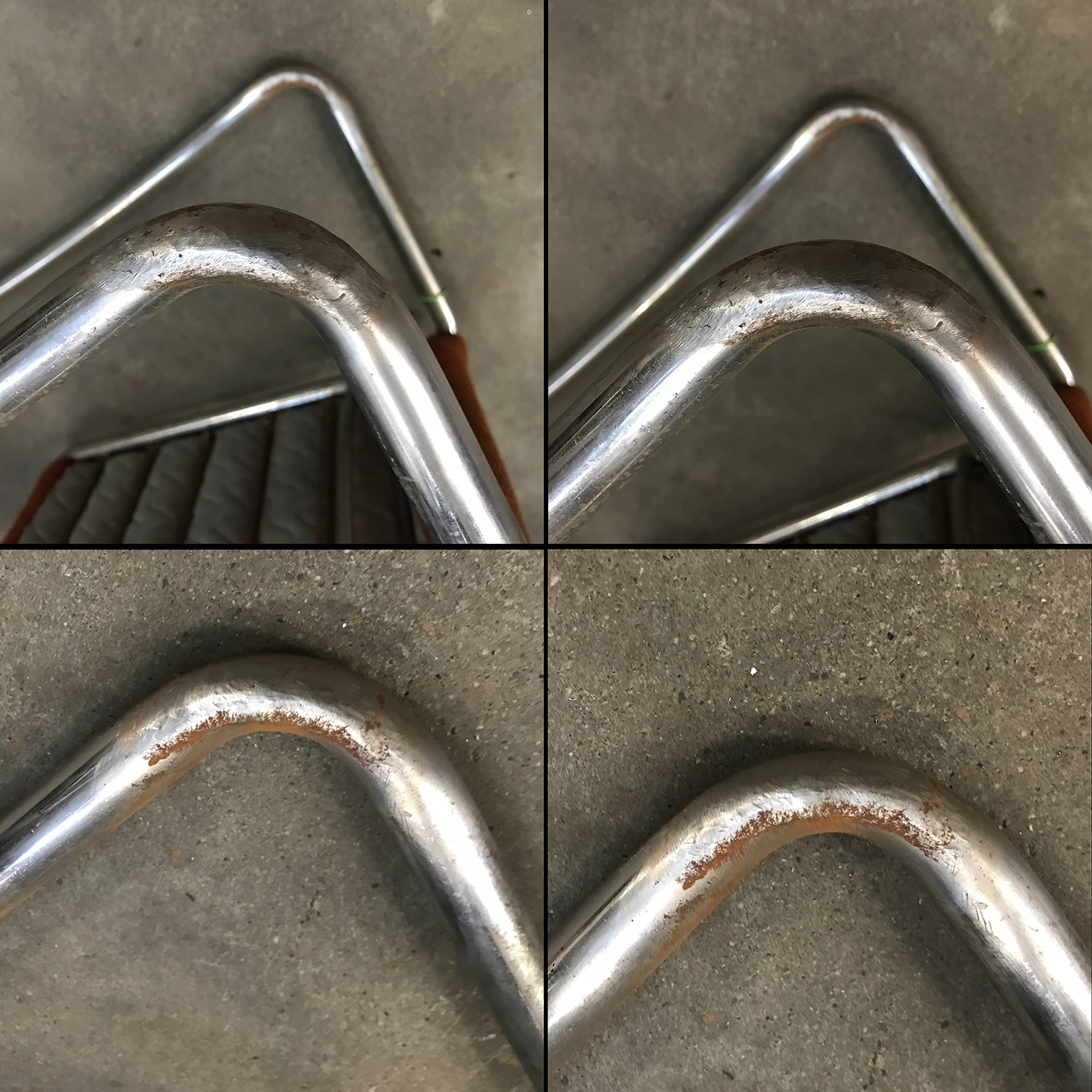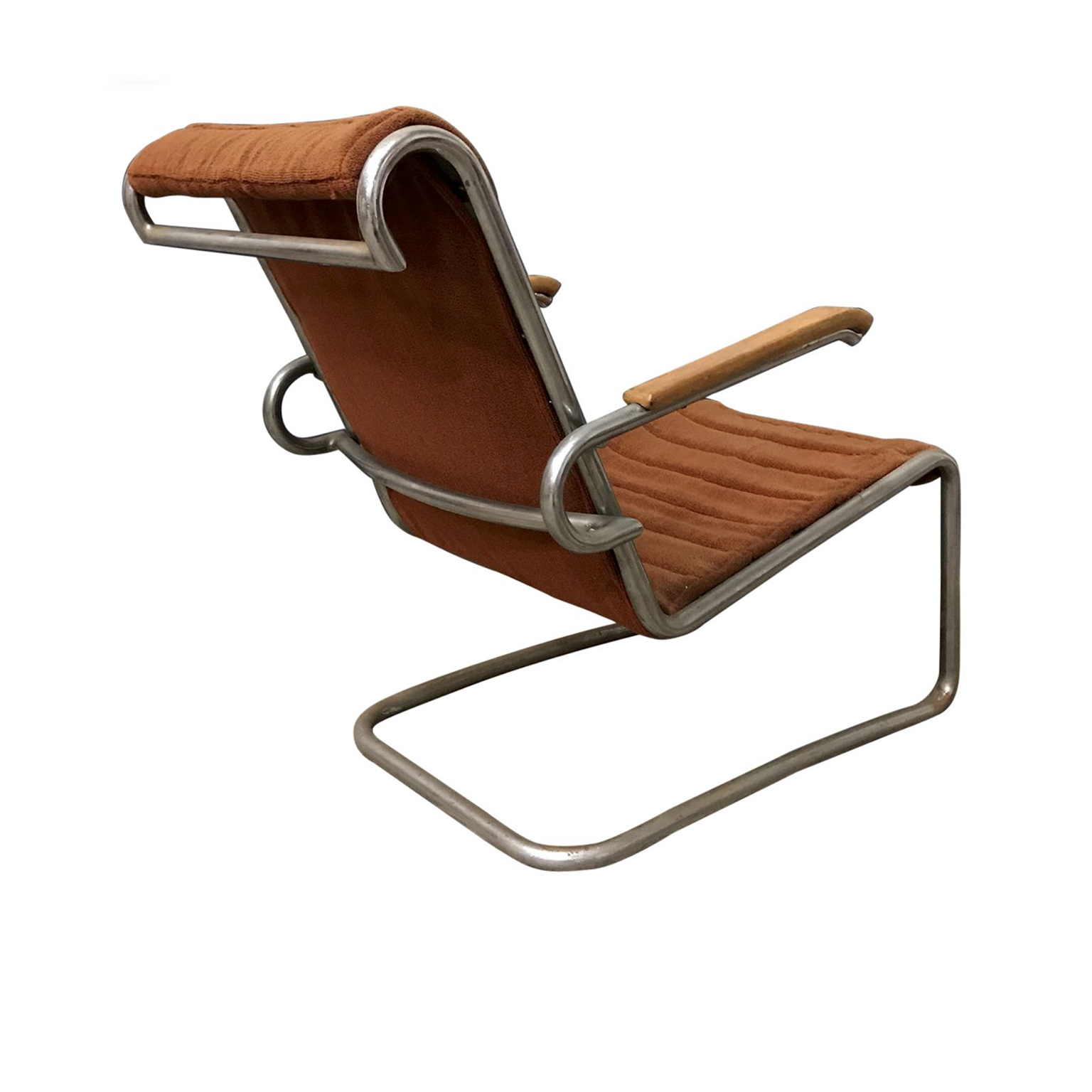 Beautiful very very rare tubular lounge chair with wooden armrests. This chair has a very elegant design with a base with round shapes (#8 – #10). The chair shows traces of wear like loss of chrome (#10, #14 – #17) of the base and rusty spots and some scratches and some loss of some lacquer of the armrests (#9, #11 – #13). The upholstery shows traces of wear like some tiny damages and needs some freshen up but is overall fairly good (#8, #16 and #18). The chair has spiral springs and The base has been repaired at the rounding of the legs in the front; it has been welded and filled (#20): it was tested and can carry average adult weight. Weight 11 kg The total width of the chair is 56,5 cm and the width of the seat is 48 cm