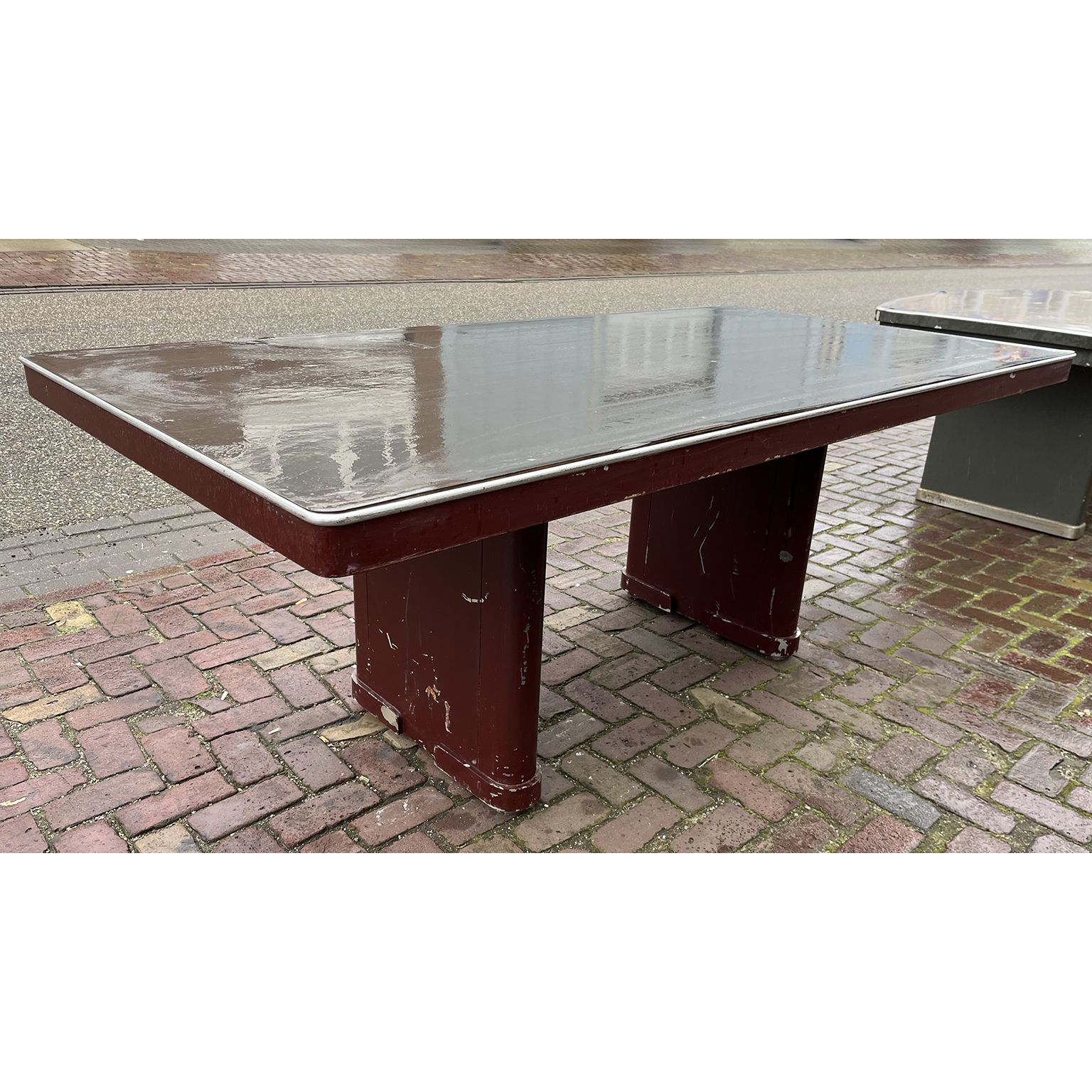 Beautiful elongated rectangular tabel with dark gray table top, burgundy red table edge and table legs. Table shows signs of use. The table top is now shiny because it was damp after cleaning at the time of the photo.