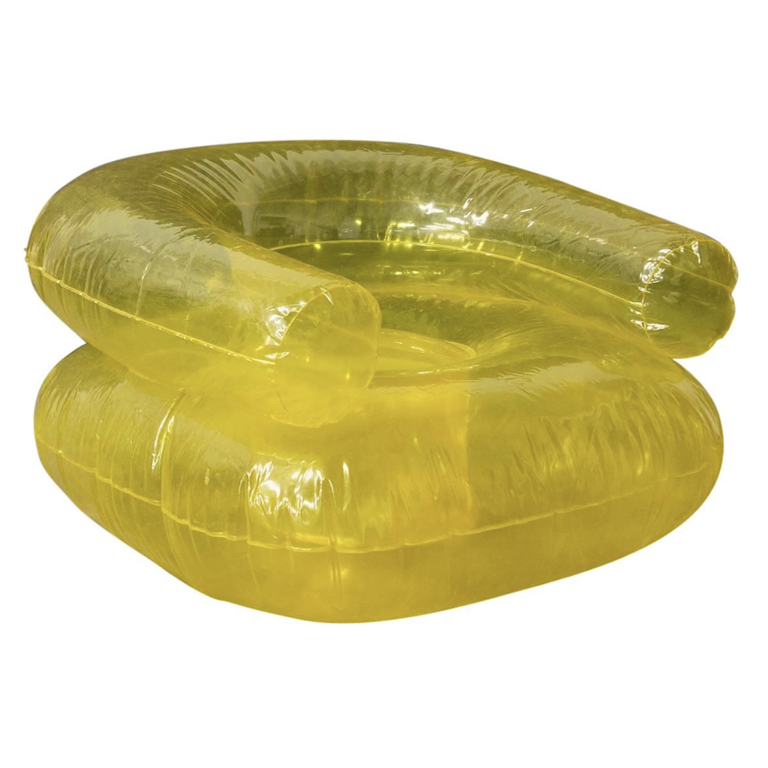 A blow chair for children in yellow. Cute design. Traces of use like some dried liquid spots and some repair pads.