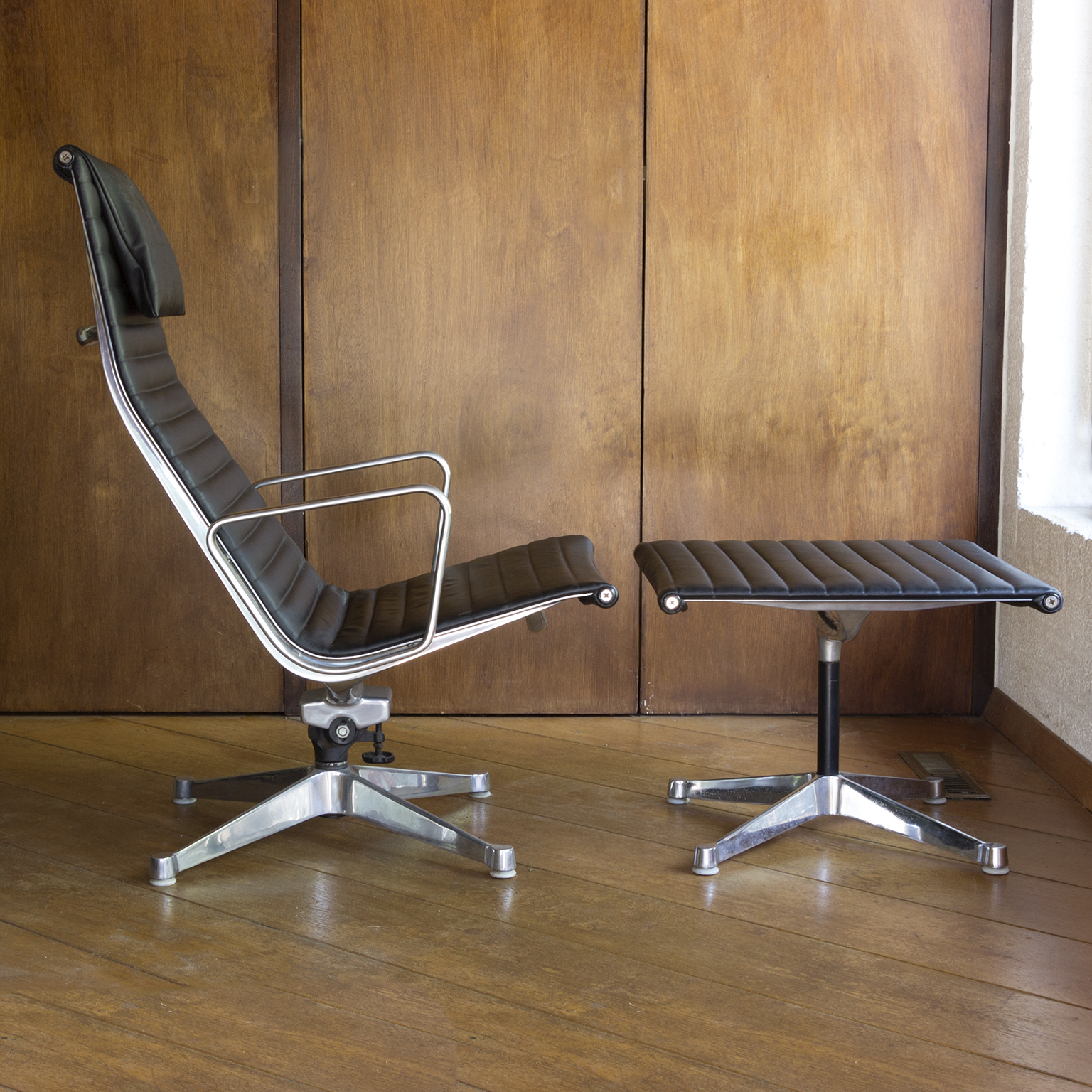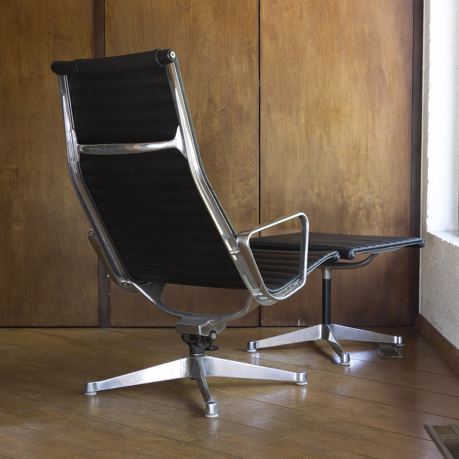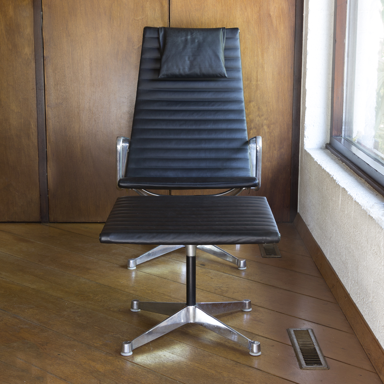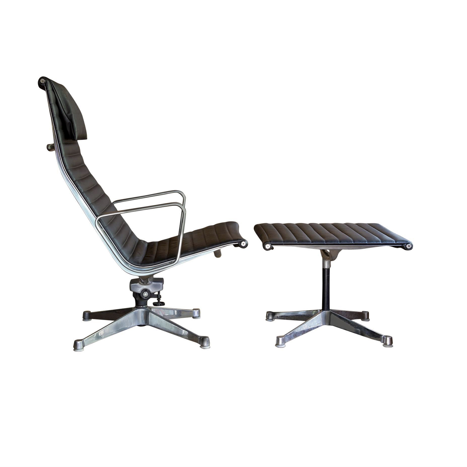 Set of a Black EA 124 with Ottoman by Herman Miller. Beautiful upholstery in soft black leather and overall in perfect condition, except for some tiny scratches on top, near the outer left and right (see picture 8) and some wear along the entire edge on one side of the ottoman. Also the outer left top screw has loss of paint. The bases of both the chair and the ottoman have light traces of wear (see image 8 and 9). The mechanic of the chair makes a crackling sound when changing position while seating. (A video is available of this crackling sound but can’t be uploaded)