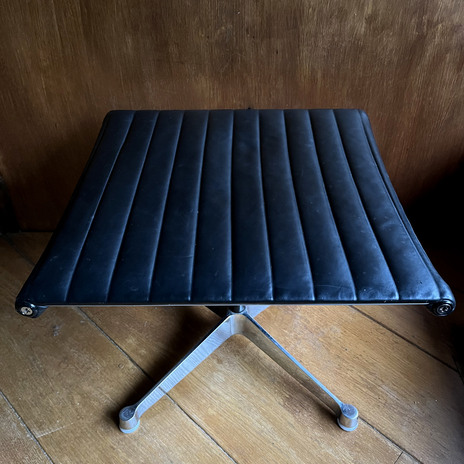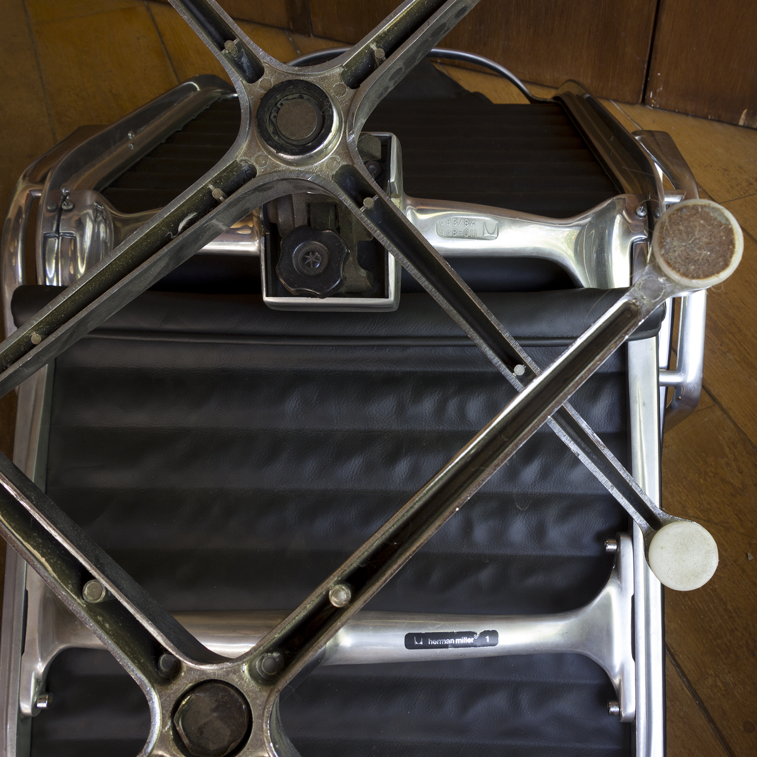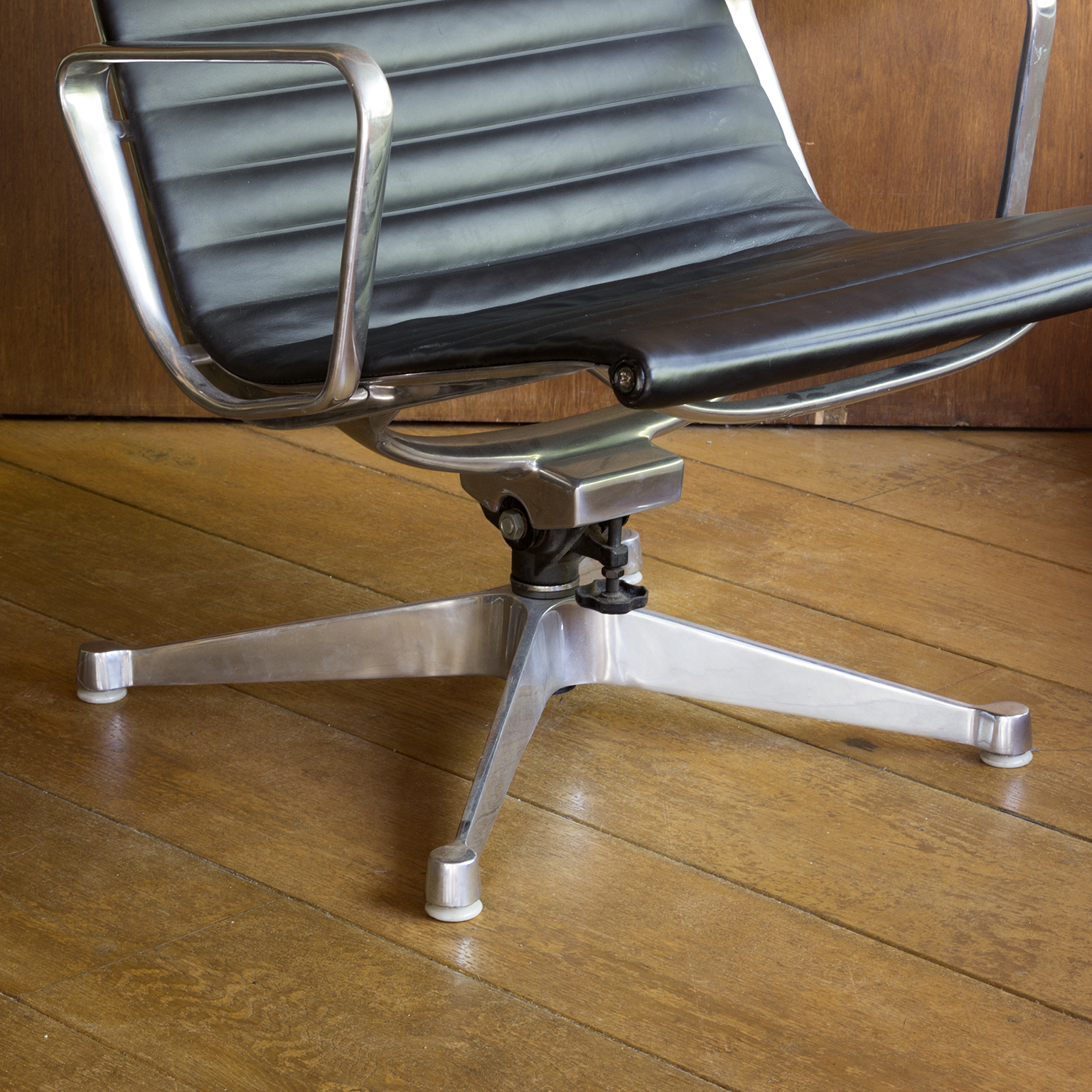 Set of a Black EA 124 with Ottoman by Herman Miller. Beautiful upholstery in soft black leather and overall in perfect condition, except for some tiny scratches on top, near the outer left and right (see picture 8) and some wear along the entire edge on one side of the ottoman. Also the outer left top screw has loss of paint. The bases of both the chair and the ottoman have light traces of wear (see image 8 and 9). The mechanic of the chair makes a crackling sound when changing position while seating. (A video is available of this crackling sound but can’t be uploaded)