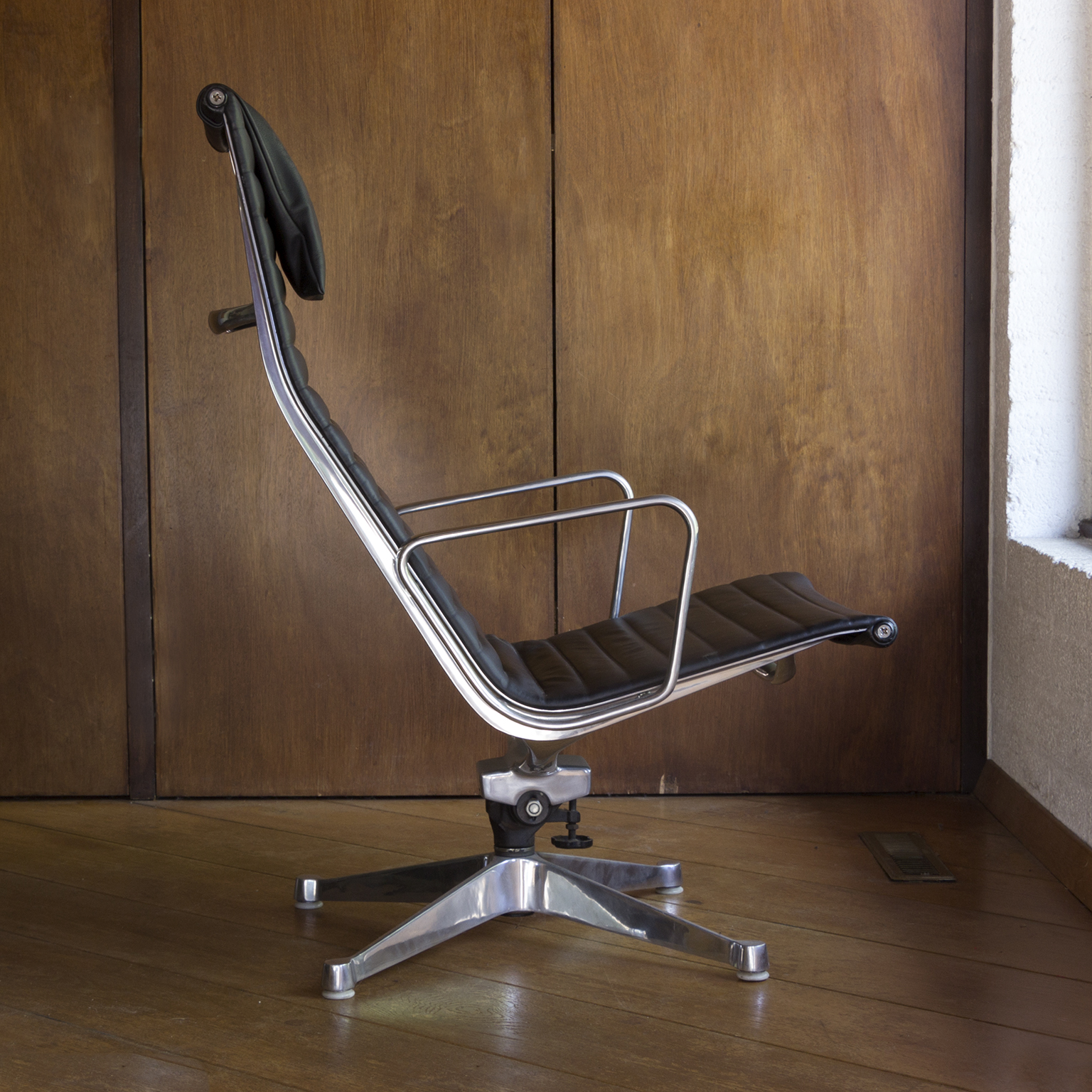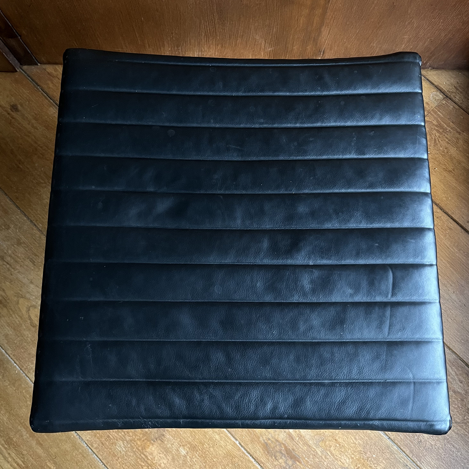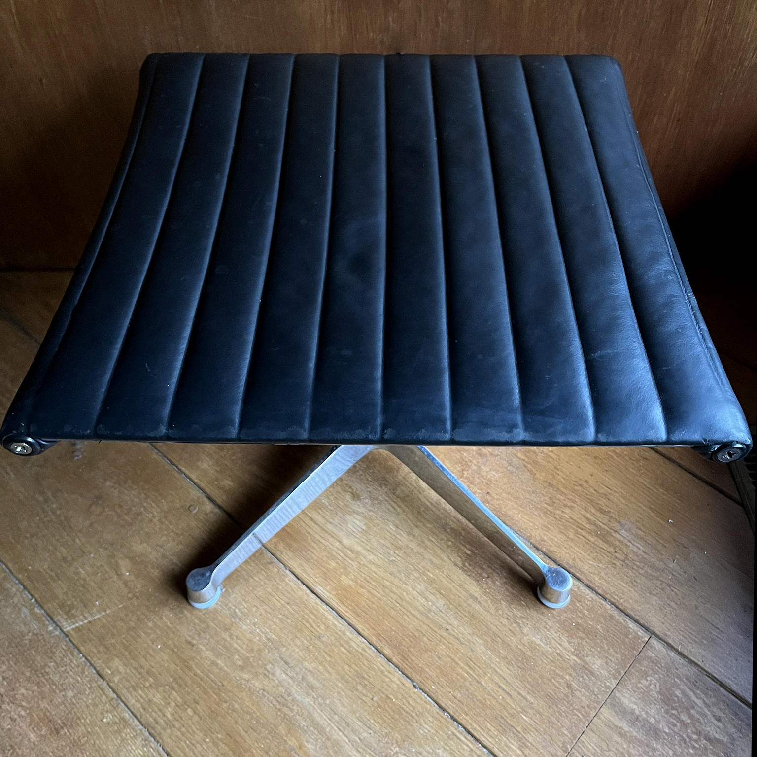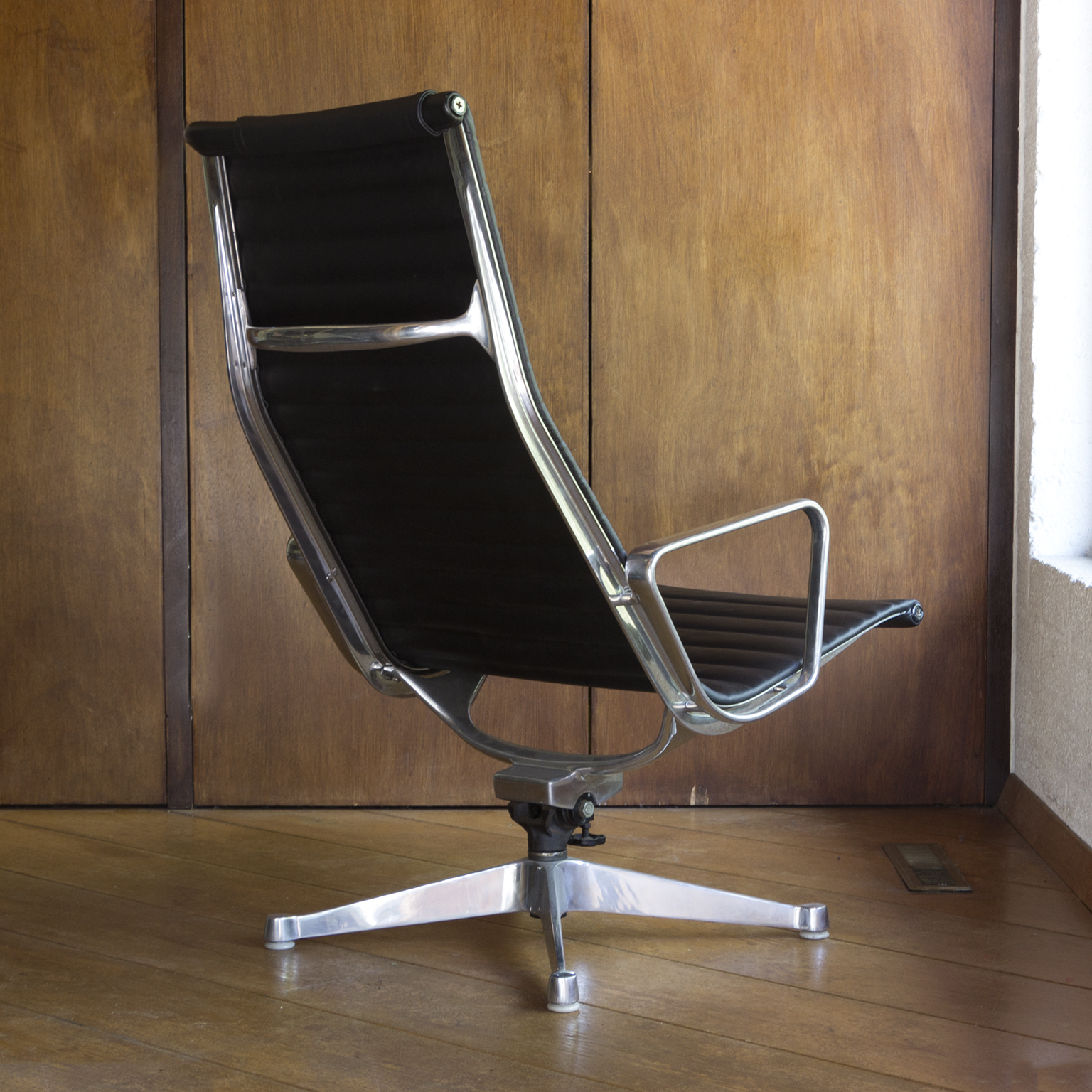 Set of a Black EA 124 with Ottoman by Herman Miller. Beautiful upholstery in soft black leather and overall in perfect condition, except for some tiny scratches on top, near the outer left and right (see picture 8) and some wear along the entire edge on one side of the ottoman. Also the outer left top screw has loss of paint. The bases of both the chair and the ottoman have light traces of wear (see image 8 and 9). The mechanic of the chair makes a crackling sound when changing position while seating. (A video is available of this crackling sound but can’t be uploaded)