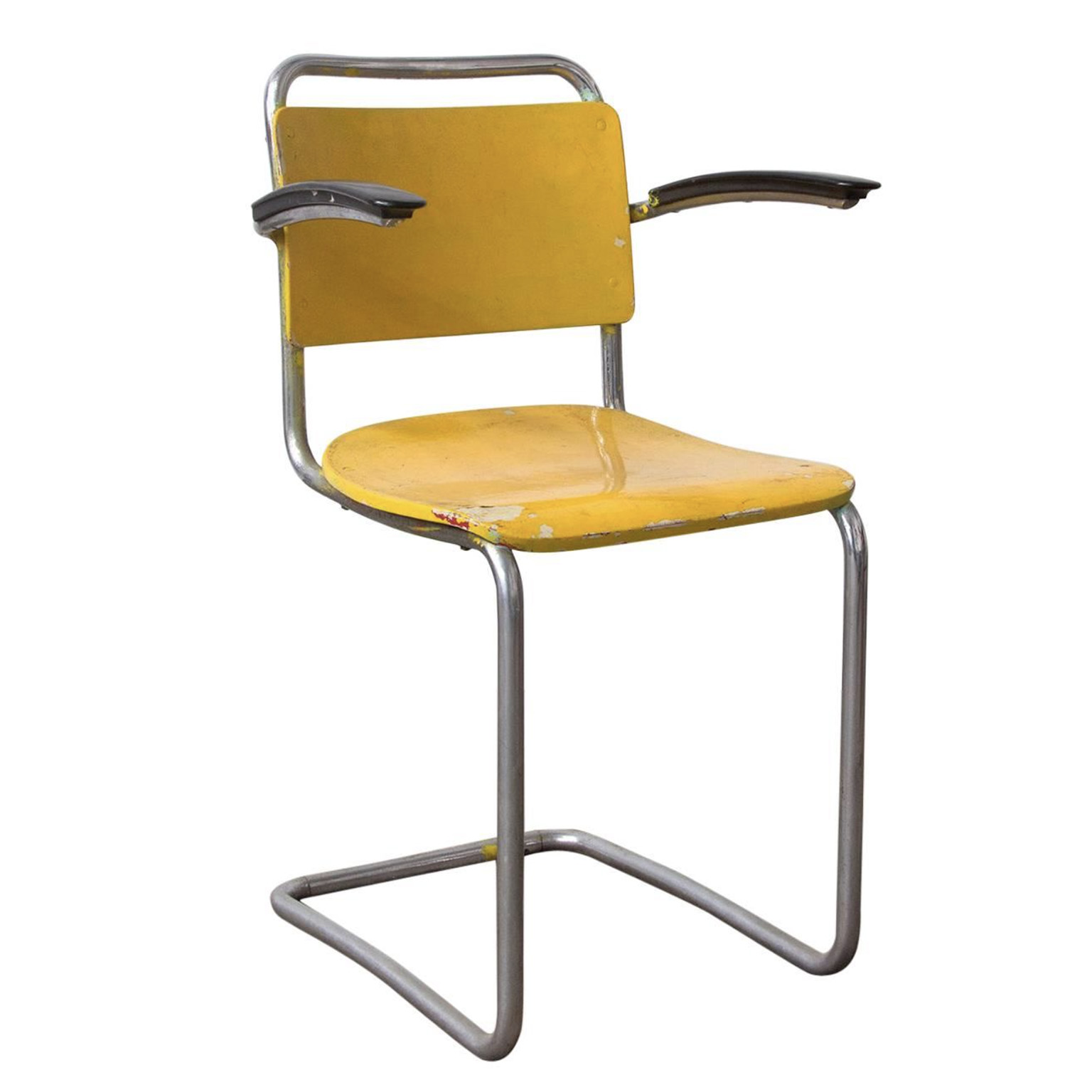 Original pre second world war side chair or dining chair in wood, yellow painted in those days. First the name was 21 later on 201. The yellow paint on top of several layers of paint, which are visible on the spots of loss of paint. This gives the chair its charm. The base shows some spots of paint and rost as well. The chair is an original Gispen chair.