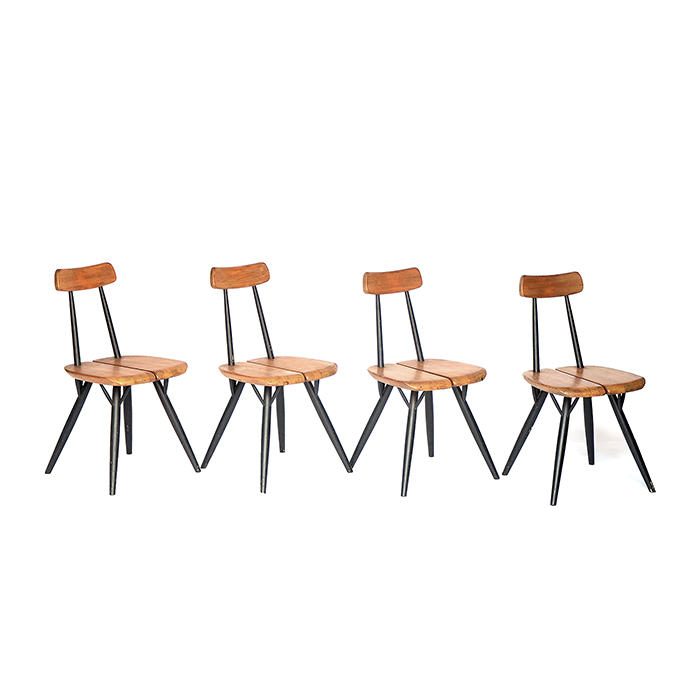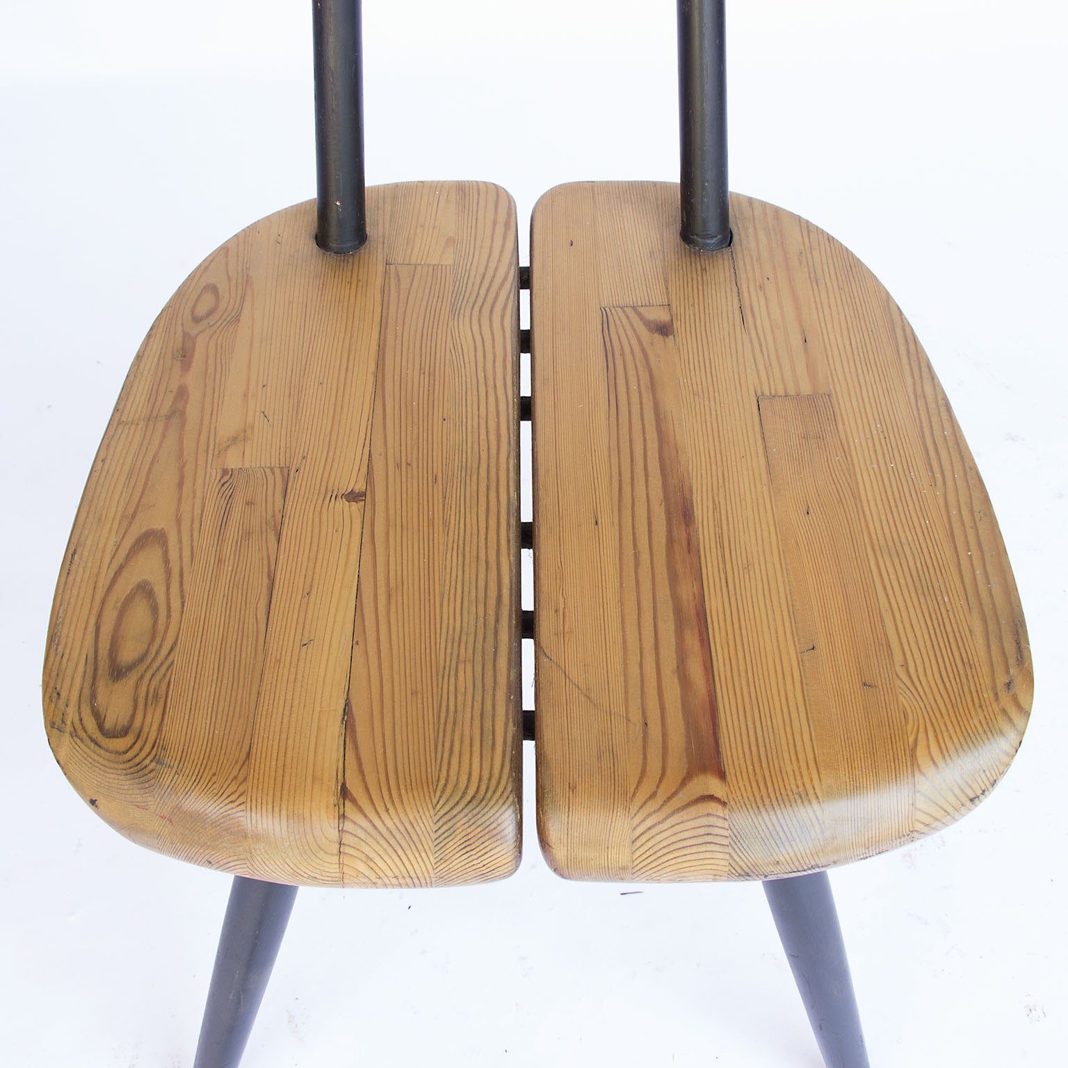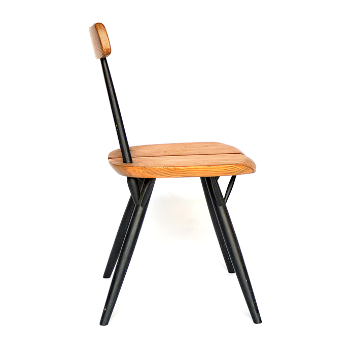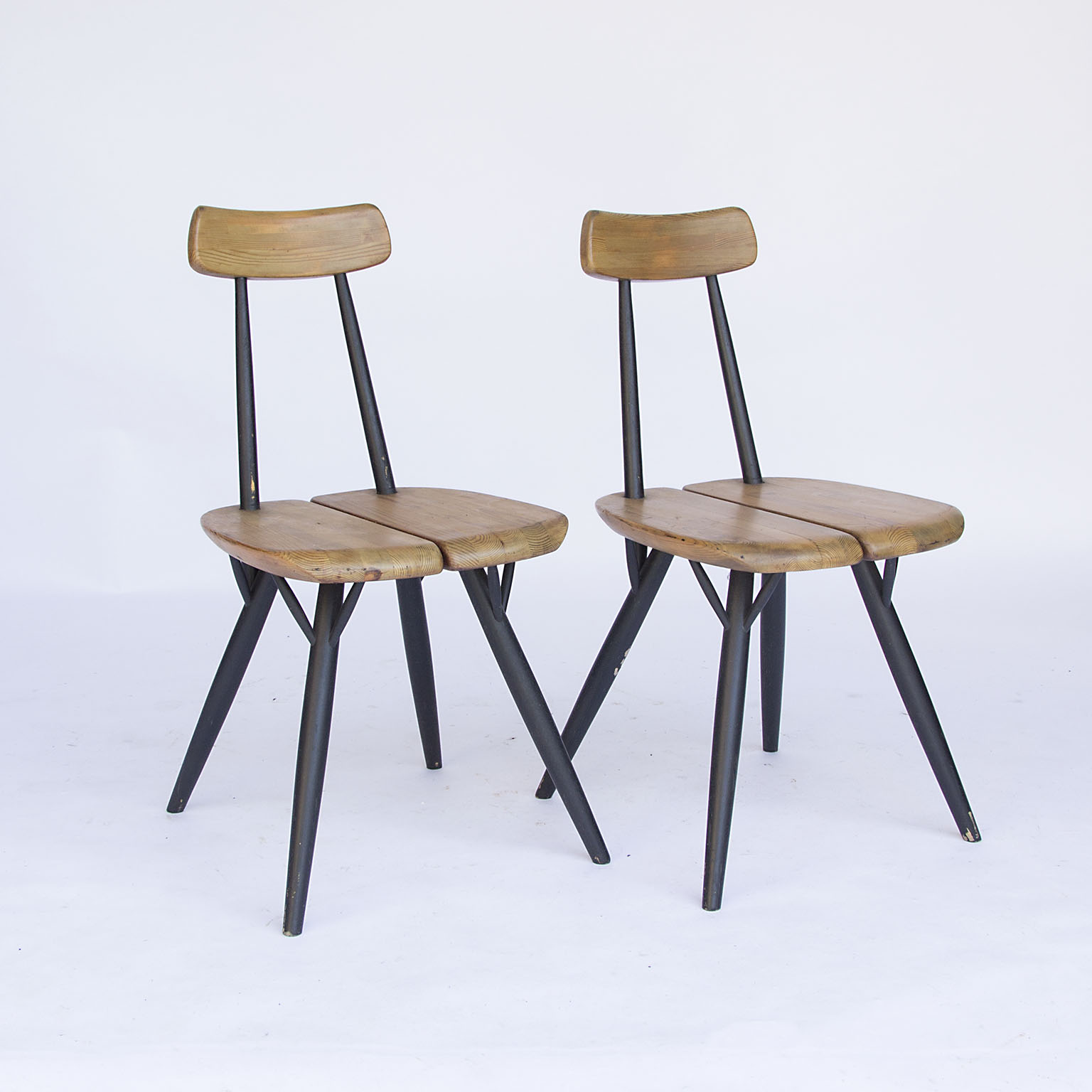 Two beautiful side chairs, model “Pirkka” by Ilmari Tapiovaara, manufactured by Laukaan Puu in Finland. The chair is made of high quality pinewood with black lacquered legs. The chair is marked on the bottom. Top Scandinavian design and a real design Icon. In good original condition with minor wear consistent with age and use.