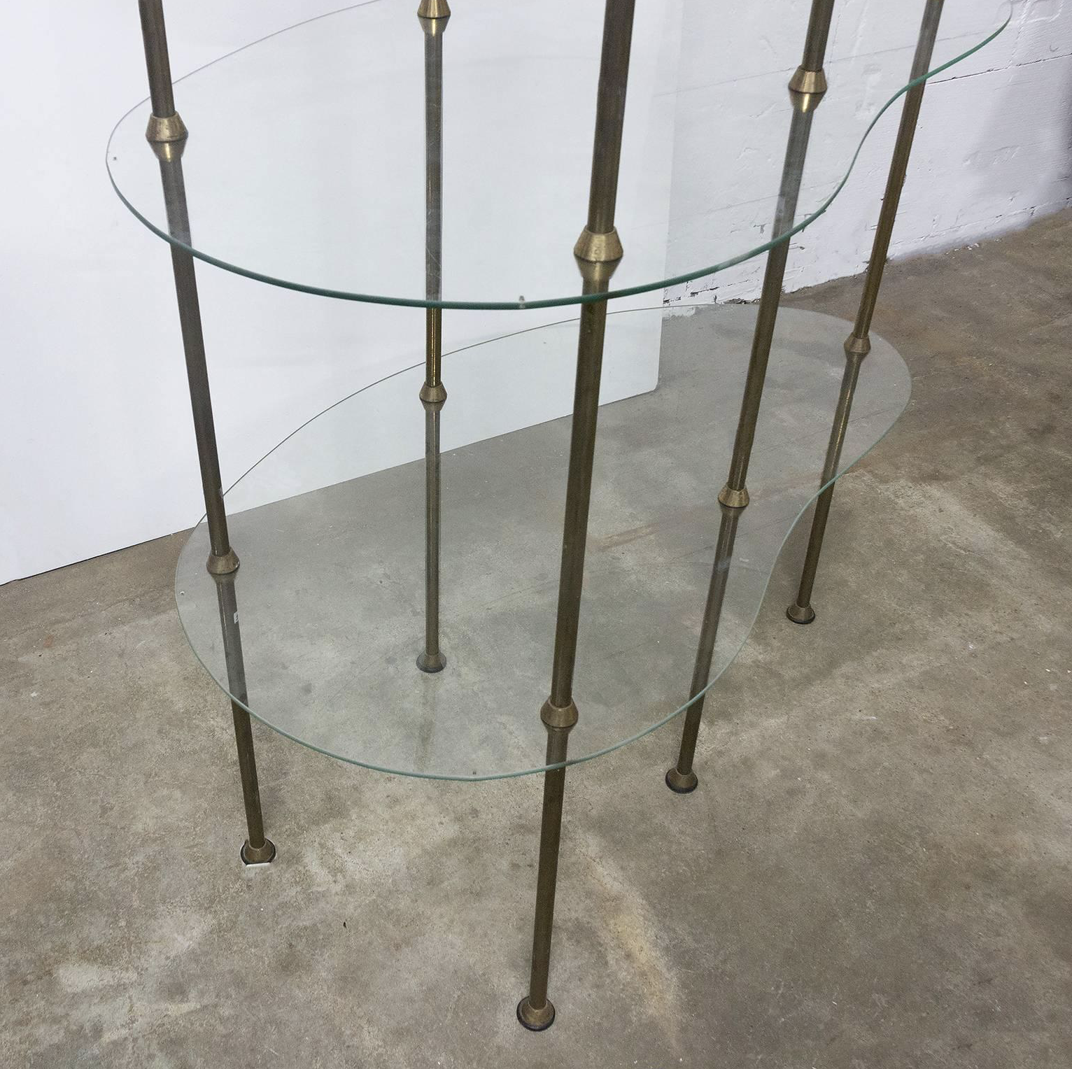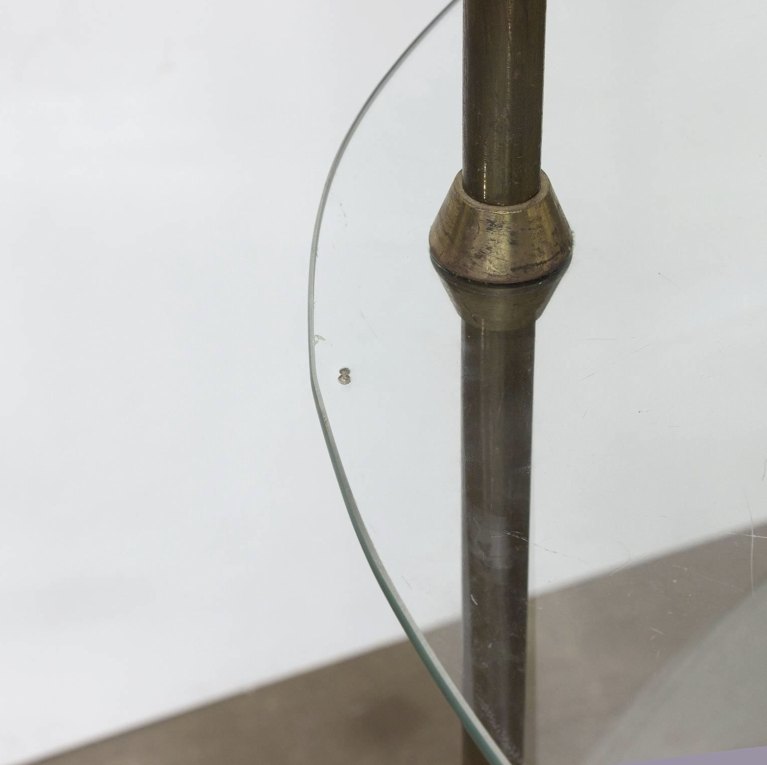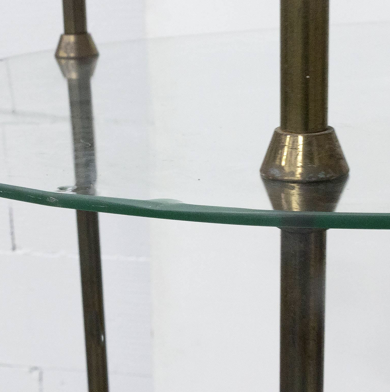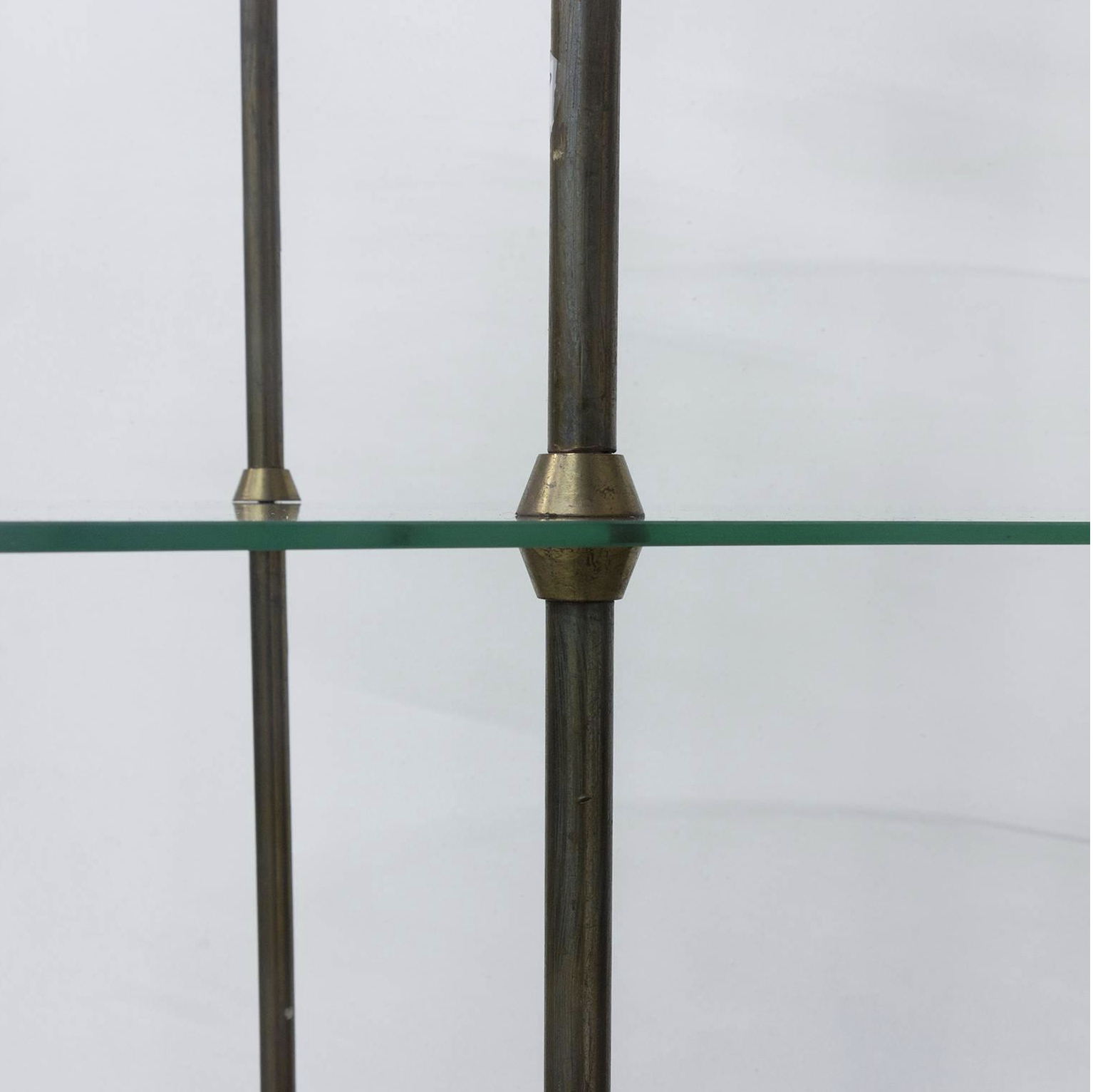 Beautiful iconic fifties eye catcher étagère for small eye catchers ! This display was decades in a chocolate shop in Paris. The glass tops are beautifully ‘cast glass’; therefore little irregularities can be set like on picture 7. Also tiny damage can be seen on picture 8; a tiny chip that is repaired already. The legs show some traces of wear. The whole cupboard can be disassembled (see picture 9).