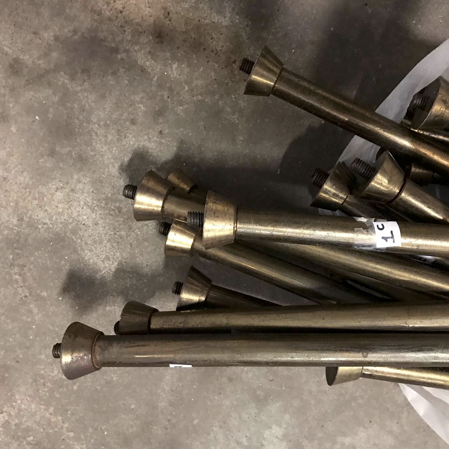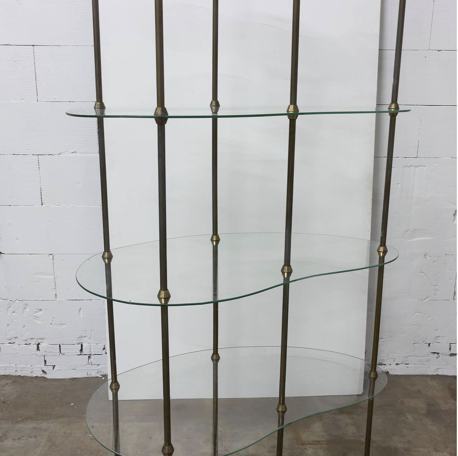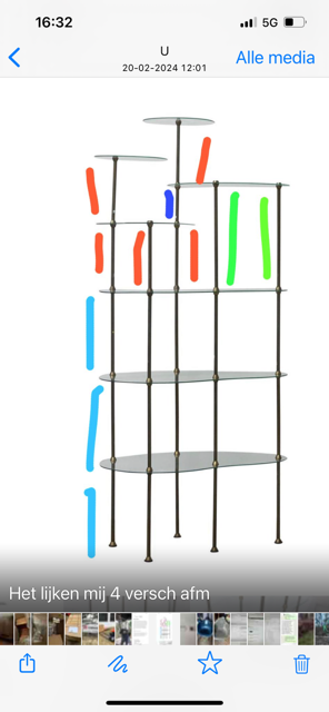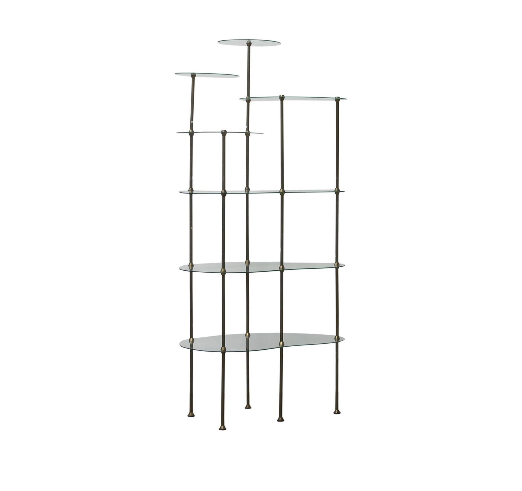 Beautiful iconic fifties eye catcher étagère for small eye catchers ! This display was decades in a chocolate shop in Paris. The glass tops are beautifully ‘cast glass’; therefore little irregularities can be set like on picture 7. Also tiny damage can be seen on picture 8; a tiny chip that is repaired already. The legs show some traces of wear. The whole cupboard can be disassembled (see picture 9).