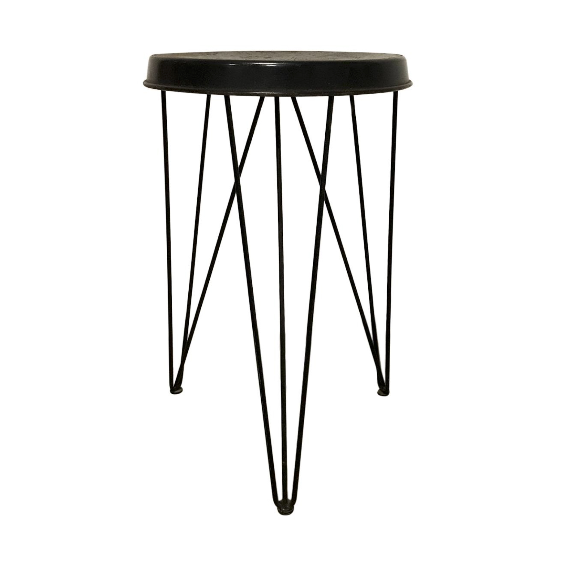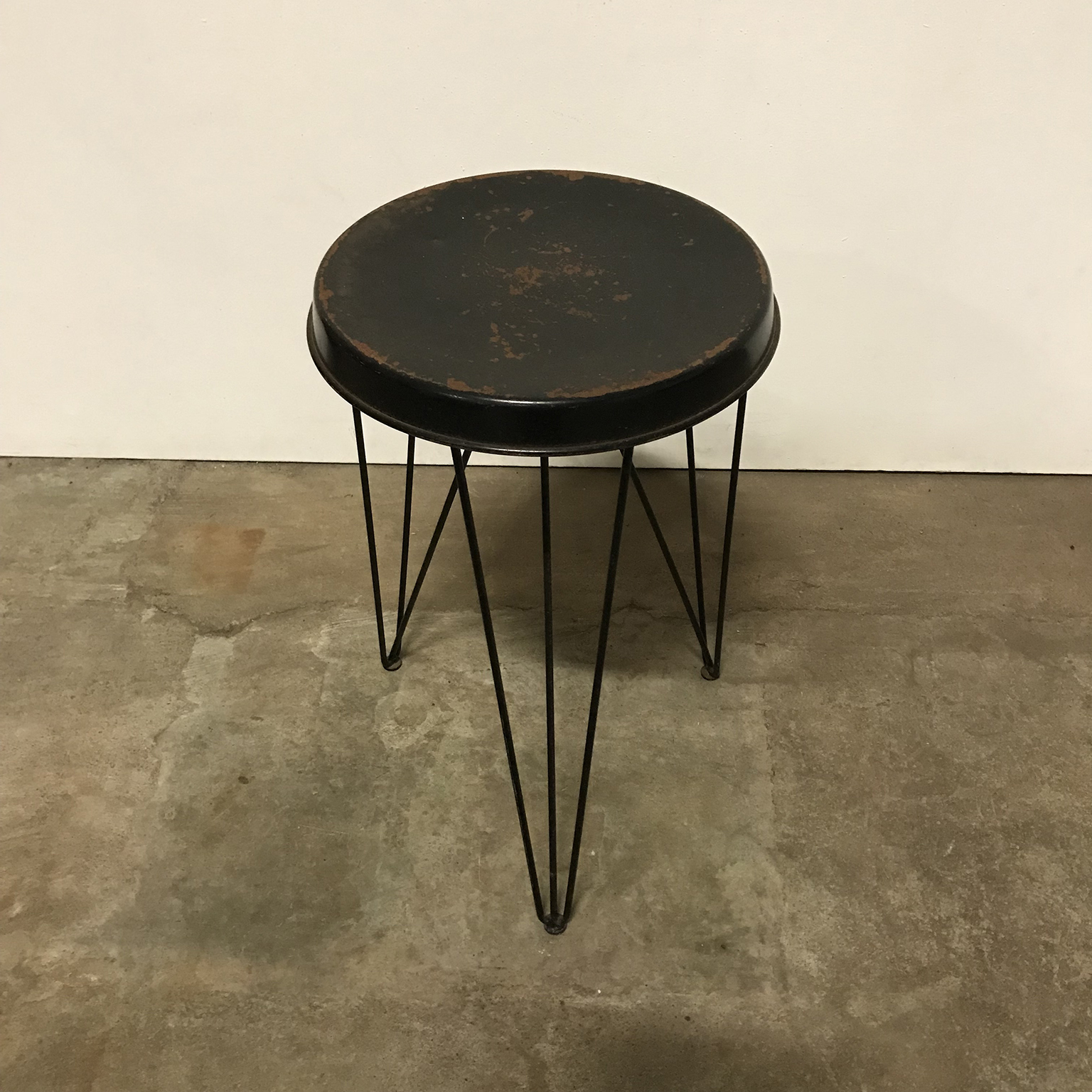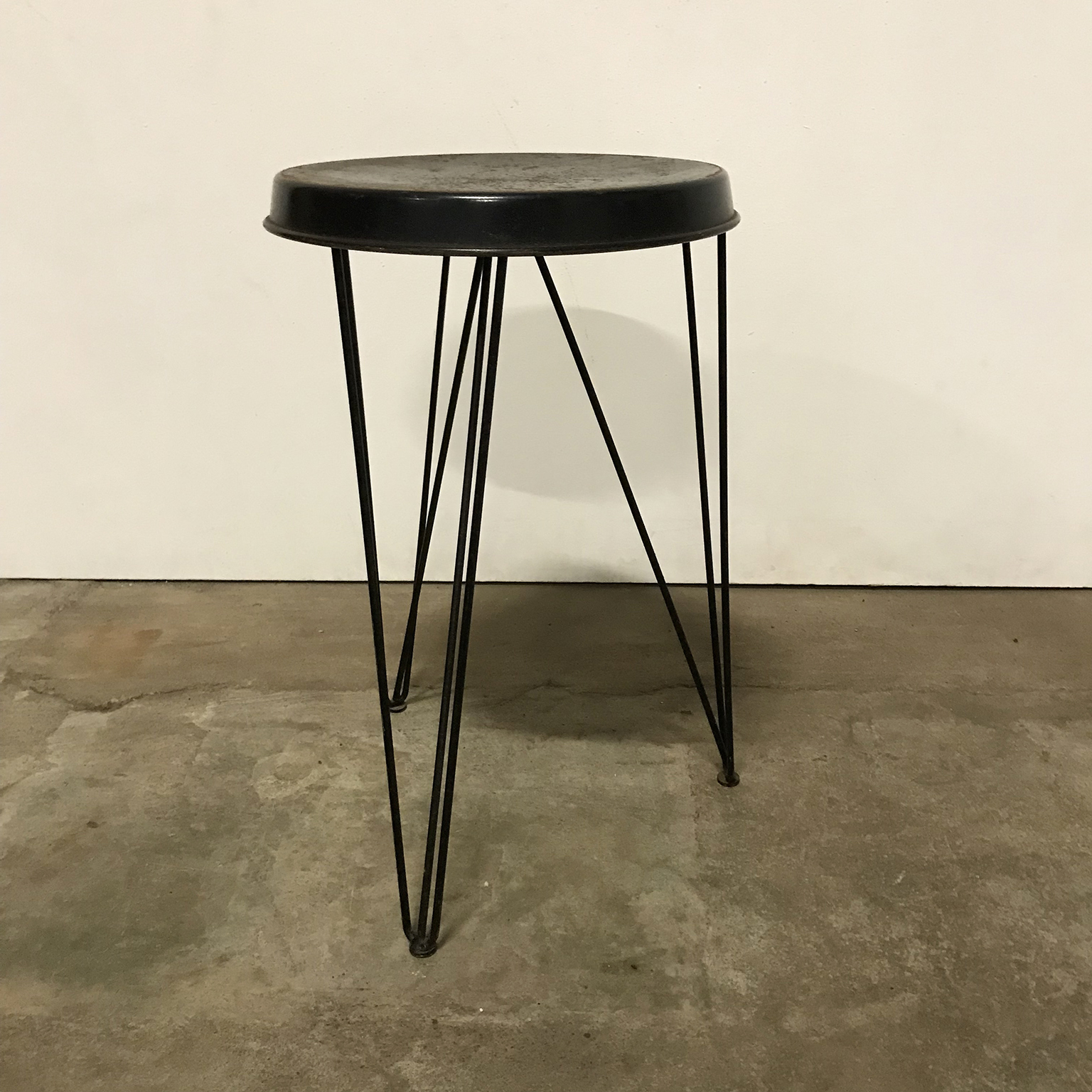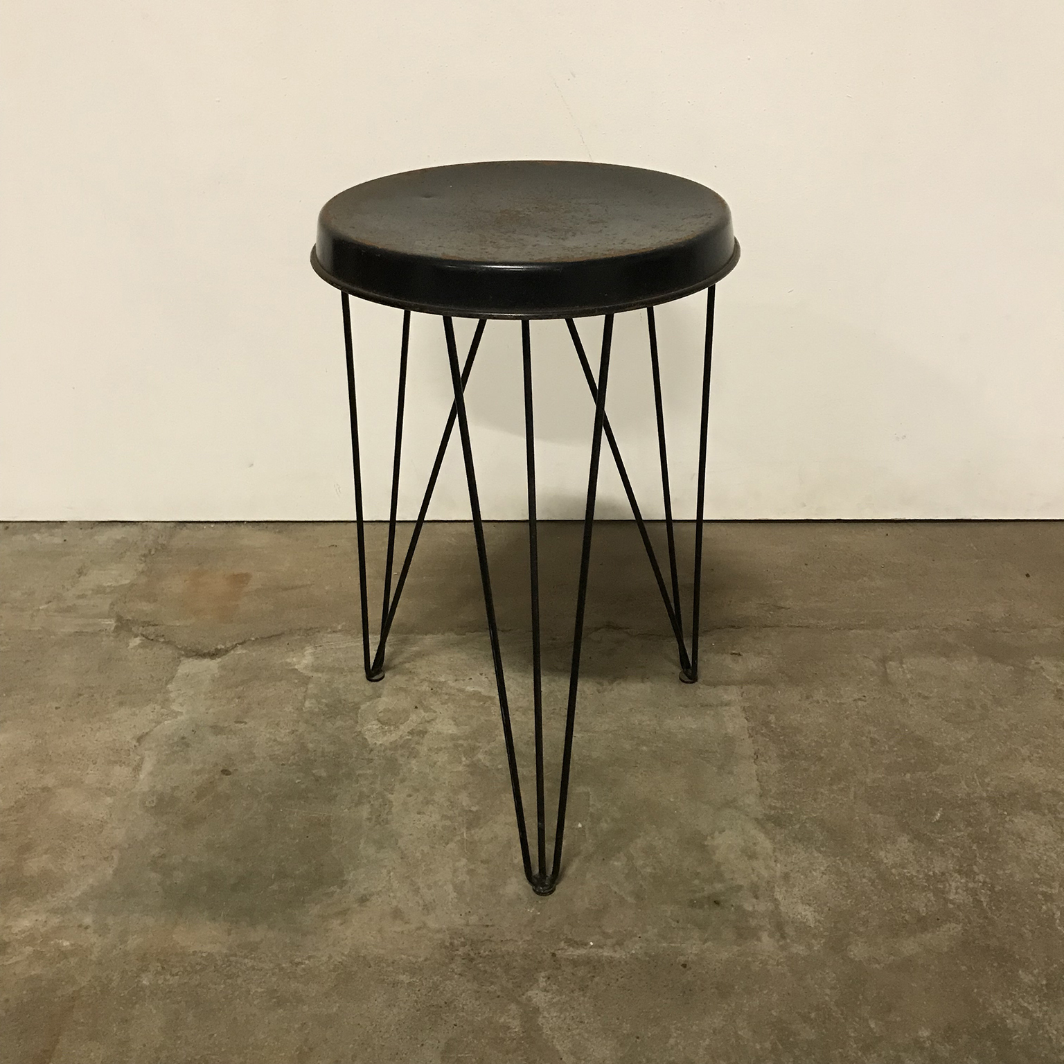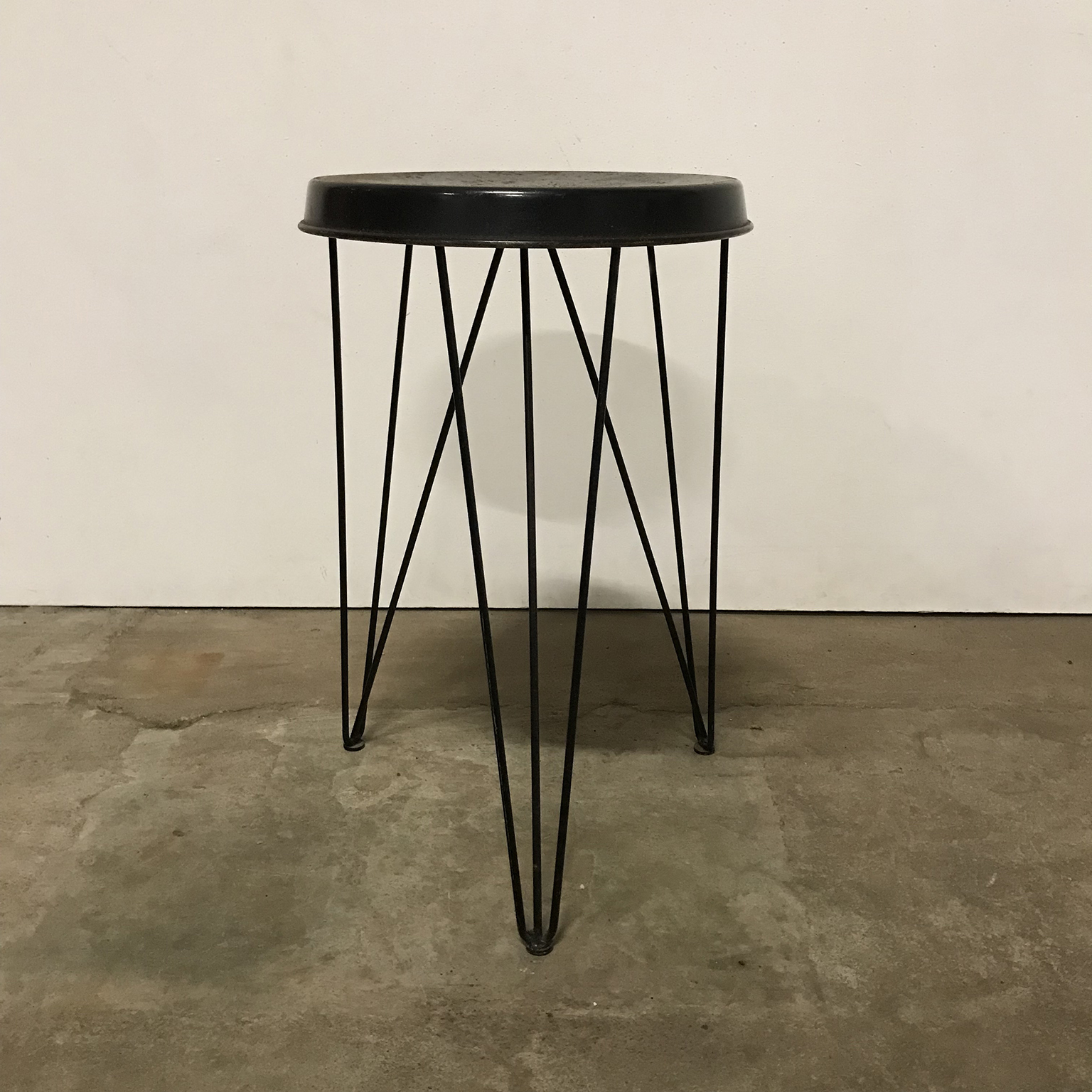 Pilastro, Tjerk Reijenga vintage sixties stool in black. Sculptural metal wire base and plate metal seat. Designed in 1966 by Tjerk Reijenga for Pilastro, Zwanenburg – Holland. Tjerk Reijenga was the leading designer of the Pilastro collection from the 1950s and 1960s. Well known for his colorful minimal metal designs of shelves and coat racks.