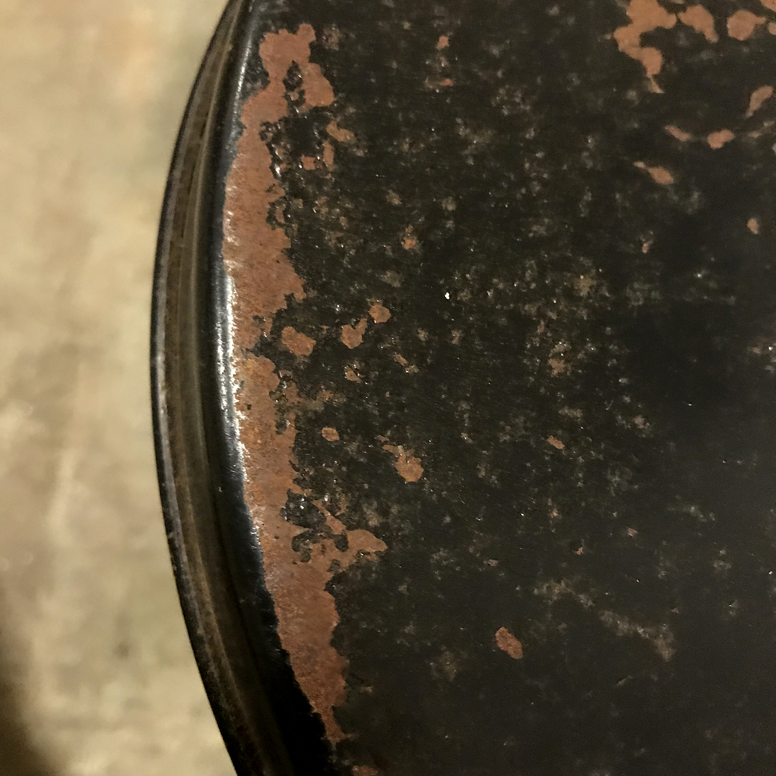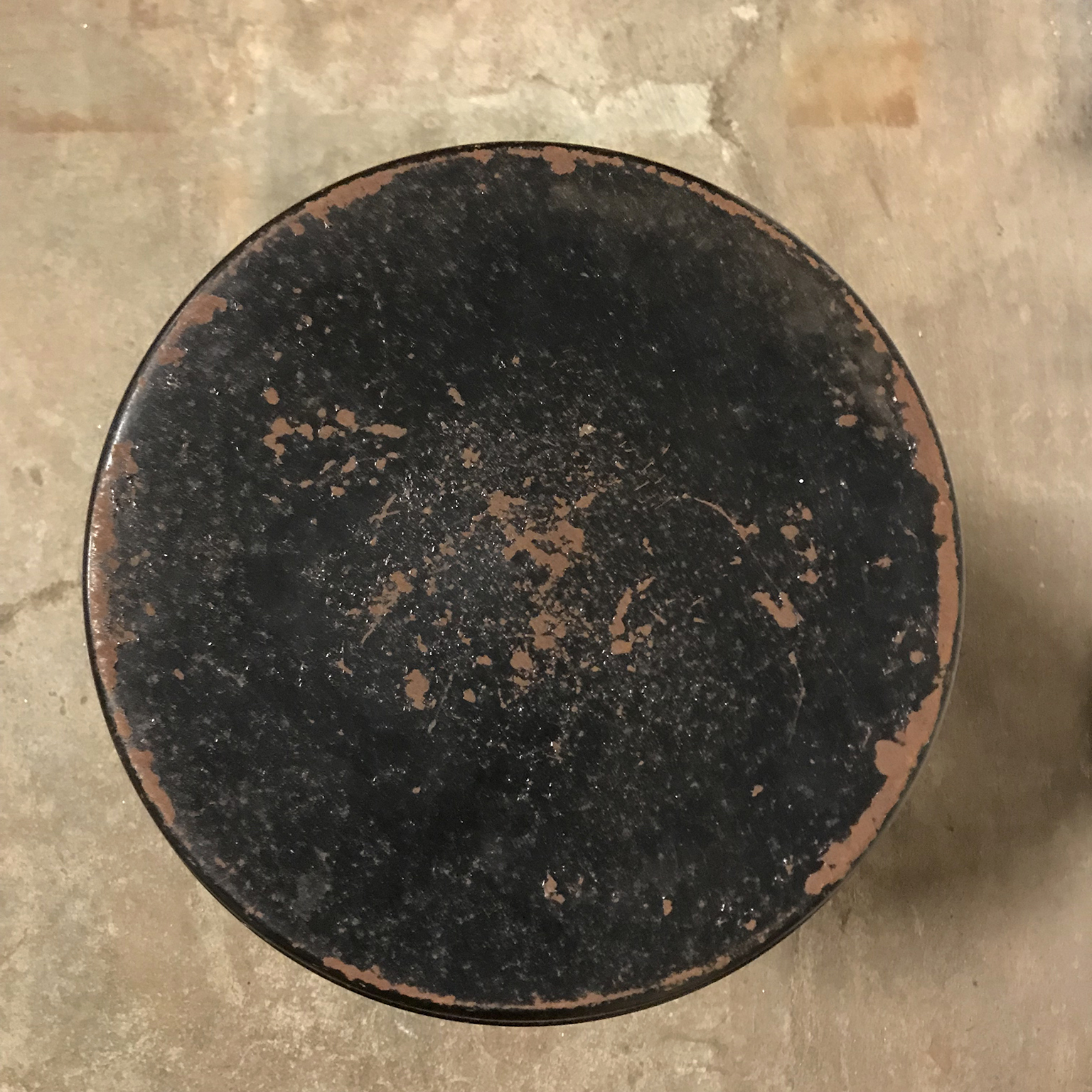 Sidetabel or stool in black metal shows traces of wear at the top; loss of paint and some rusty stains. The side table/stool gained character by it over the years.