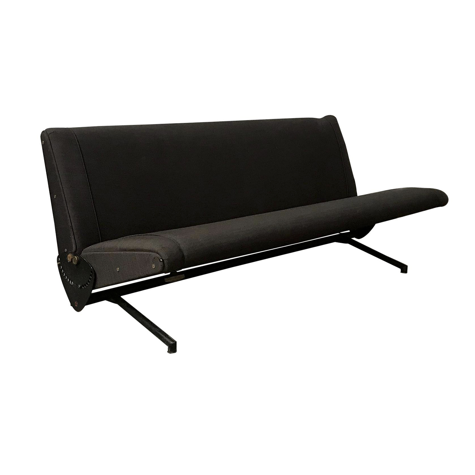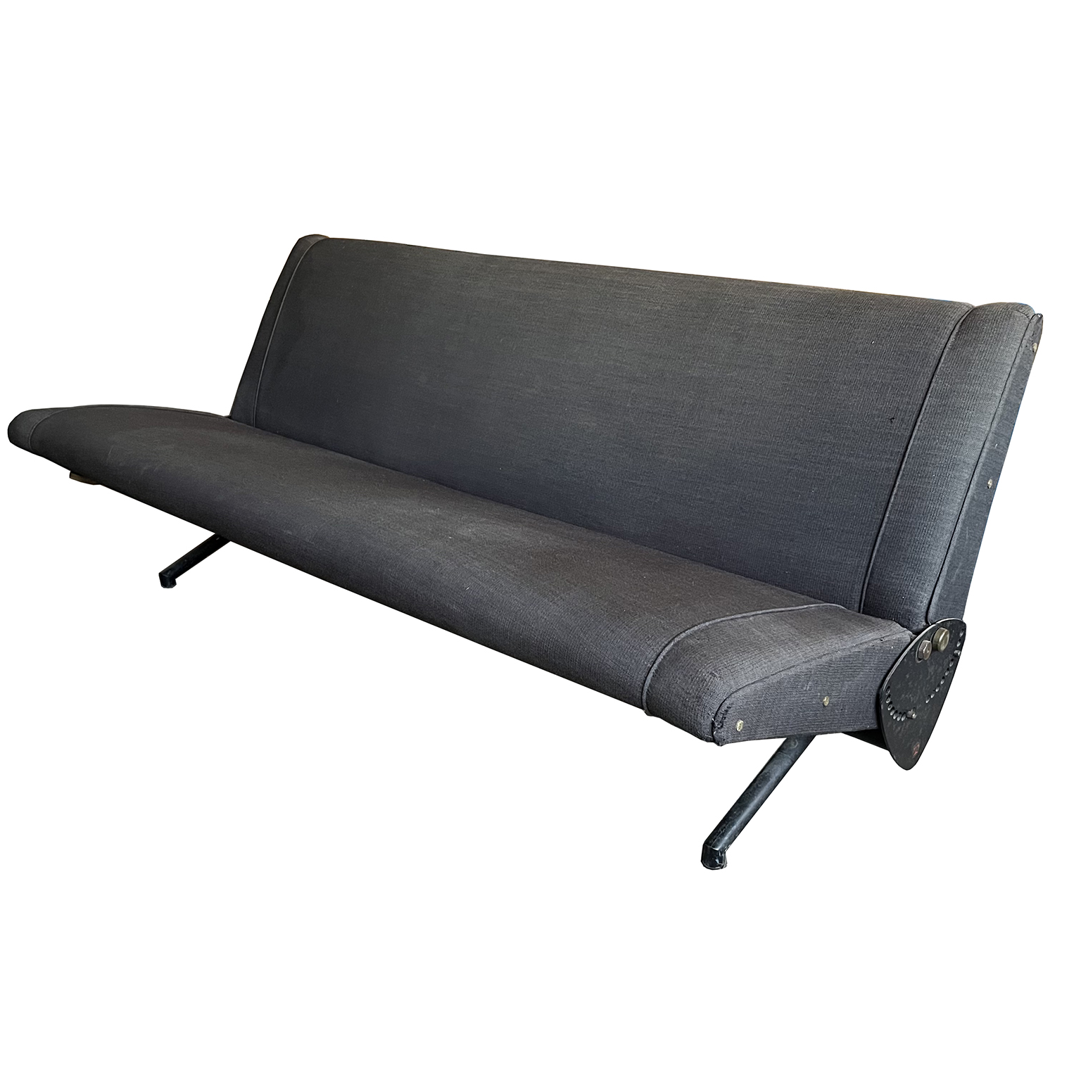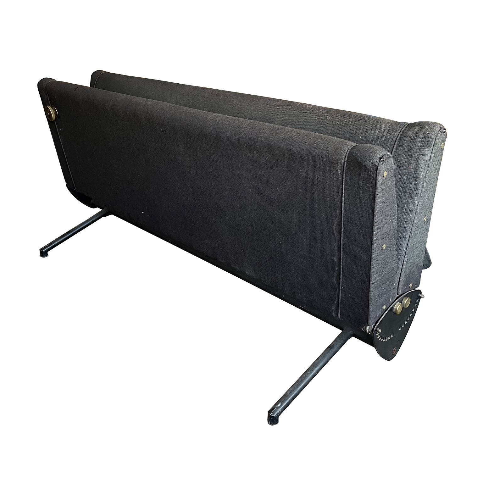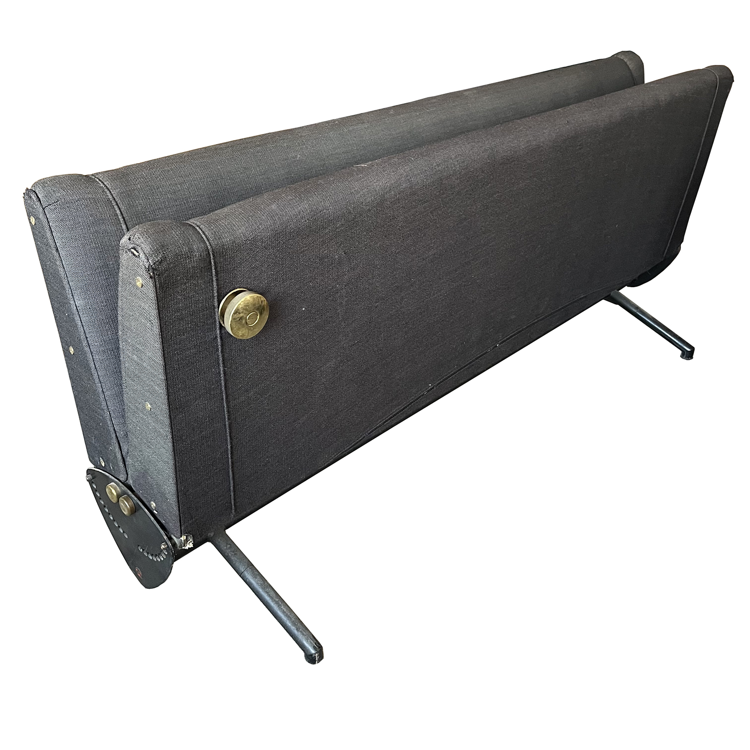 Tecno sofa D70 in brown upholstery and black base. Many position combinations of the back and seat are possible, because the back and seat can be adjusted separately including lying horizontally as a (day) bed or ‘folded’ to store away. The fabric upholstery shows traces of wear like some fading of colors, some damage and stains. The base is /the legs are missing some paint. One of the cupper caps is missing while some of the others have some scratches.