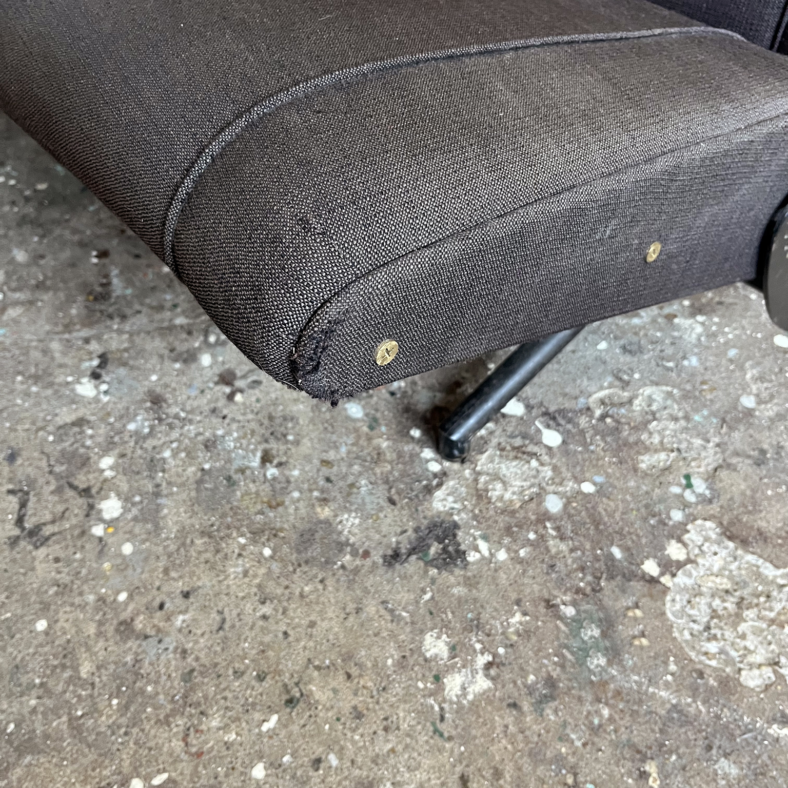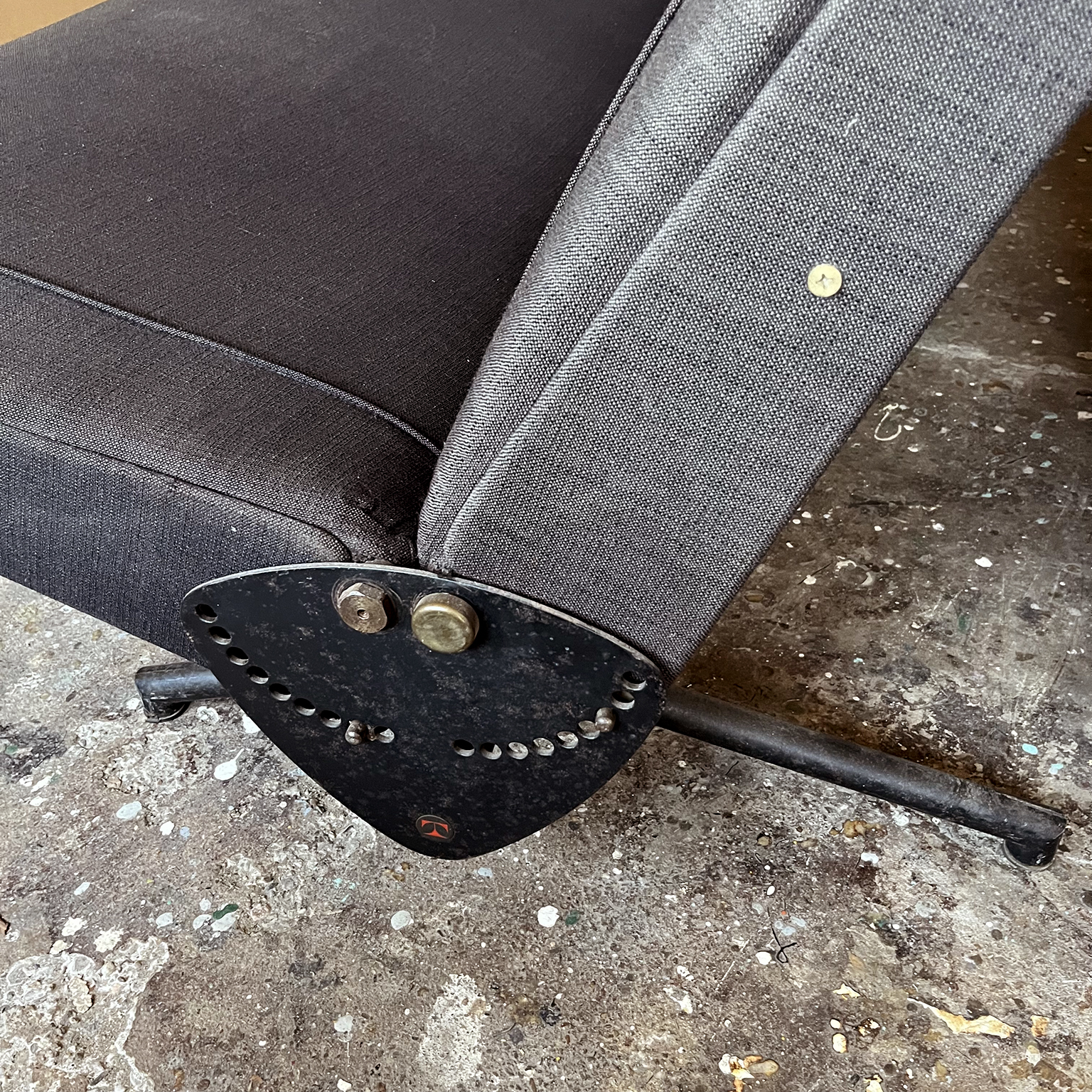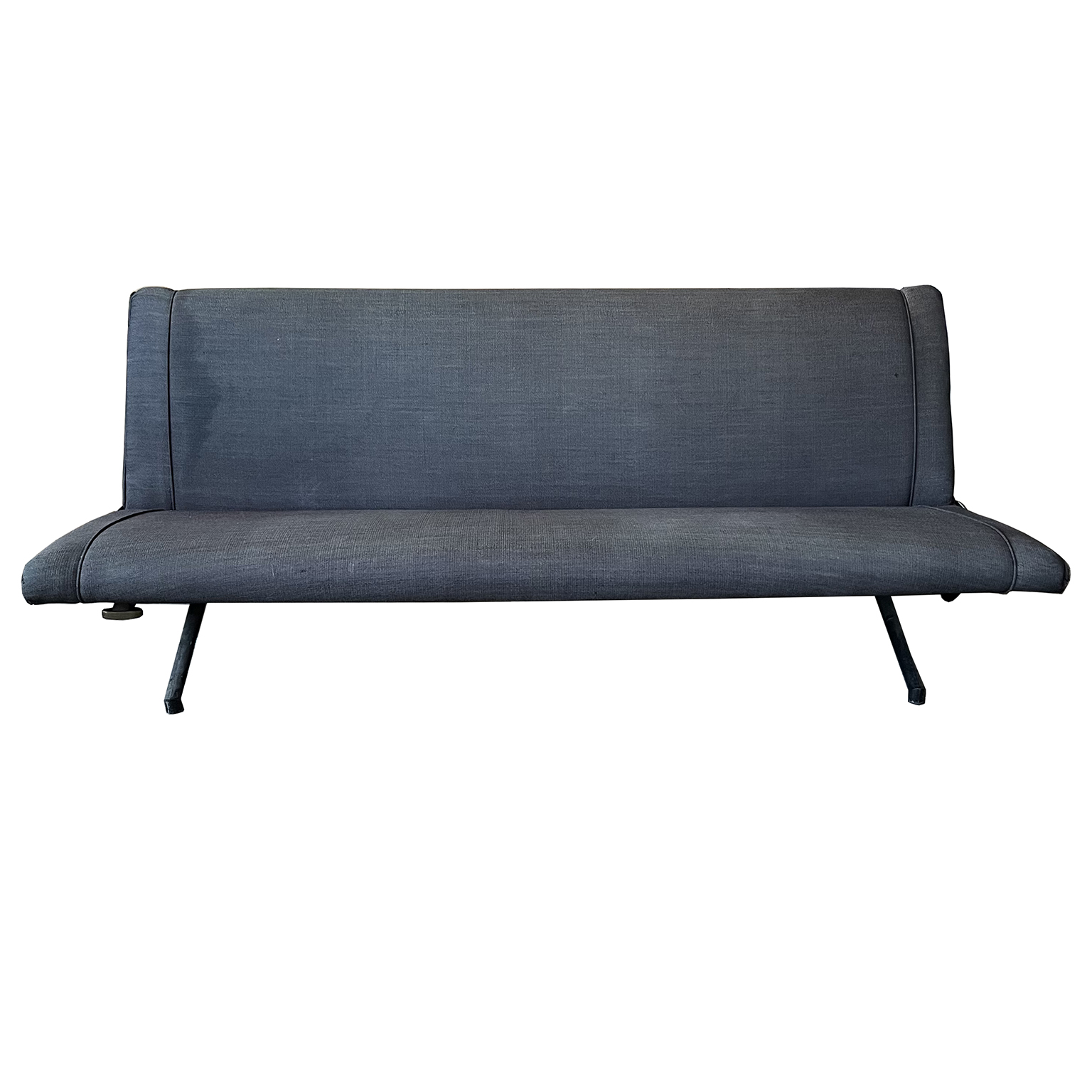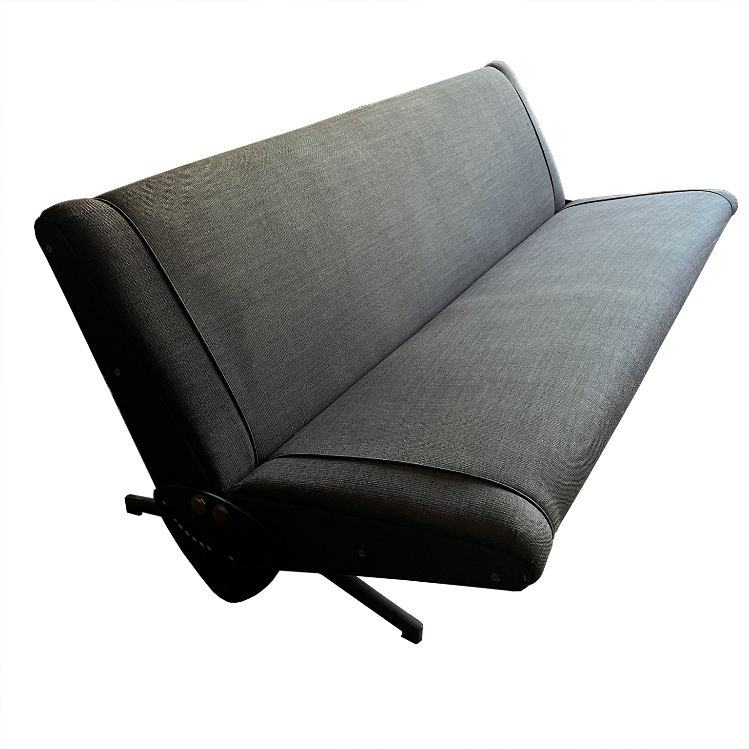 Tecno sofa D70 in brown upholstery and black base. Many position combinations of the back and seat are possible, because the back and seat can be adjusted separately including lying horizontally as a (day) bed or ‘folded’ to store away. The fabric upholstery shows traces of wear like some fading of colors, some damage and stains. The base is /the legs are missing some paint. One of the cupper caps is missing while some of the others have some scratches.