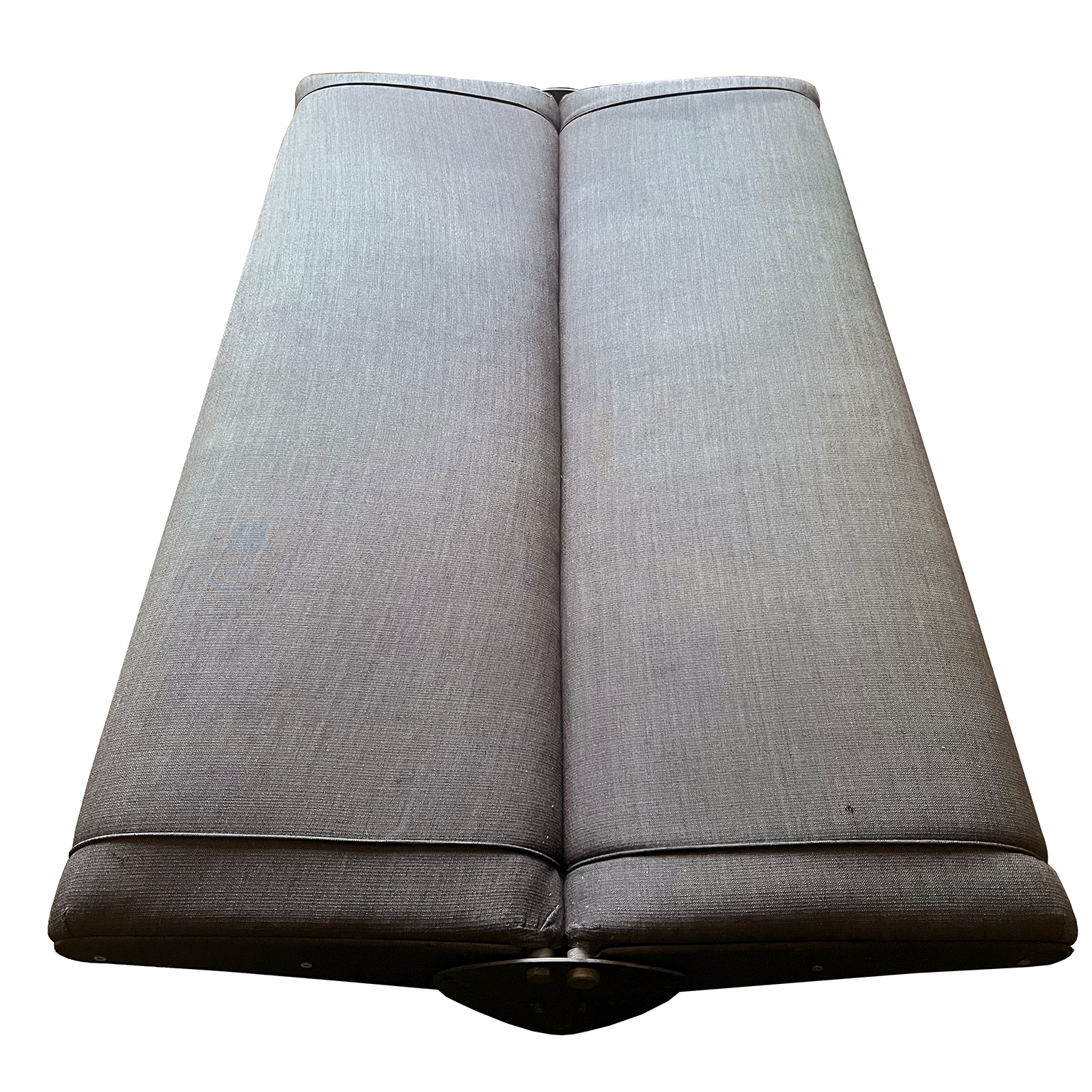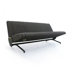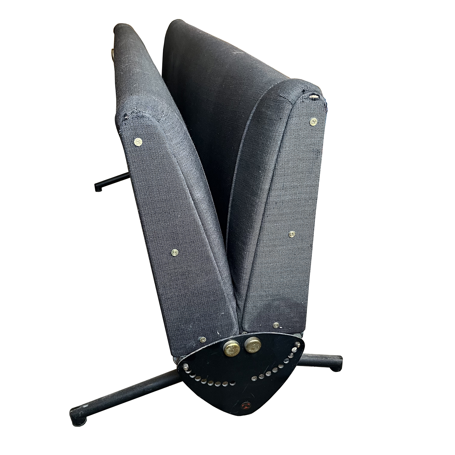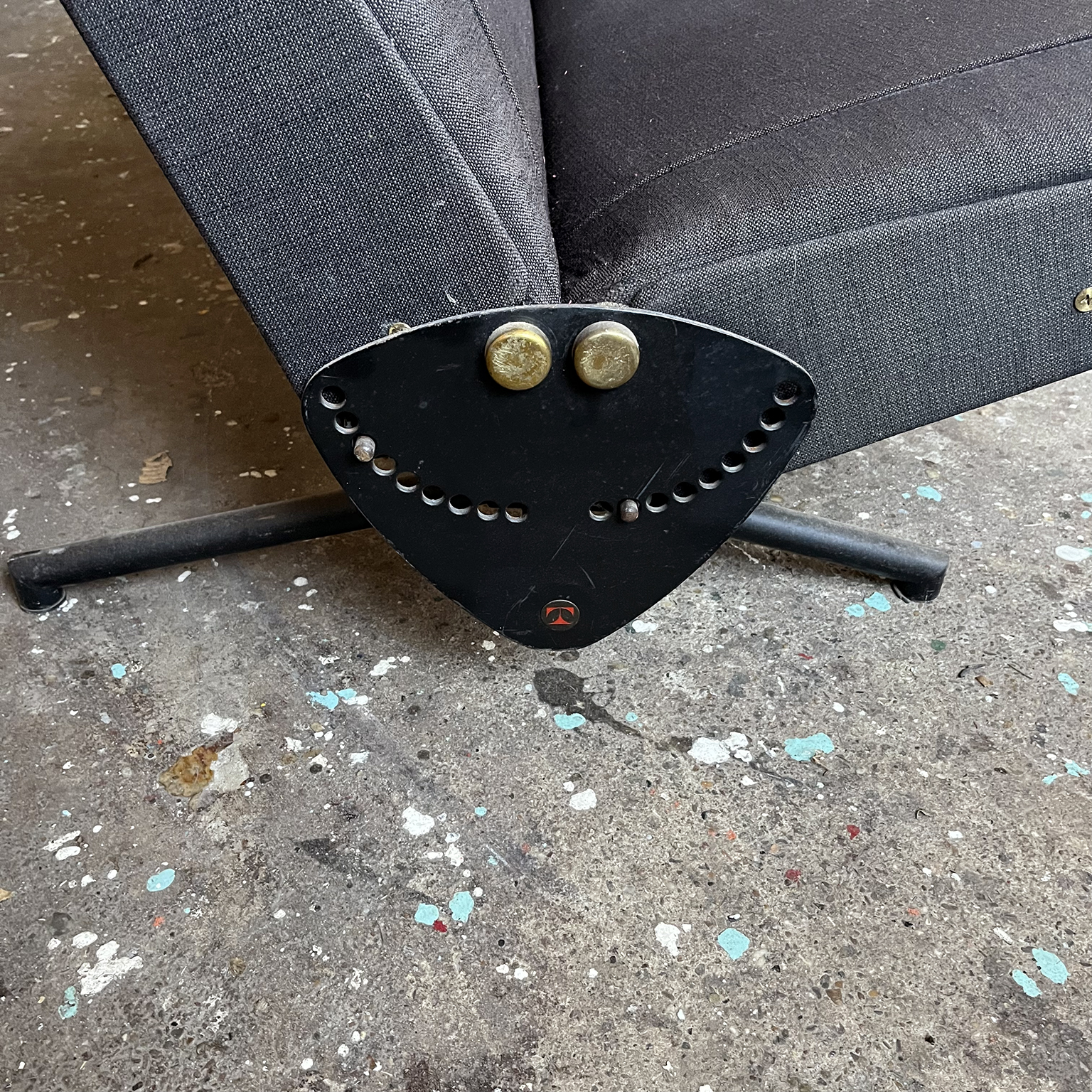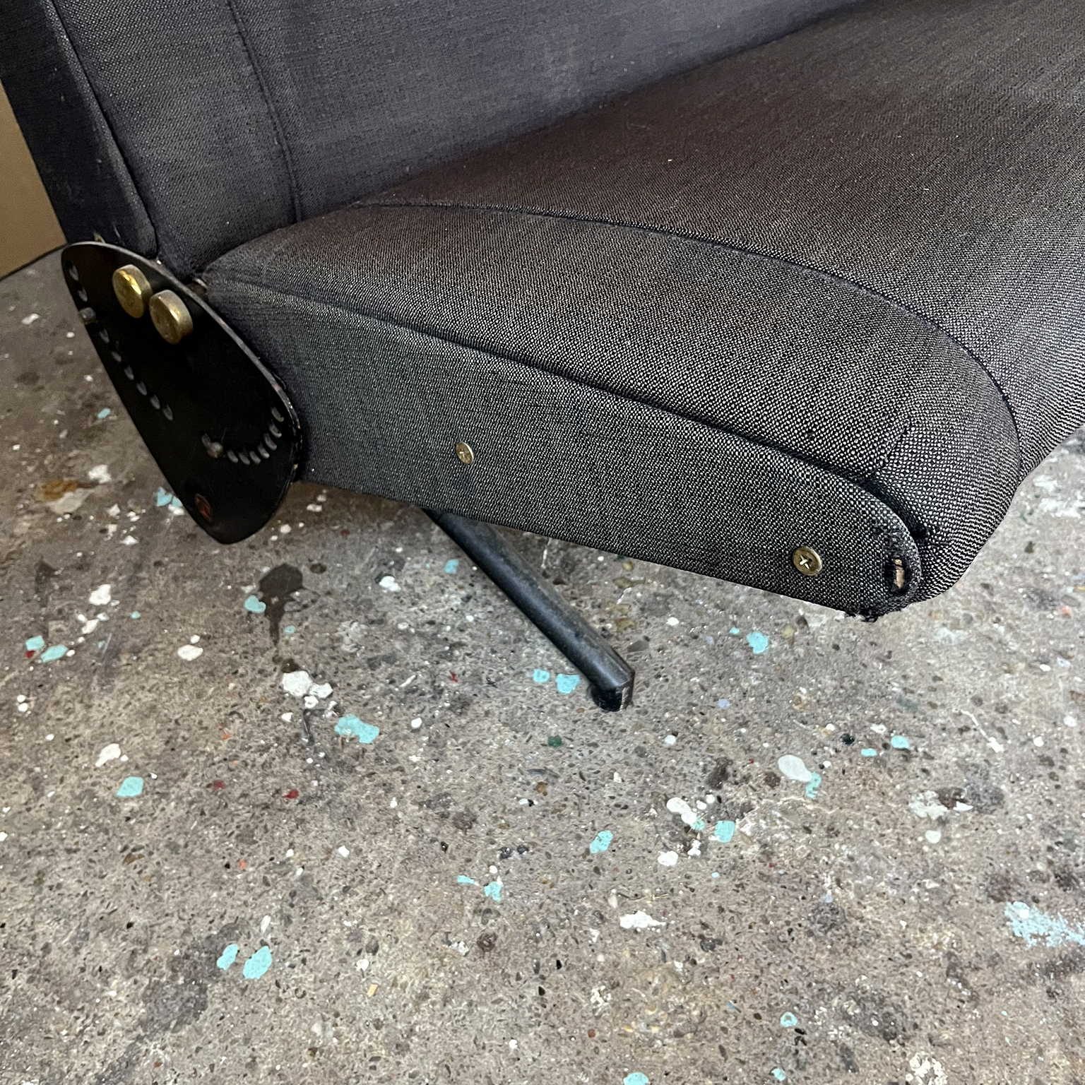 Tecno sofa D70 in brown upholstery and black base. Many position combinations of the back and seat are possible, because the back and seat can be adjusted separately including lying horizontally as a (day) bed or ‘folded’ to store away. The fabric upholstery shows traces of wear like some fading of colors, some damage and stains. The base is /the legs are missing some paint. One of the cupper caps is missing while some of the others have some scratches.