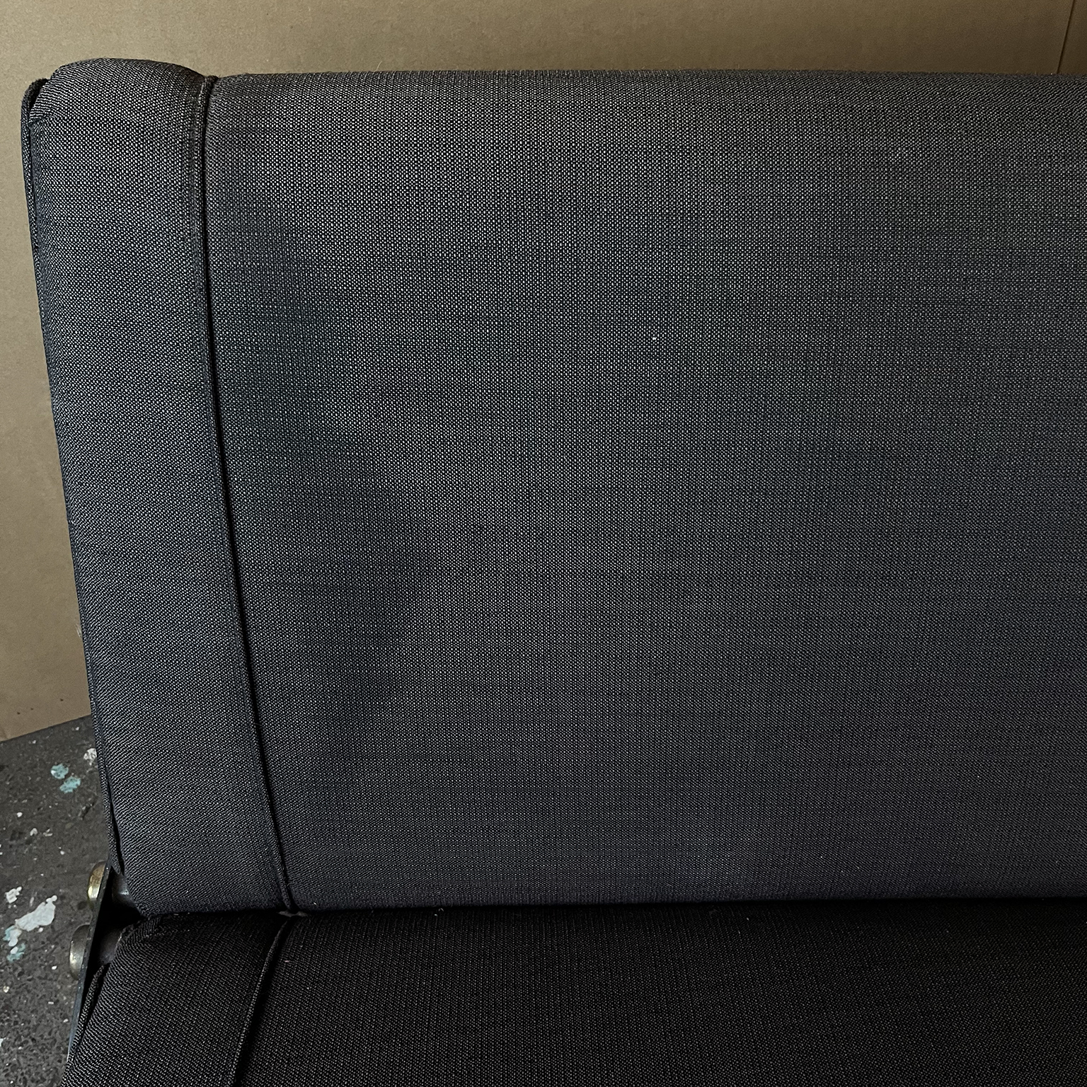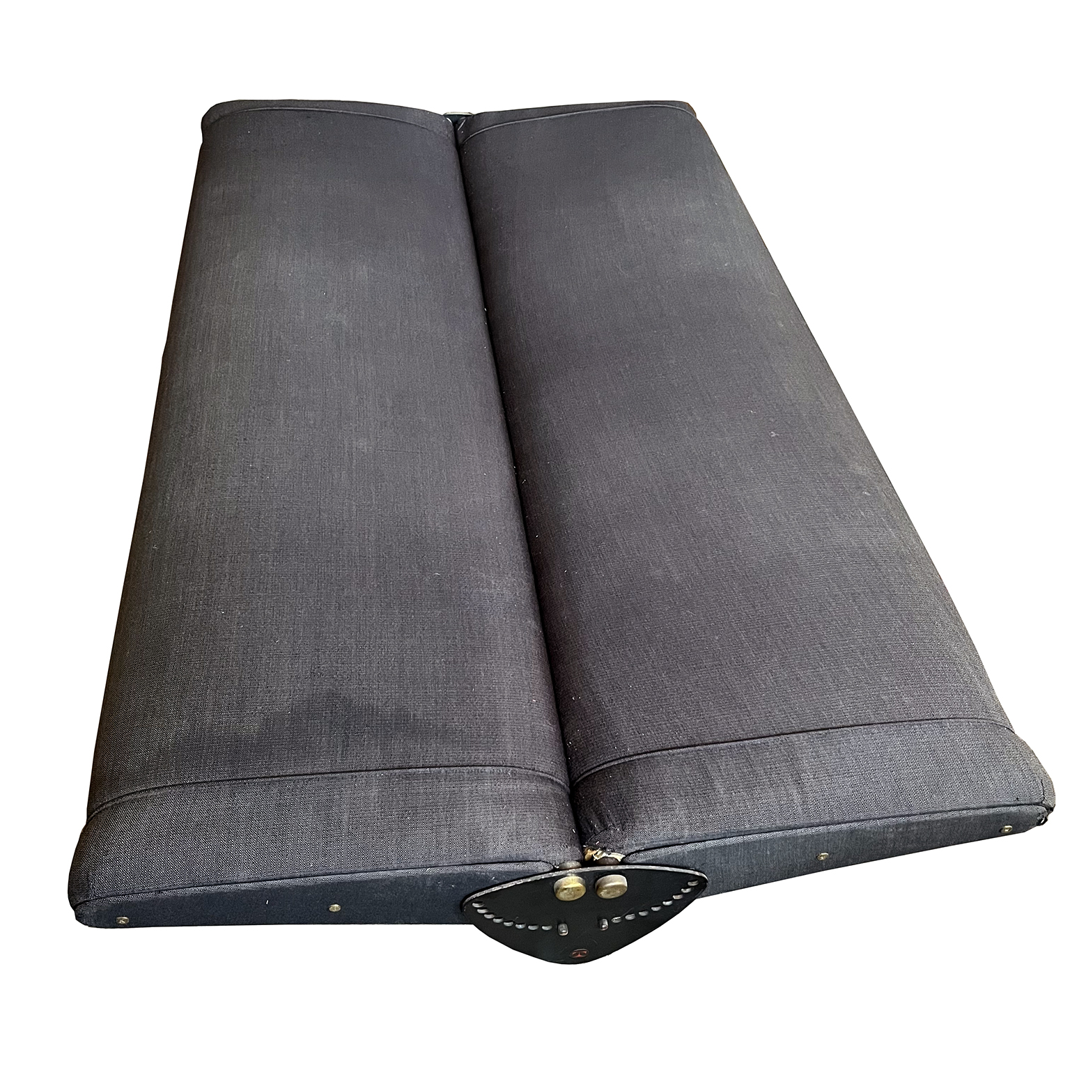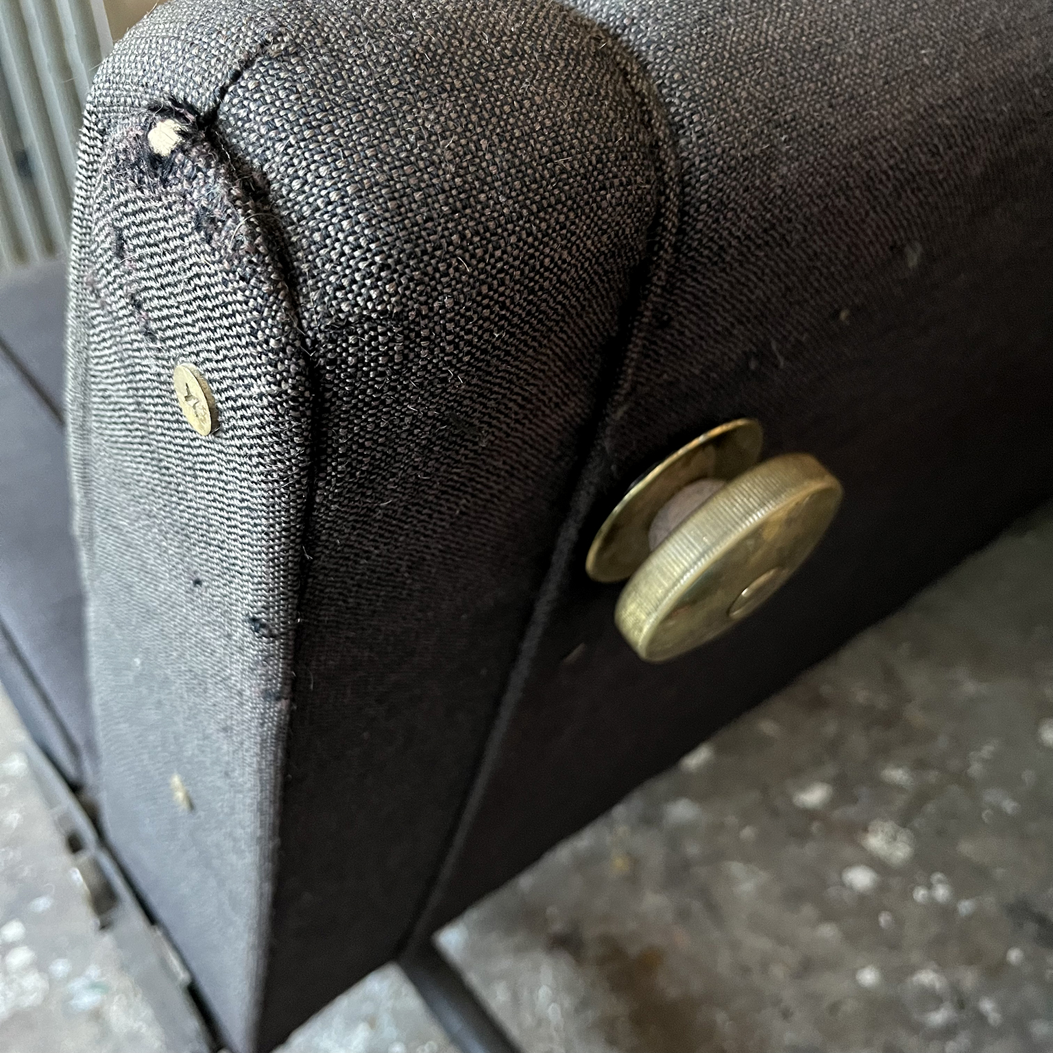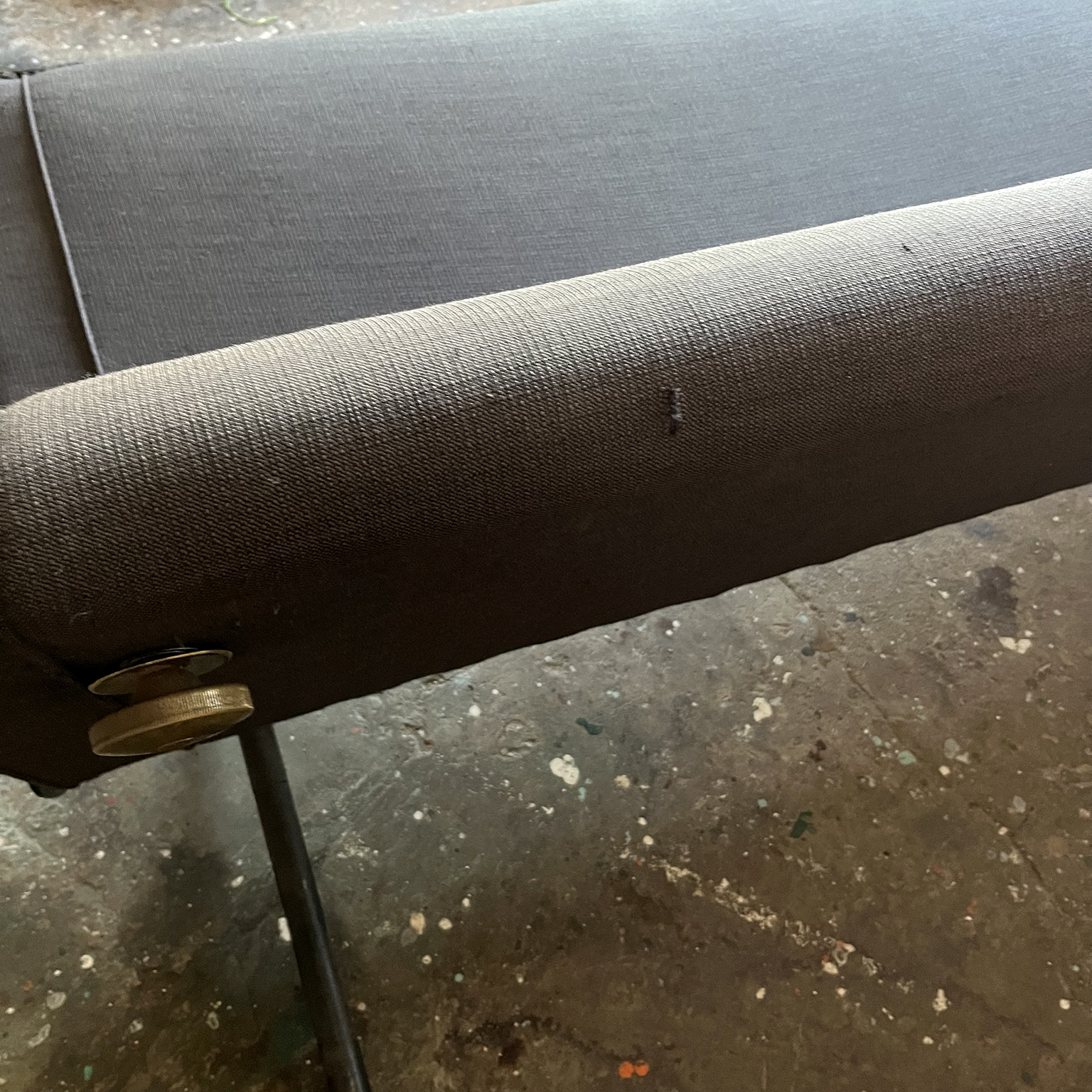 Tecno sofa D70 in brown upholstery and black base. Many position combinations of the back and seat are possible, because the back and seat can be adjusted separately including lying horizontally as a (day) bed or ‘folded’ to store away. The fabric upholstery shows traces of wear like some fading of colors, some damage and stains. The base is /the legs are missing some paint. One of the cupper caps is missing while some of the others have some scratches.