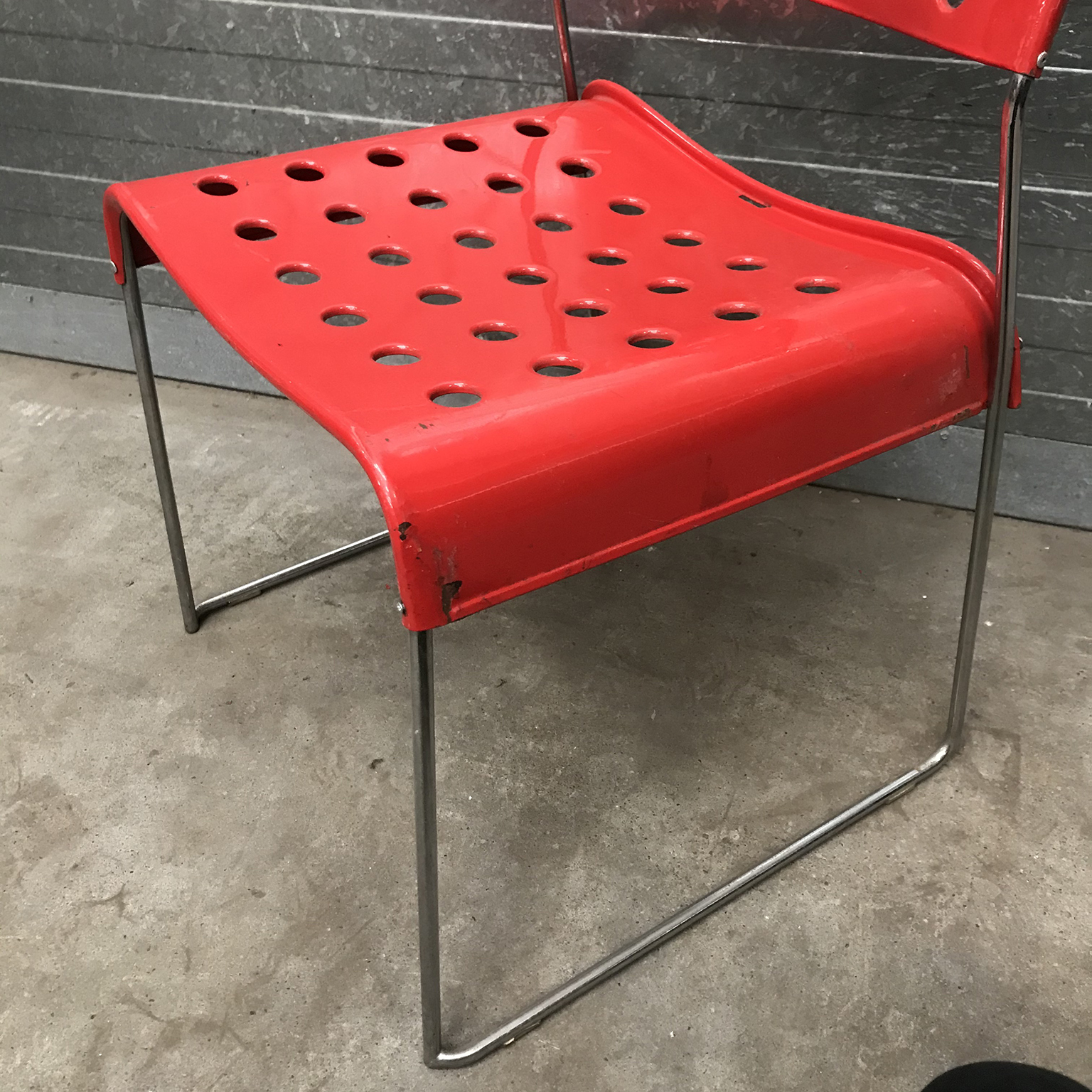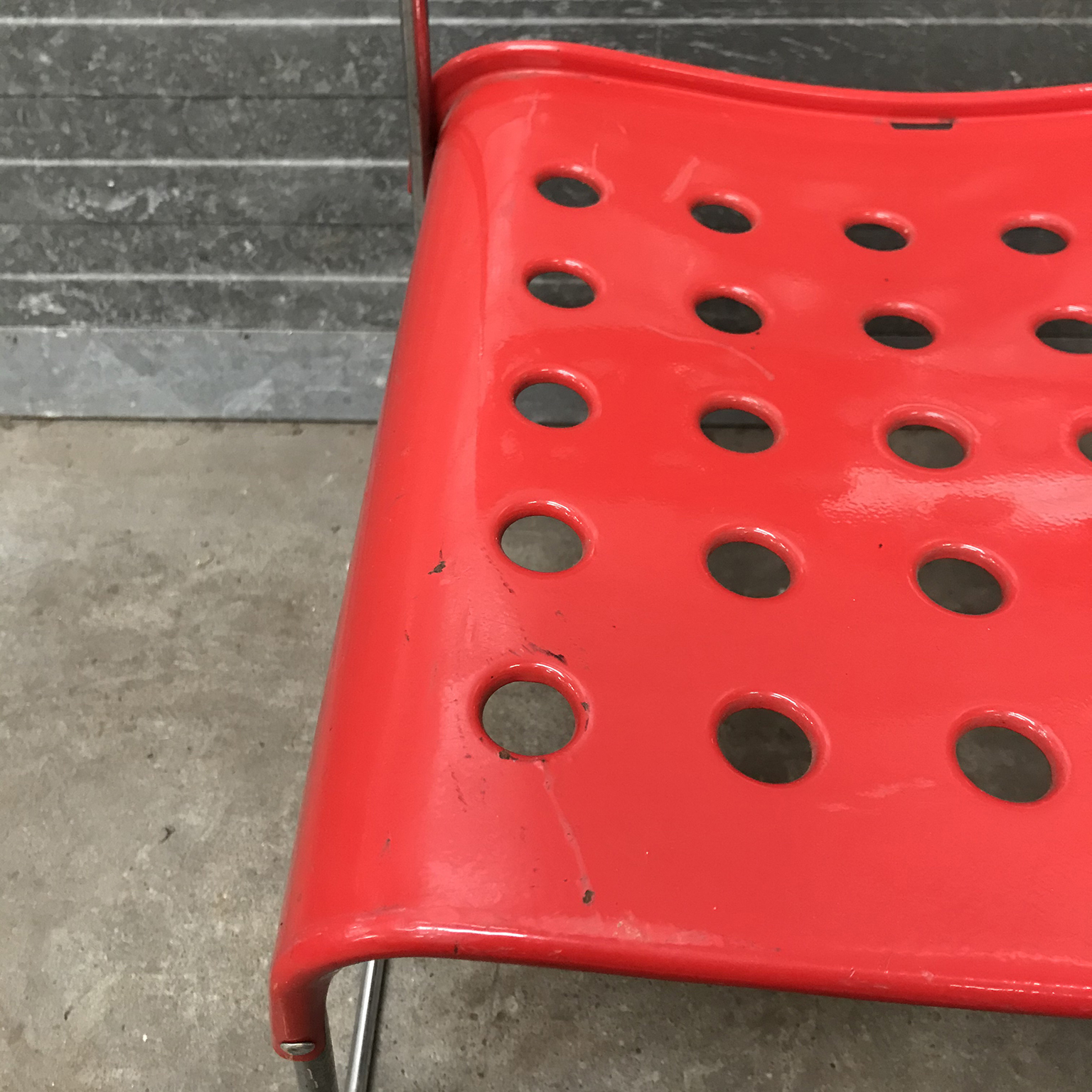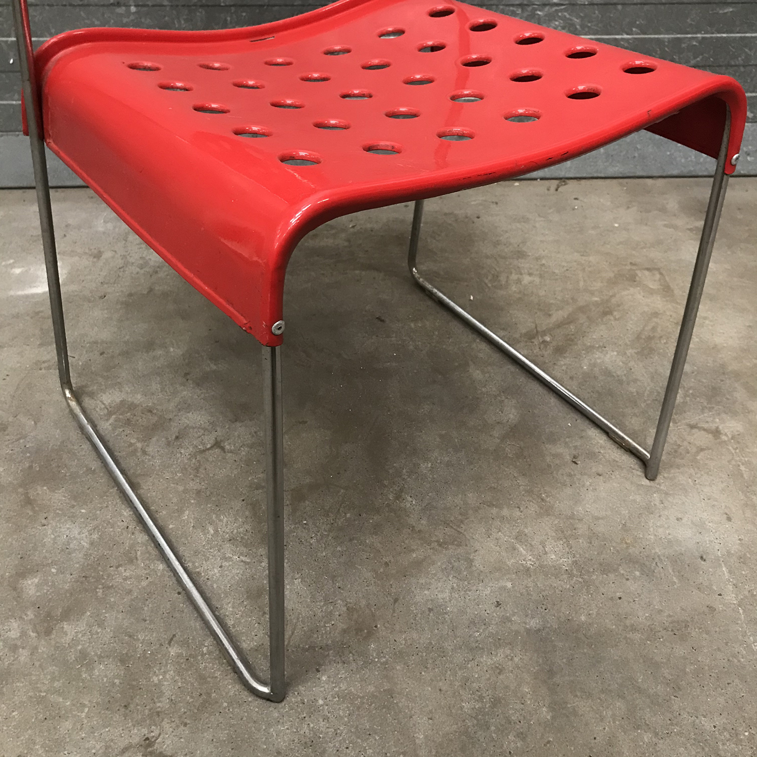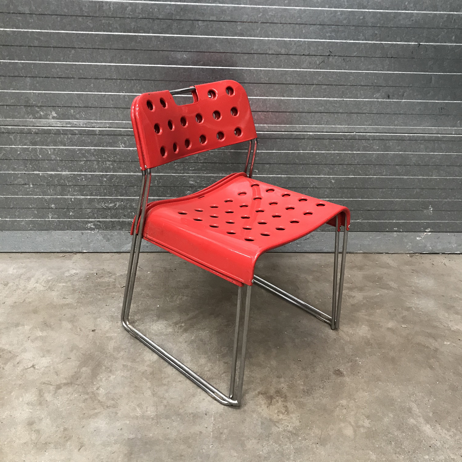 Two red Omstak by Rodney Kinsman for Bieffeplast. These two Omstak in vibrant red are beautiful but show some traces of wear like some loss of red ( see details on pictures) and underneath that loss, shows some rust. The chairs also show some scratches (#16 and #17) and some rusty spots on the legs. The chairs are stackable (#20). Also other opstak are listed, like black, Yellow and white.
