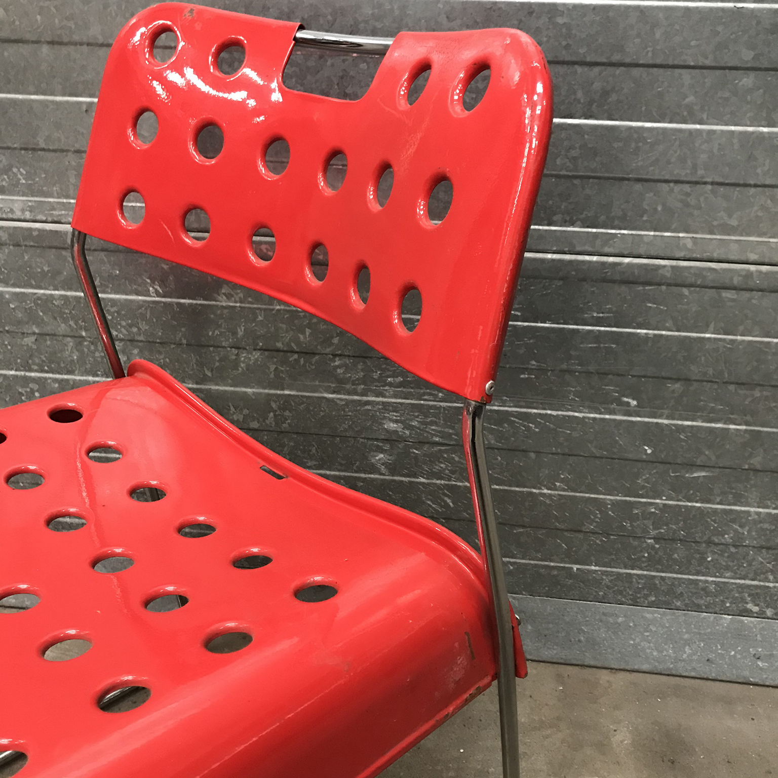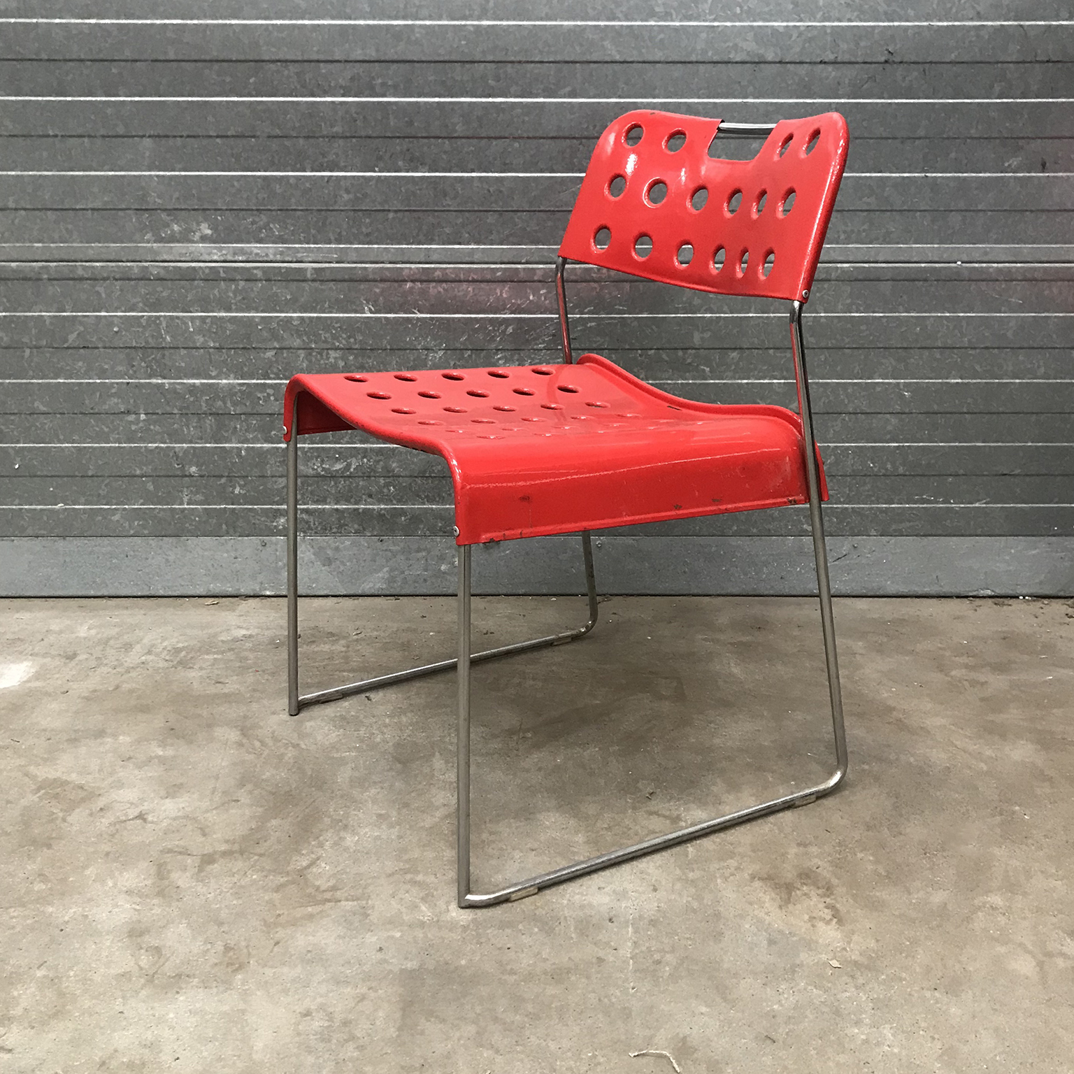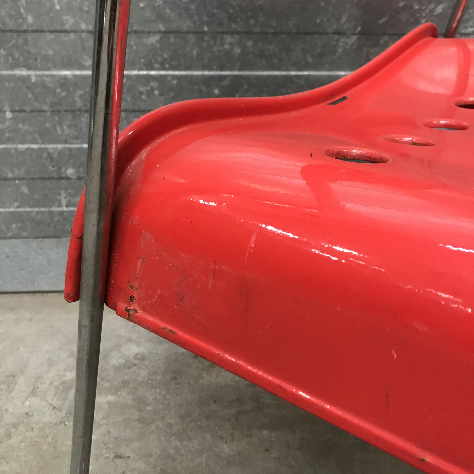 Two red Omstak by Rodney Kinsman for Bieffeplast. These two Omstak in vibrant red are beautiful but show some traces of wear like some loss of red ( see details on pictures) and underneath that loss, shows some rust. The chairs also show some scratches (#16 and #17) and some rusty spots on the legs. The chairs are stackable (#20). Also other opstak are listed, like black, Yellow and white.