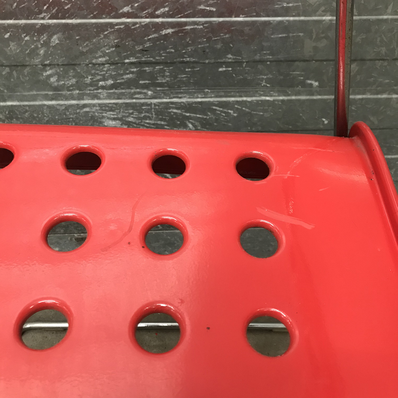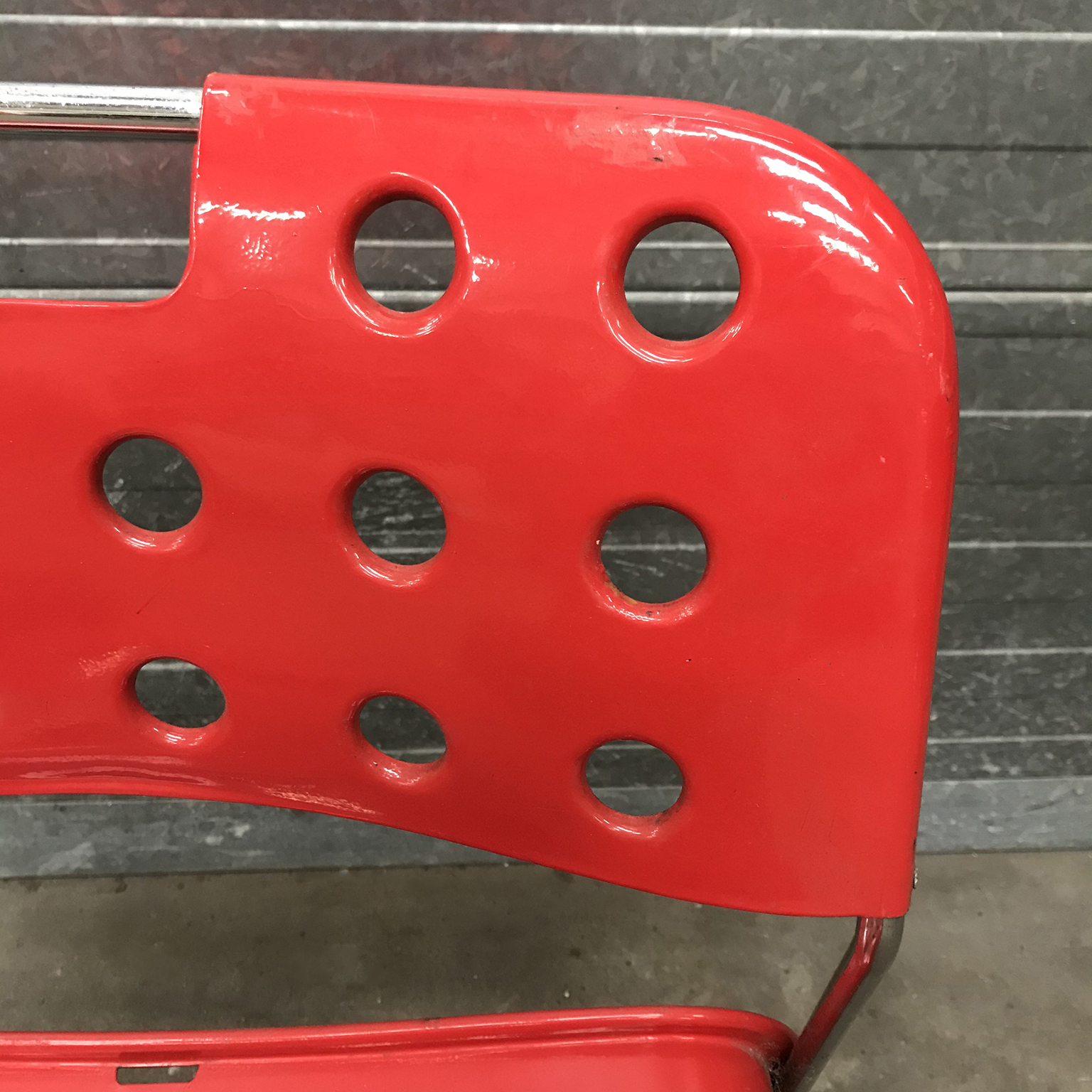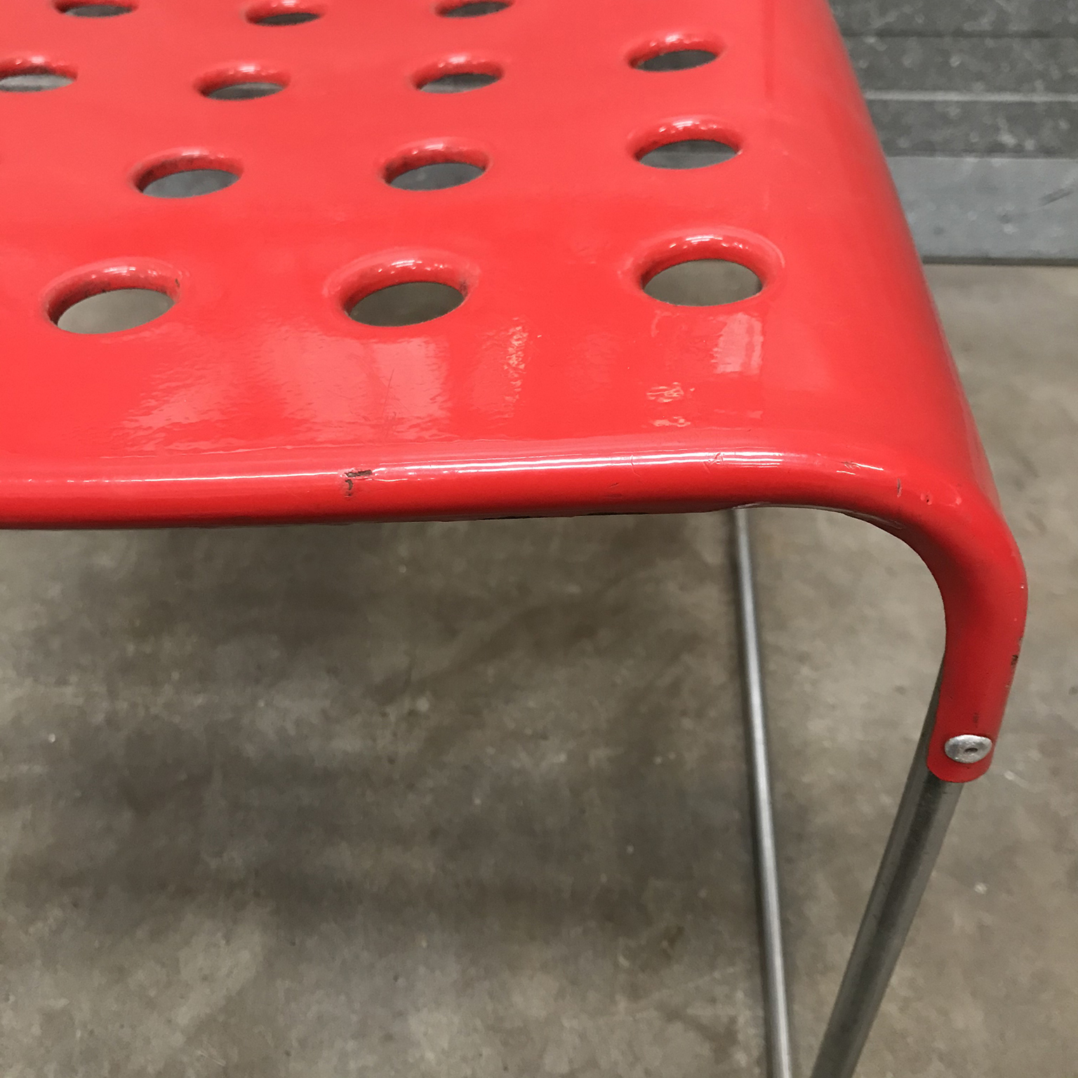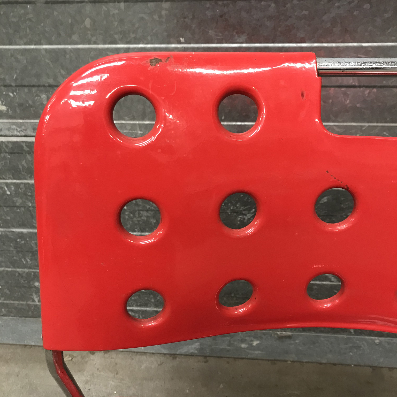 Two red Omstak by Rodney Kinsman for Bieffeplast. These two Omstak in vibrant red are beautiful but show some traces of wear like some loss of red ( see details on pictures) and underneath that loss, shows some rust. The chairs also show some scratches (#16 and #17) and some rusty spots on the legs. The chairs are stackable (#20). Also other opstak are listed, like black, Yellow and white.