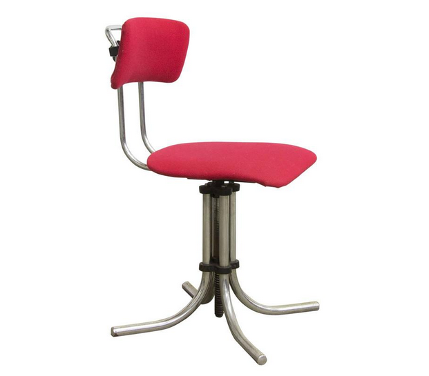 Adjustable, swivel office chair, some years ago re-upholstered in red fabric. Some little stains/wear on the seat. The base has some spots.