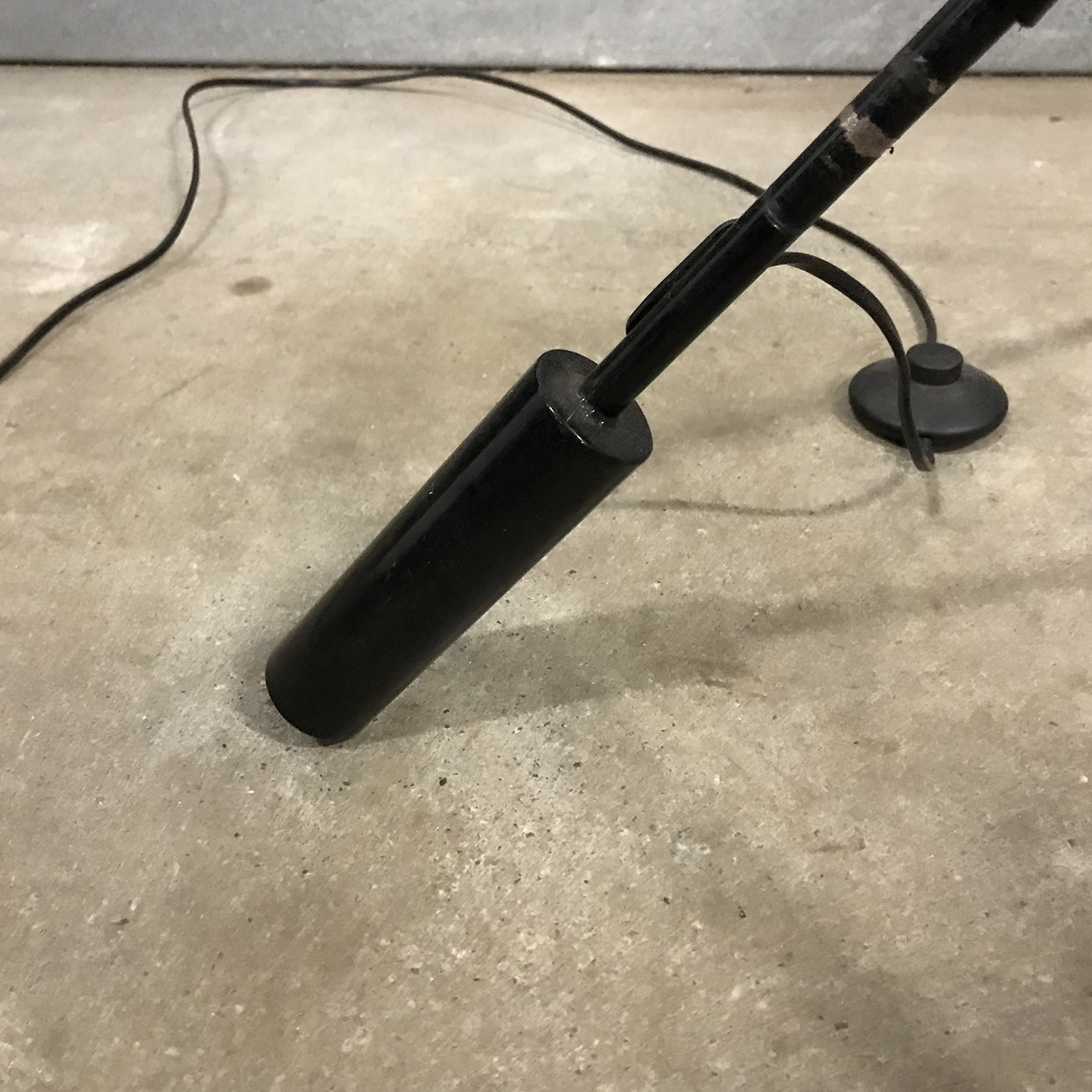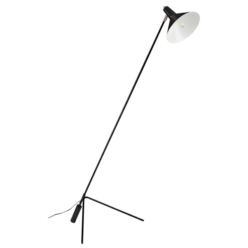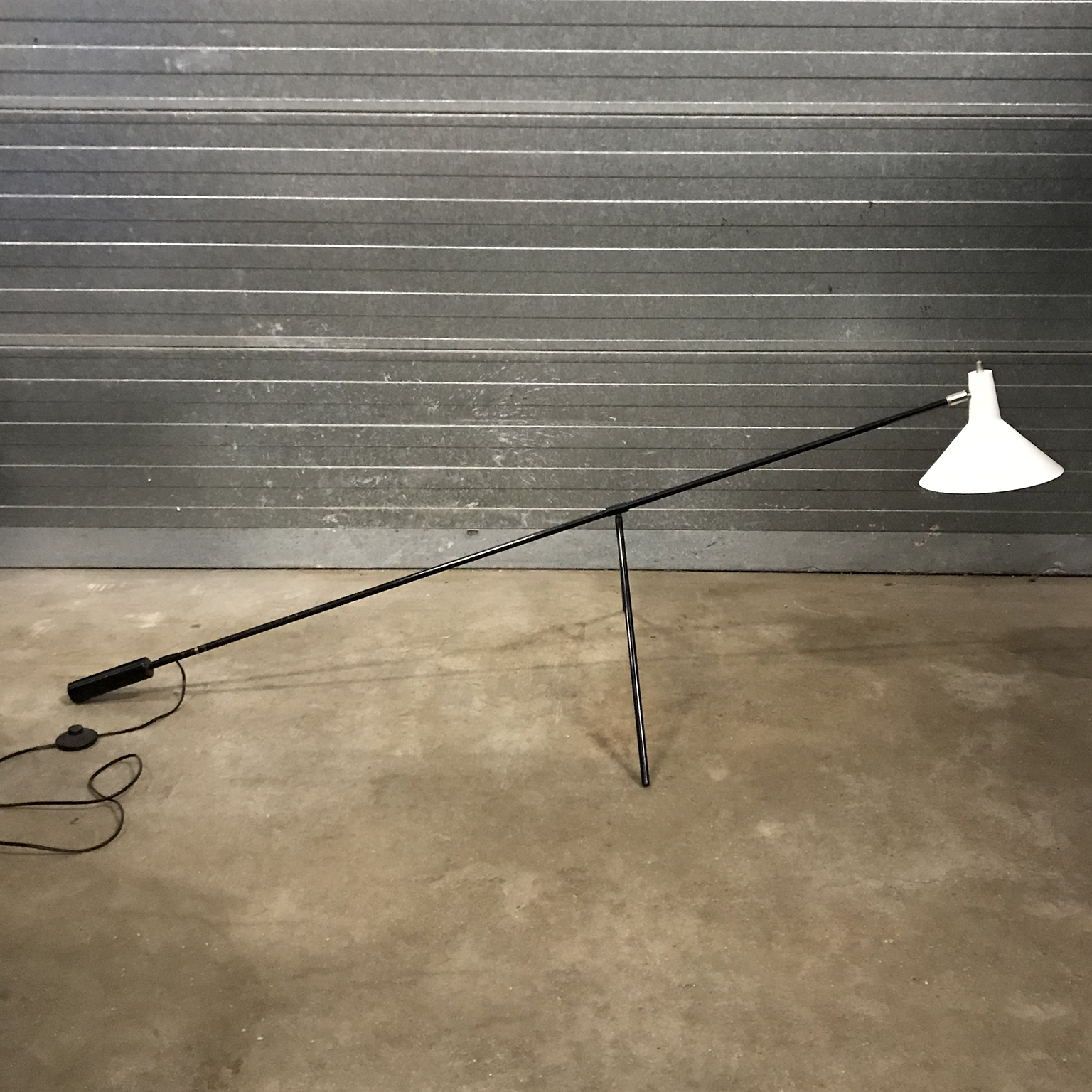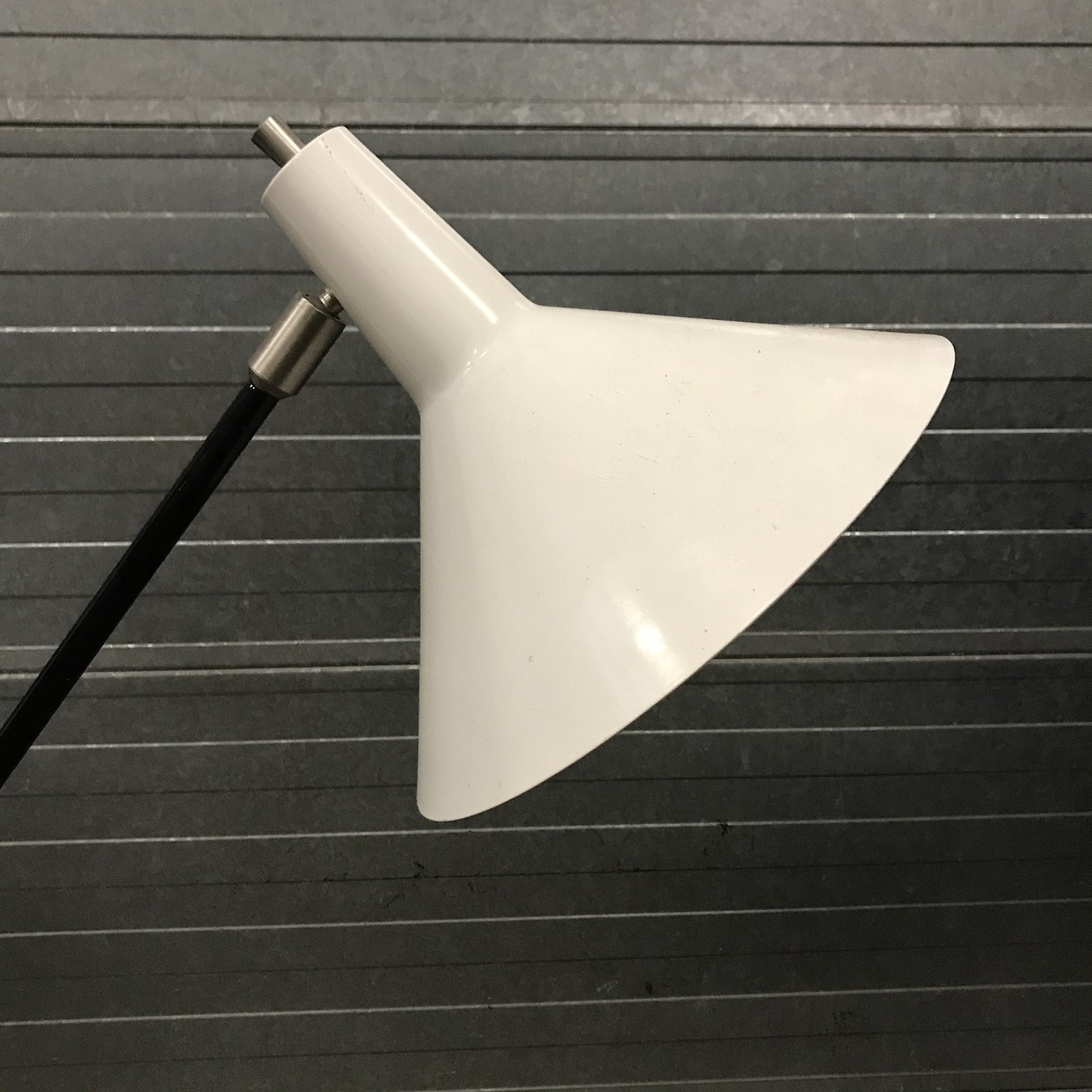 Adjustable Floor lamp with white shade and black base with unique possibilities of changing position and form. The shade can also be positioned in other angles. The lamp shows some traces of light wear, like some spots with some loss of black paint of the base.  Cable 2 meter.
